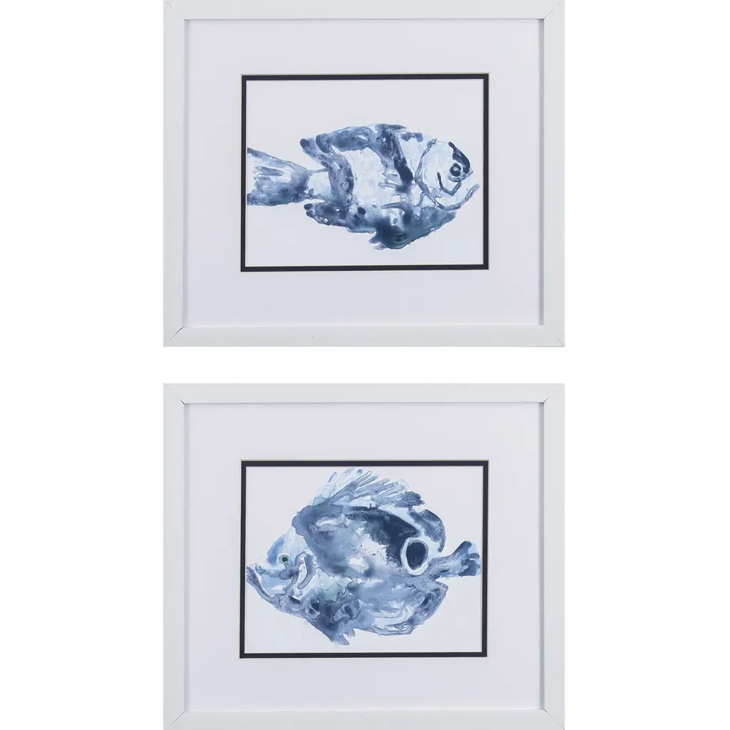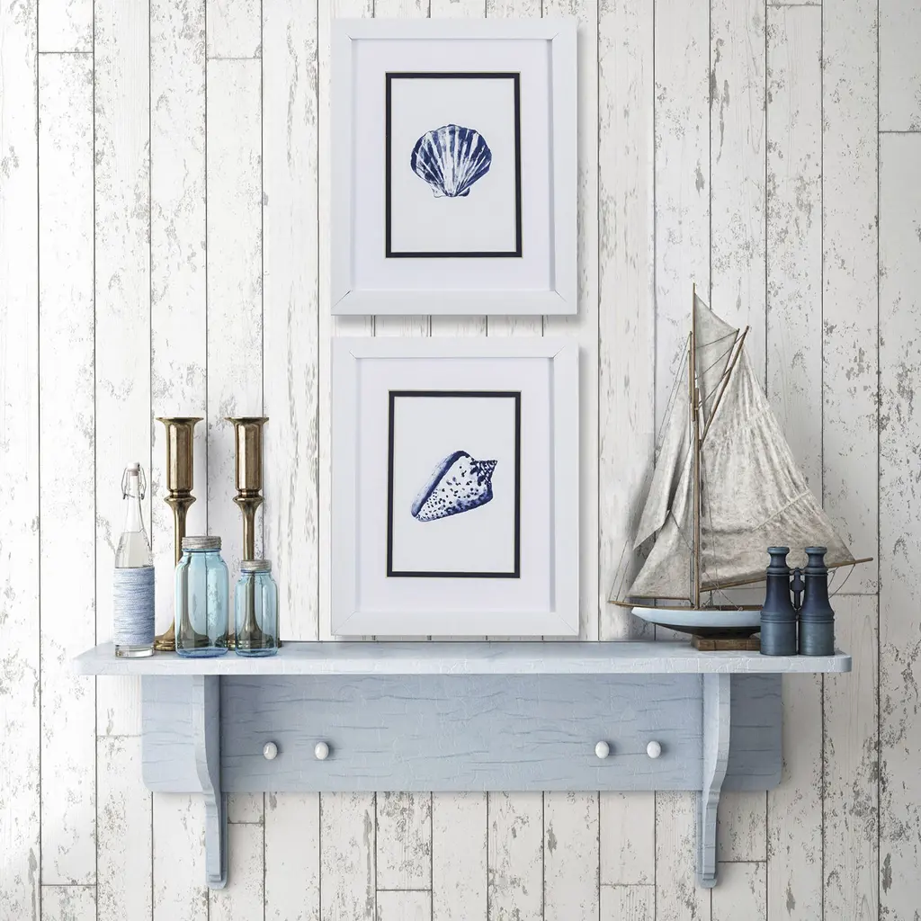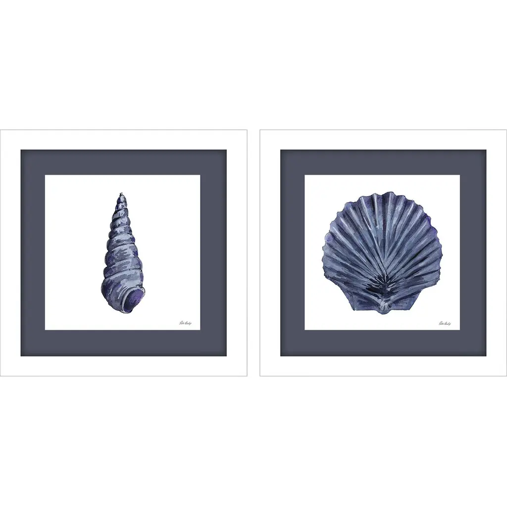 Ocean treasures in coastal blue and white are double matted in white and navy blue. The set is framed in a modern flat white moulding.