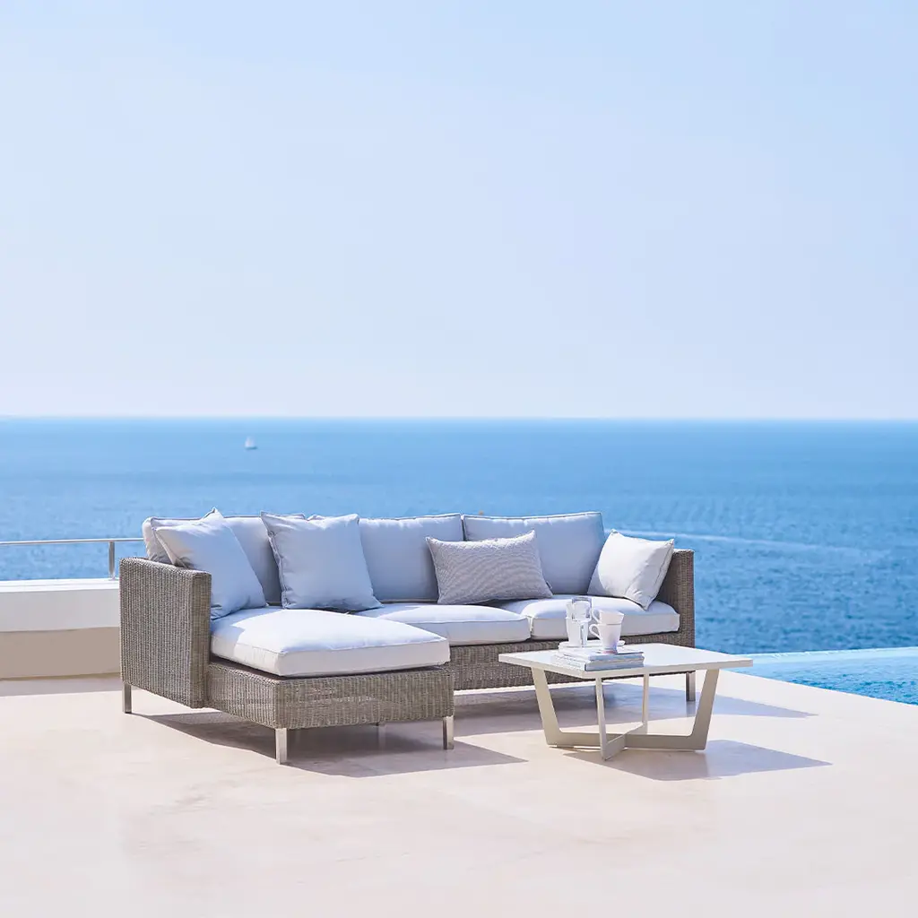 The Connect series is the optimum mix of classic Cane-line weave and functional modularity. Connect's modular construction means that the range can be adapted precisely to your own personal needs, in terms of both size and shape. Connect is designed by the Cane-line Design Team, and made of the unique, weather-resistant, Cane-line Weave ®. The cushions are available in different colors and is with QuickDry ®Foam. Setup Includes: [1] Chaiselounge Cushion [2] Single-seater Cushion [1] Chaiselounge (Left) [1] 2-Seater Sofa (Right)