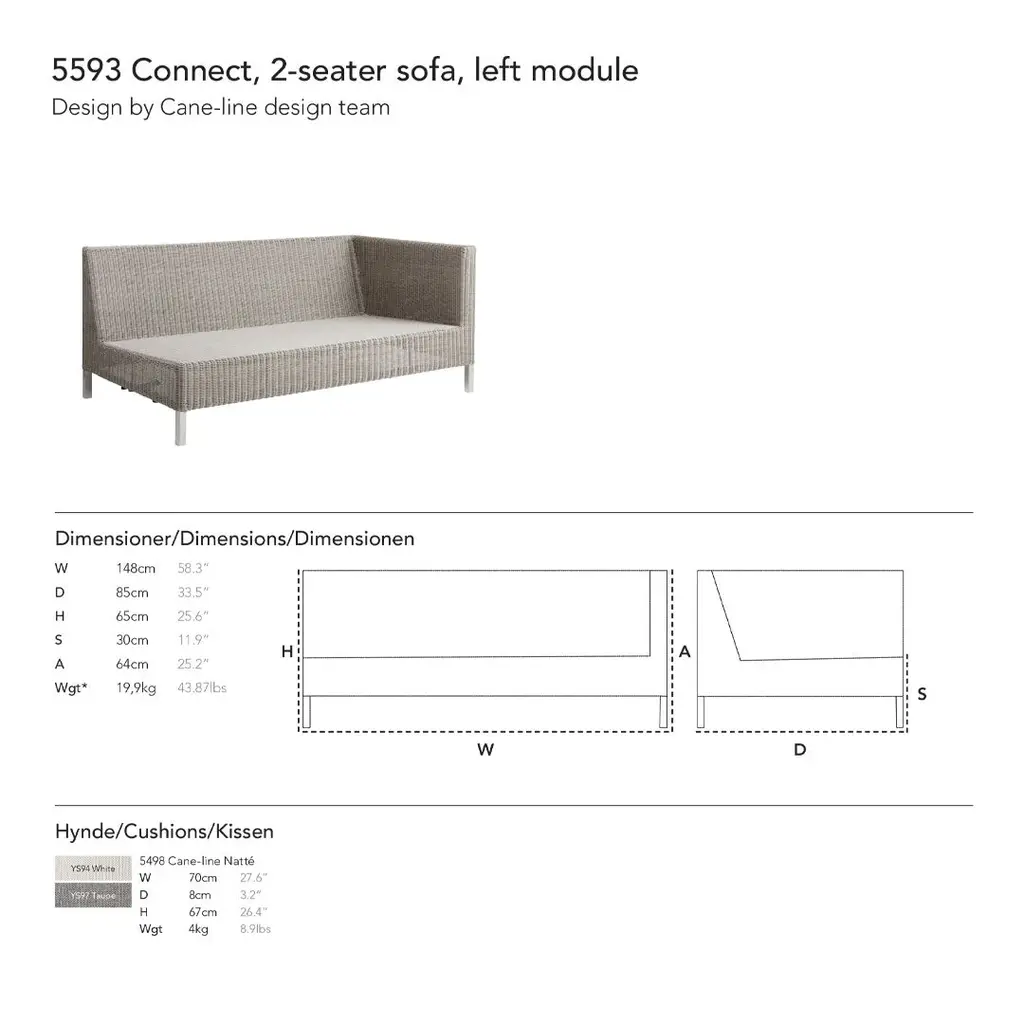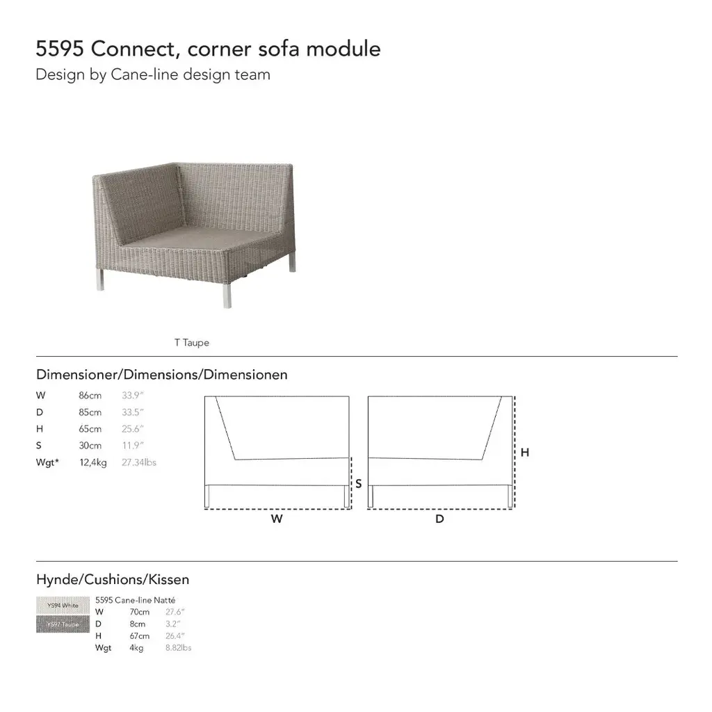The Connect series is the optimum mix of classic Cane-line weave and functional modularity. Connect's modular construction means that the range can be adapted precisely to your own personal needs, in terms of both size and shape. Connect is designed by the Cane-line Design Team, and made of the unique, weather-resistant, Cane-line Weave ®. The cushions are available in different colors and is with QuickDry ®Foam. Setup Includes: [1] Corner Cushion [5] Single-seater / Lounge Cushion [1] 2-Seater Sofa (Right) [1] 2-Seater Sofa (Left) [1] Single Seater [1] Corner