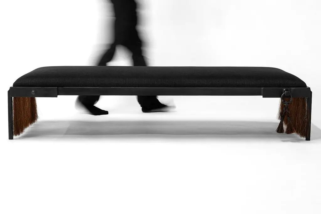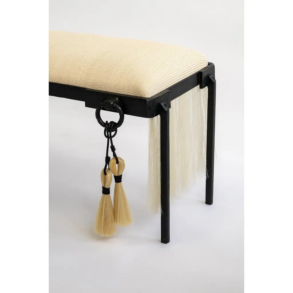 HORSE HAIR BENCH NO. 1JM. Szymanski d. 2019Contemporary furniture at its finest. Horsehair textile and blackened iron are combined to create an exciting juxtaposition of elements. Available in creme, brown, and black. Custom sizes available. Made in the Bronx, New York, USA.Our products are fabricated and finished by hand; variations in size, shape, and patina color are a natural result of this process. Tooling marks and surface scratches are part of the character of many finished pieces. All products are sealed with oil and wax, which over time are not impervious to moisture. Our blackened steel pieces installed outside, or in areas exposed to moisture indoors, especially in marine environments, will rust. Condensation from hot and cold drinks will leave rings on blackened steel table tops. Coasters or placemats can protect the finish. Periodic maintenance of blackened steel items may be required.