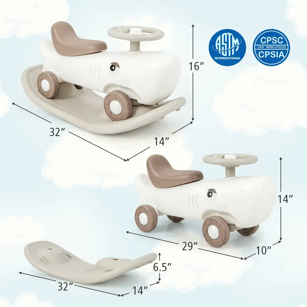 Specifications:Key Features:● 3-in-1 Fun and Convertible Design: This rocking horse perfectly combines a sliding car and a balance board, which offers multiple playing ways for both boys and girls. Thus, this rocking horse is super easy to covert or detach and will satisfy kids' different activity needs of different growing stages.● Secure and Gentle Rocking Function: The detachable rocking base guarantees 40° safe and gentle rocking angle, which helps to prevent rollover. 4-point support and dual anti-slip strips enhance its security and steadiness. Meanwhile, it also has passed ASTM and CPSIA certifications.● Lovely Outlook and Flexible Riding: With cute shape, this rocking horse will catch your sweeties' eyes. And there is a steering wheel for kids to better experience riding fun. Besides, 4 wear-resistant wheels also ensure smooth movement on flat surfaces.● Birthday and Festival Gift for Toddlers: This rocking toy is an ideal gift for kids over 1 year old. Its weight capacity is 110 lbs. Foot-to-floor design helps to exercise kids' leg muscles when they play. Children can also train core muscles, improve hand-feet coordination and promote balance ability during rocking or sliding.● Reliable and Comfortable Rocking Toy: Round corners and burr-free edges protect kids' delicate skin. Safe wheel gaps prevent pinching. Smooth seat with raised backrest ensures your little one's sitting comfort. Additionally, widened footrests allow kids to place their feet.