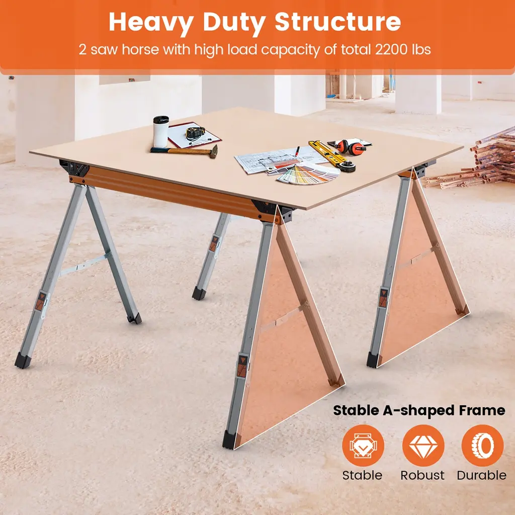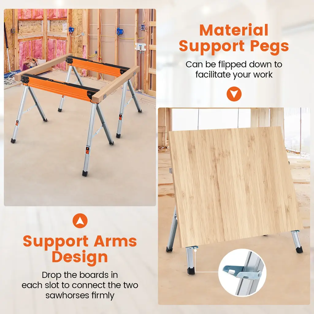 Looking for a lightweight and portable solution for your woodwork projects? These quick-folding sawhorses are the perfect answer. With their compact design and convenient handle, carrying and storing them becomes a breeze. Weighing just 14 lbs each, you'll have no trouble transporting them wherever your projects take you. Besides, these sawhorses boast a heavy-duty structure that can support up to 1100 lbs each. The stable A-shaped frame ensures their stability, making them ideal for even the toughest tasks. Additionally, these sawhorses come with detachable support arms, allowing you to create a sturdy trestle table effortlessly. The flip-down support pegs provide a perfect surface for placing your wood materials. And with non-slip foot pads and a non-slip work surface, you can work with added safety and comfort. Best of all, these sawhorses require no assembly. Simply open the legs using the push-button mechanism, and you're good to go. FeatureThe compact size and handle design for easy storage and carrying 2 saw horse with high load capacity of total 2200 lbs Drop the boards in each slot to connect the two sawhorses firmly Material support pegs can be flipped down to facilitate your work Detachable support arms allow for flexible usage and customized setups Sturdy metal construction with robust durability for long-lasting performance Non-slip foot pads ensure stability and prevent unwanted movement during use No assembly required for instant useSpecificationColor: Orange, Black Material: Metal Overall Dimension: 42" x 23" x 30"(L x W x H) Folding Dimension: 38" x 2.5" x 4.5" (L x W x H) Weight Capacity of Each Sawhorse: 1100 lbs Weight Capacity of Each Support Pegs: 55 lbs Total Net Weight: 28 lbs Package Includes: 2 x Sawhorses 1 x Instruction