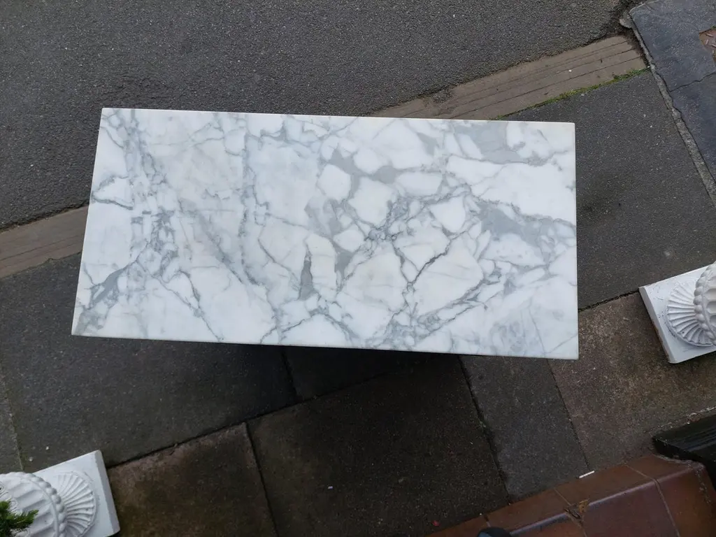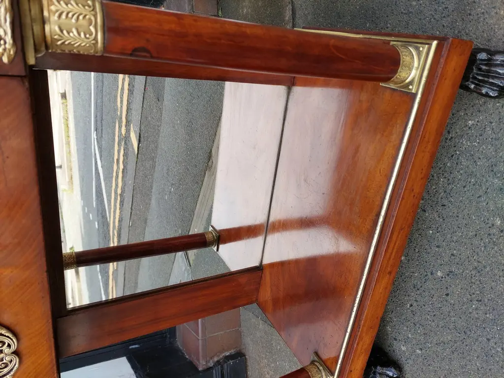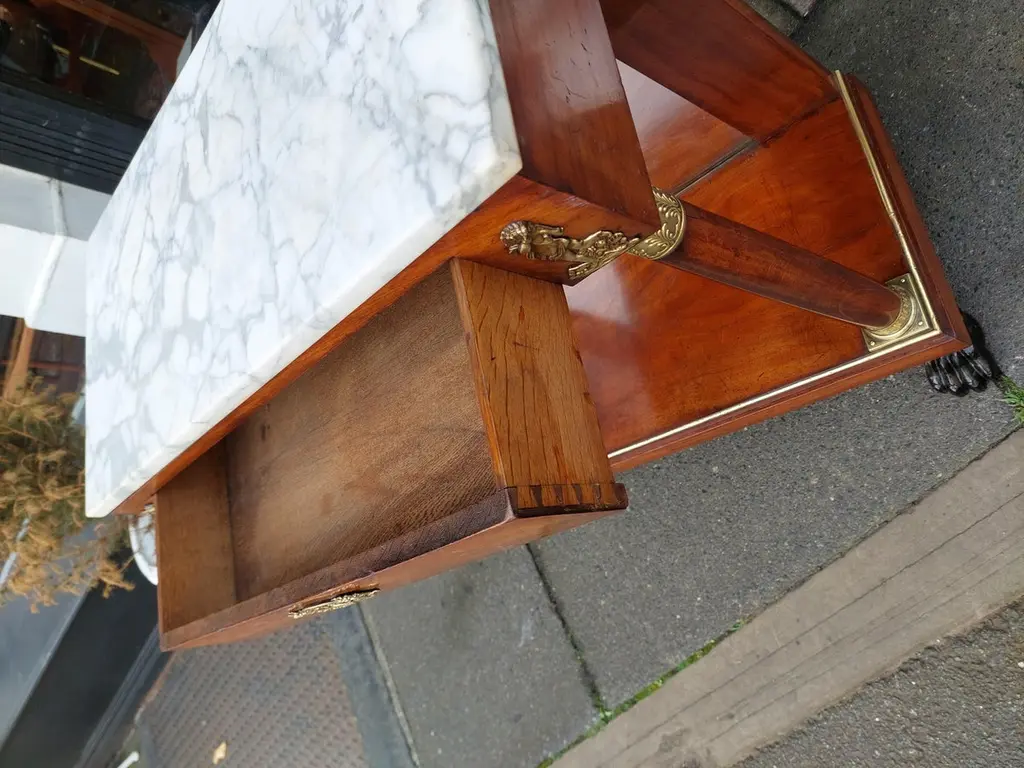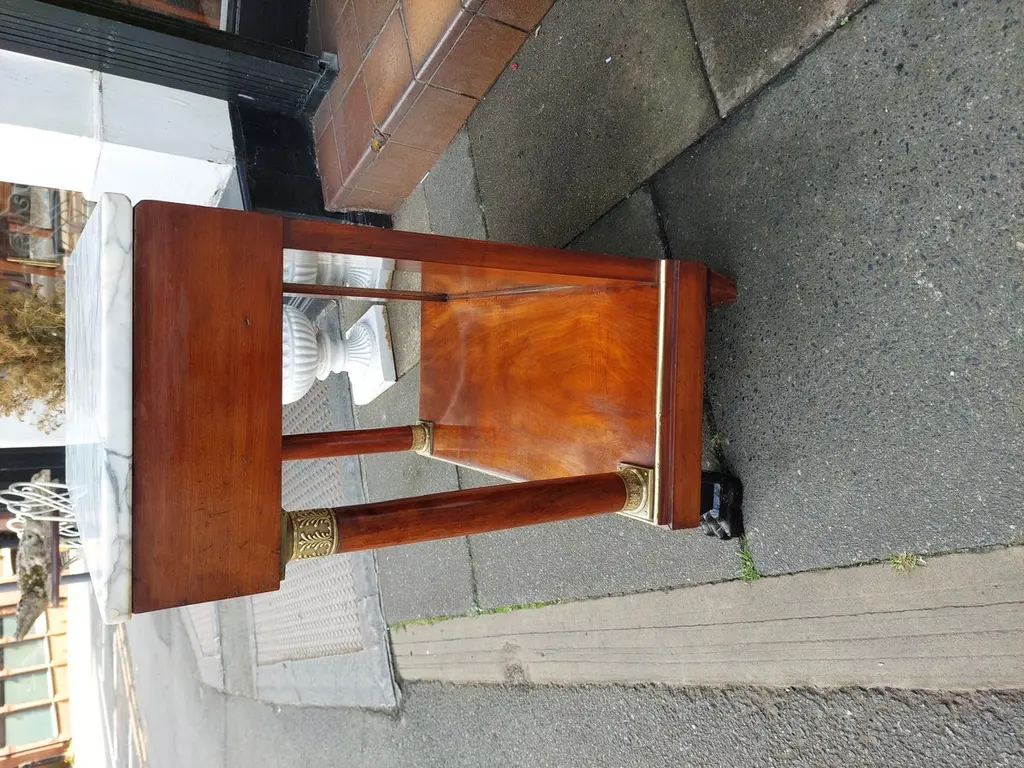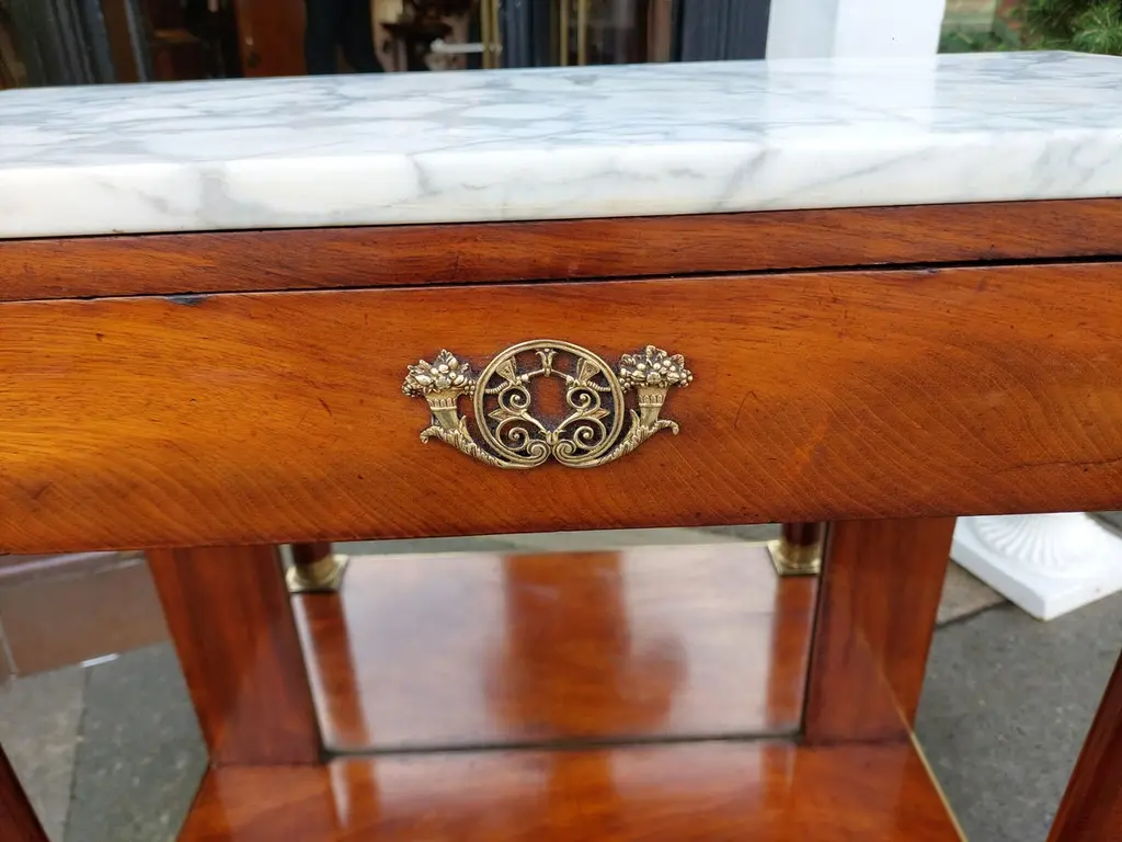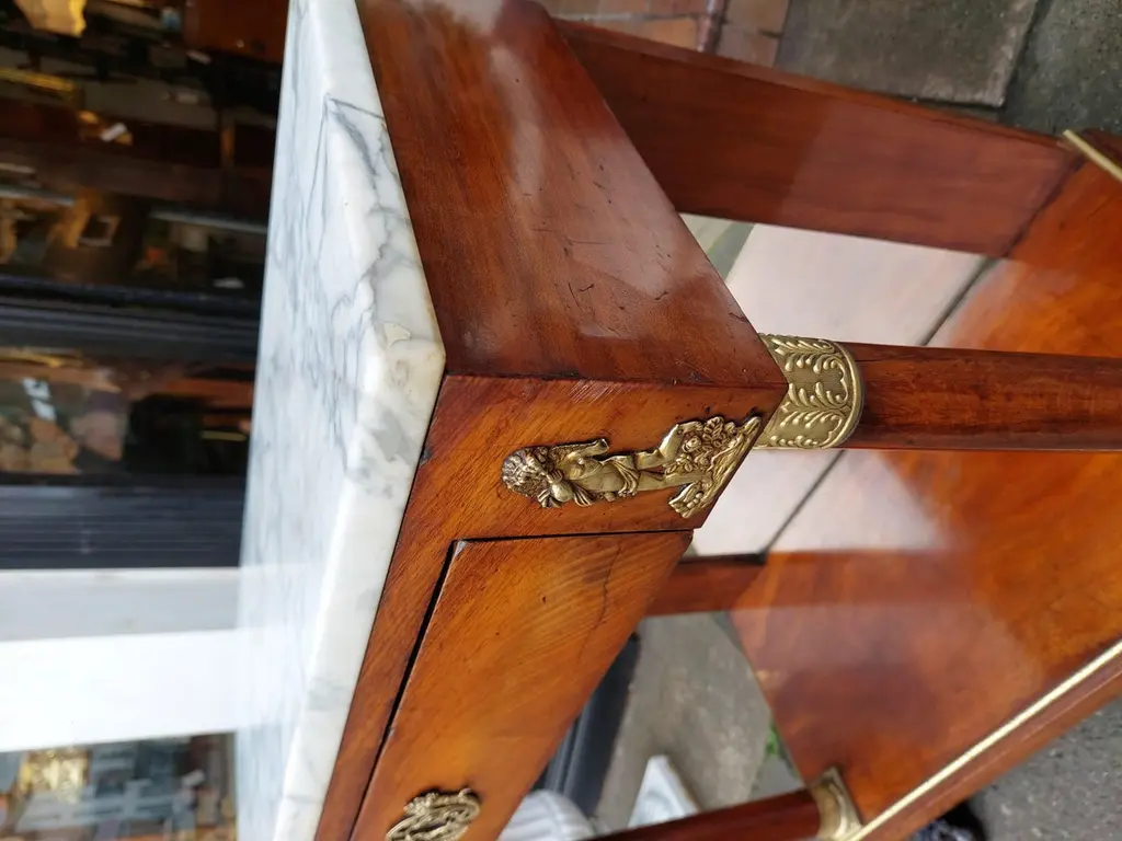 Early 20thC French Figured Mahogany Console Table - with white marble top above a frieze drawer and open mirrored back base with tapering column supports and plinth base - 27.5"w x 14.5"d x 30.5"h