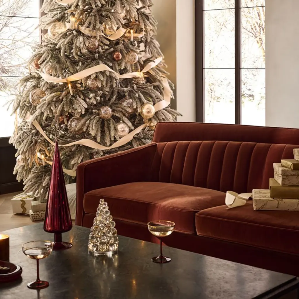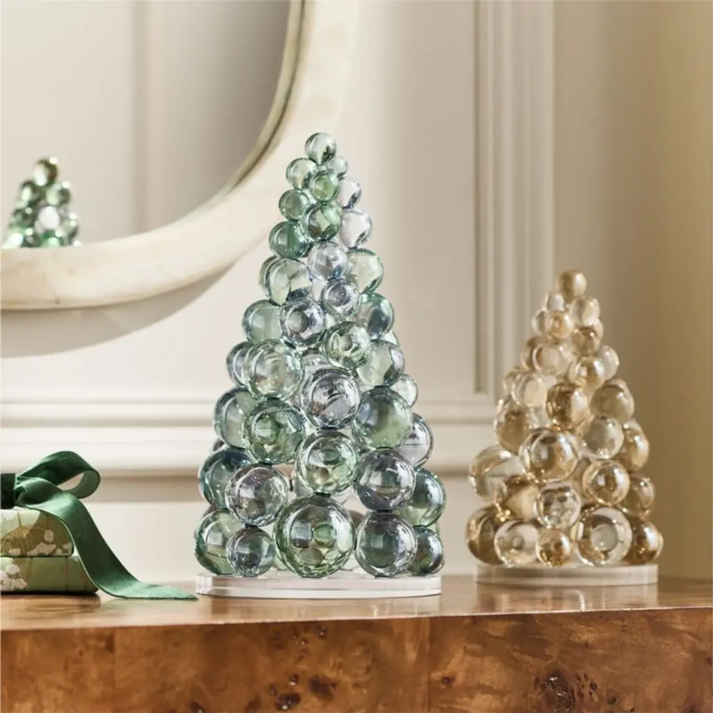 Breathtaking in its materiality, the Elle Christmas tree stacks crystal balls atop each other to create a dazzling display. Made with K9 crystal, which is often chosen for chandeliers due to its high optical clarity, the tree is tinted with amber tones for a mesmerizing decorative moment. Display with the 11" Elle crystal Christmas tree. CB2 exclusive.