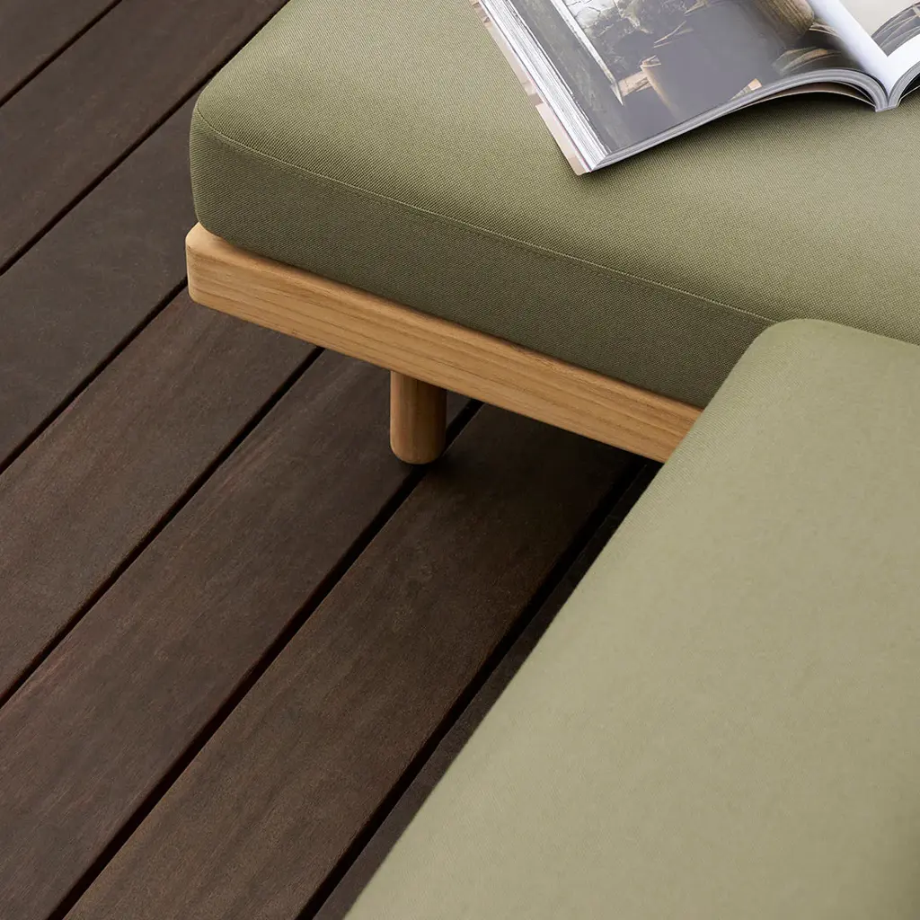 The Embrace Outdoor Lounge Sofa is a flexible, modular design featuring a solid FSC-certified untreated teak frame and soft upholstery. A hand woven flat rope back and armrests support soft upholstery in a range of earthy colors. Setup Includes: [1] E541 [1] E511