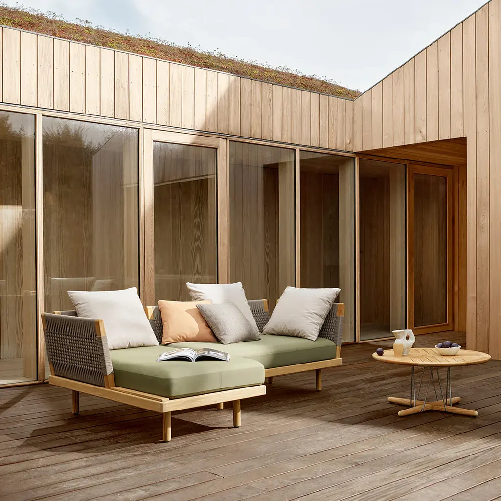 The Embrace Outdoor Lounge Sofa is a flexible, modular design featuring a solid FSC-certified untreated teak frame and soft upholstery. A hand woven flat rope back and armrests support soft upholstery in a range of earthy colors. Setup Includes: [1] E541 [1] E511