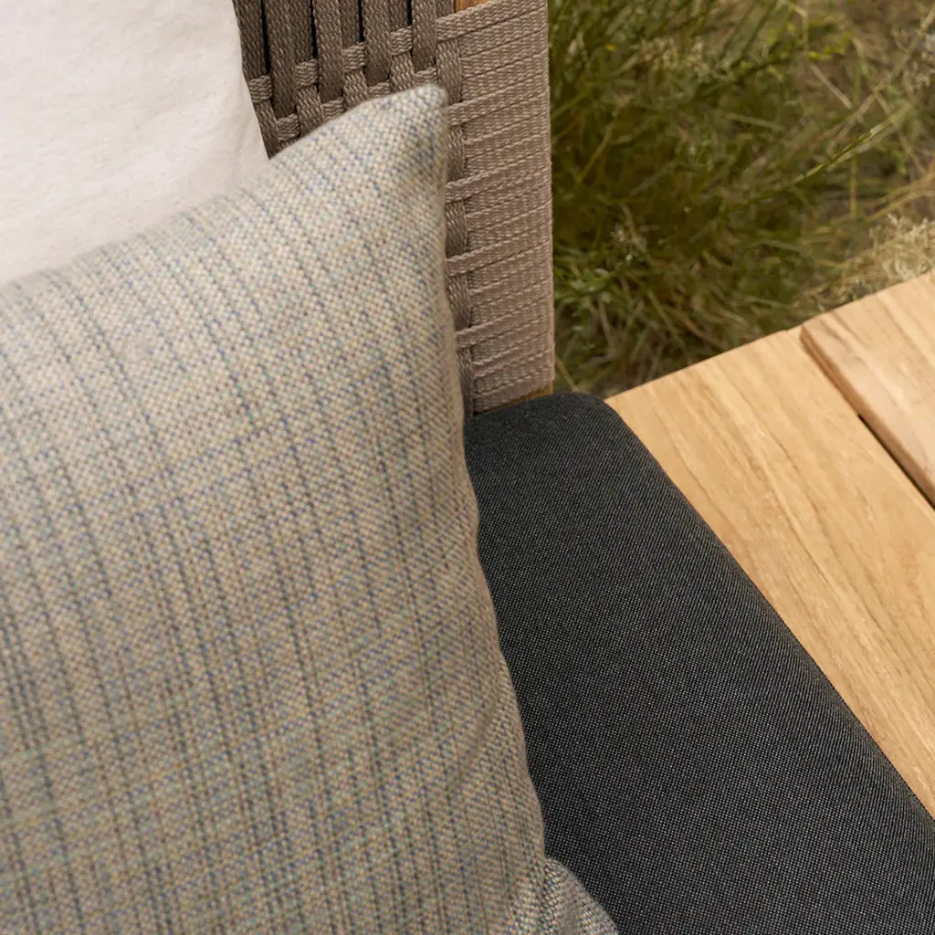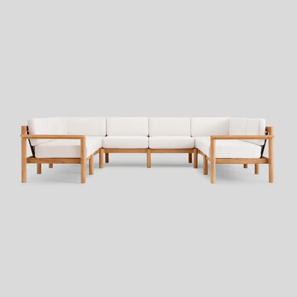 The Embrace Outdoor Lounge Sofa is a flexible, modular design featuring a solid FSC-certified untreated teak frame and soft upholstery. A hand woven flat rope back and armrests support soft upholstery in a range of earthy colors. Setup Includes: [1] E520 [1] E511 [1] E500 [1] E510