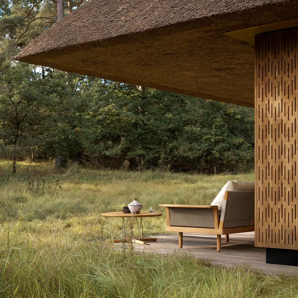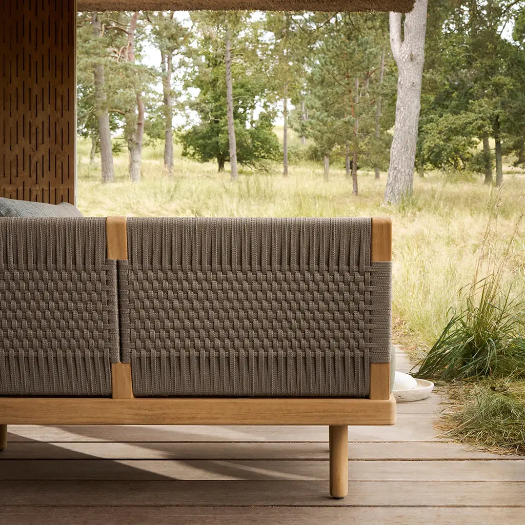The Embrace Outdoor Lounge Sofa is a flexible, modular design featuring a solid FSC-certified untreated teak frame and soft upholstery. A hand woven flat rope back and armrests support soft upholstery in a range of earthy colors. Setup Includes: [2] E510