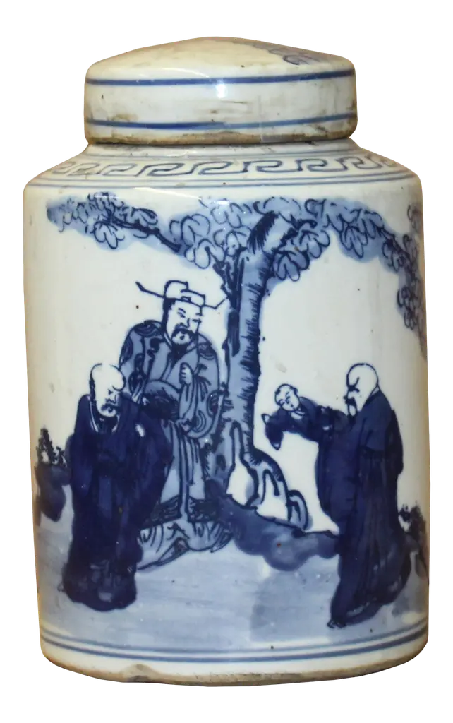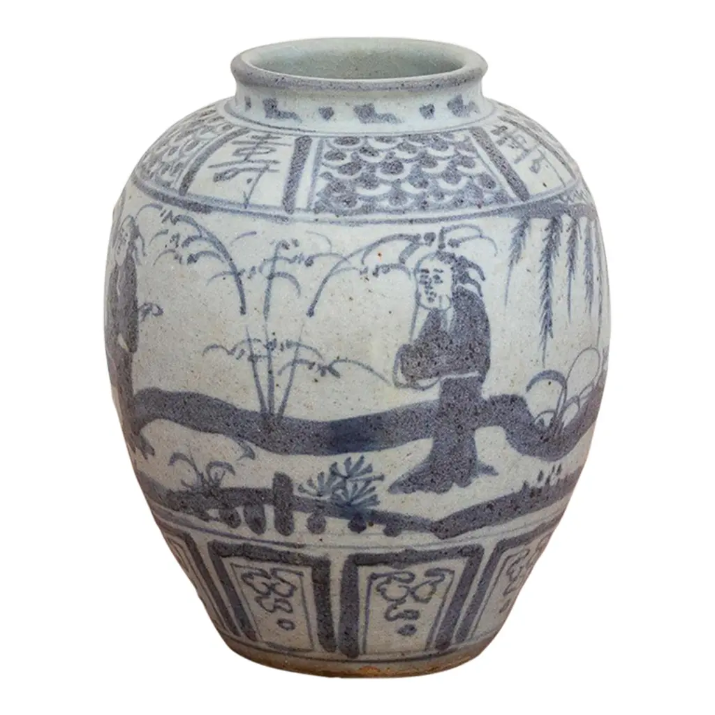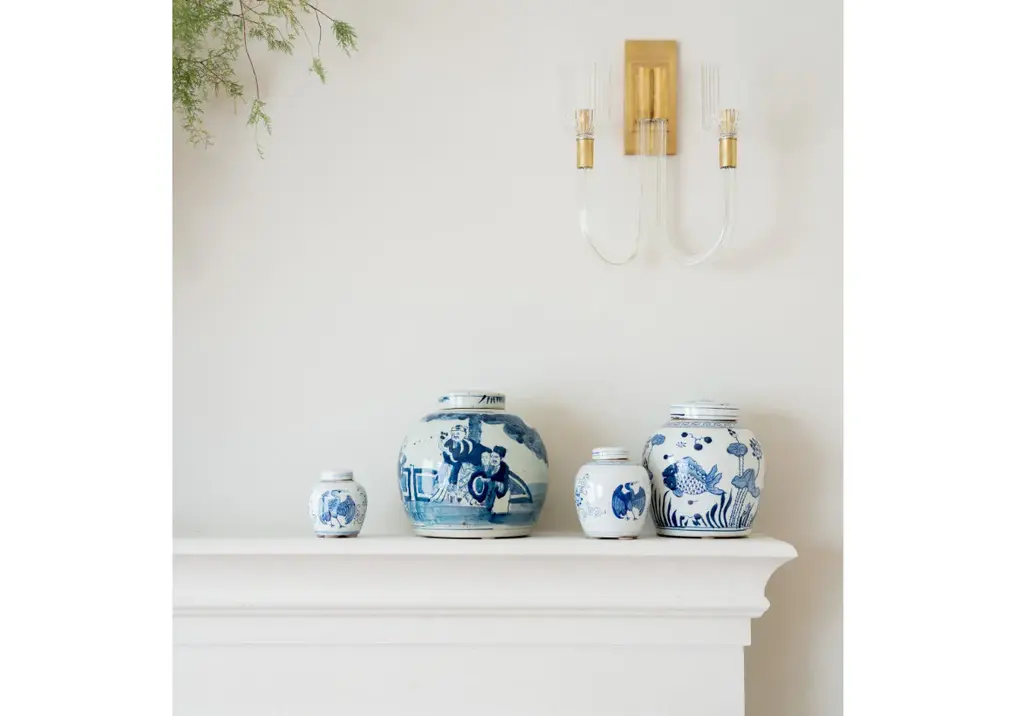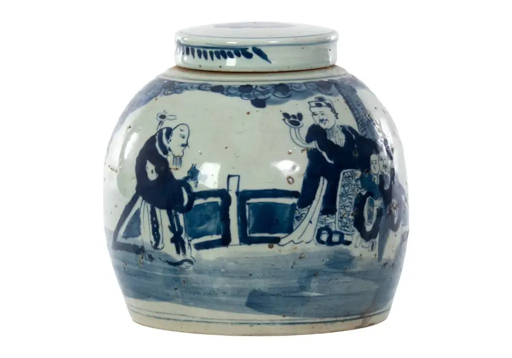An eye-catching addition, this temple jar sparks conversation with one side showcasing painted figurines and the other a simple symbol. Its timeless porcelain and blue coloring is accentuated by natural marketings, lending a cultured, traveled look. Available in two sizes, style together or separately throughout the house for a cohesive touch.