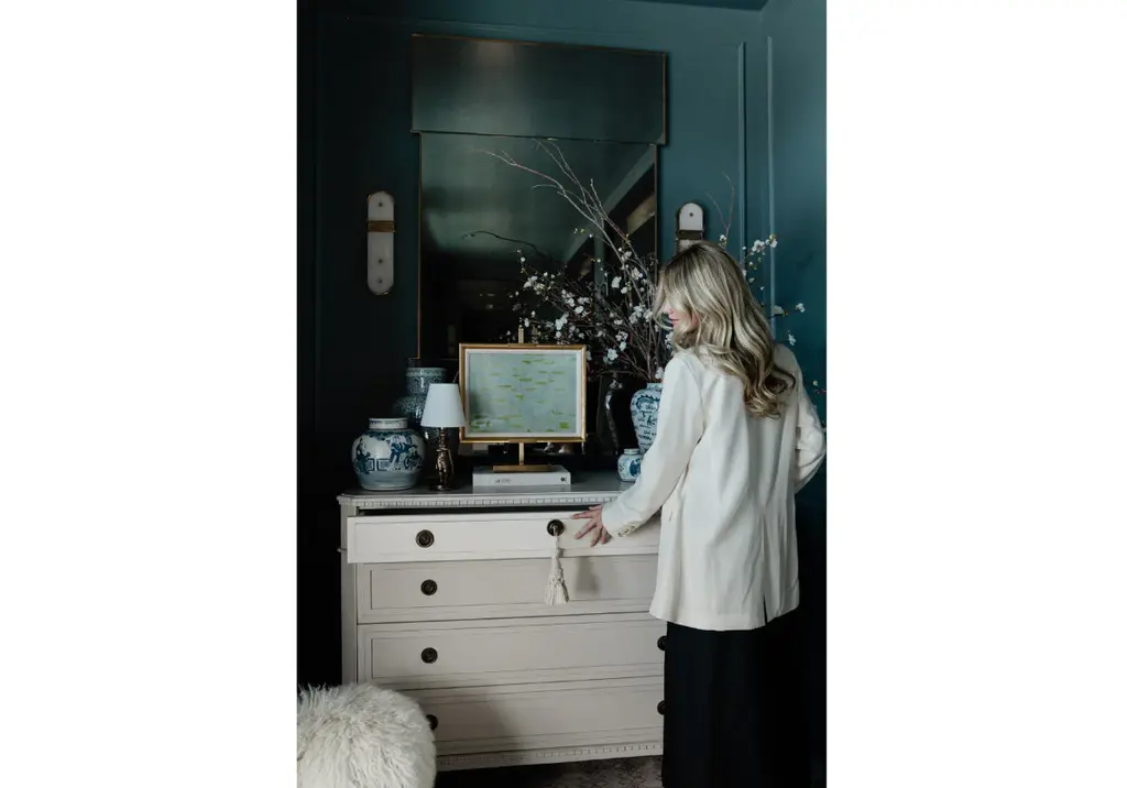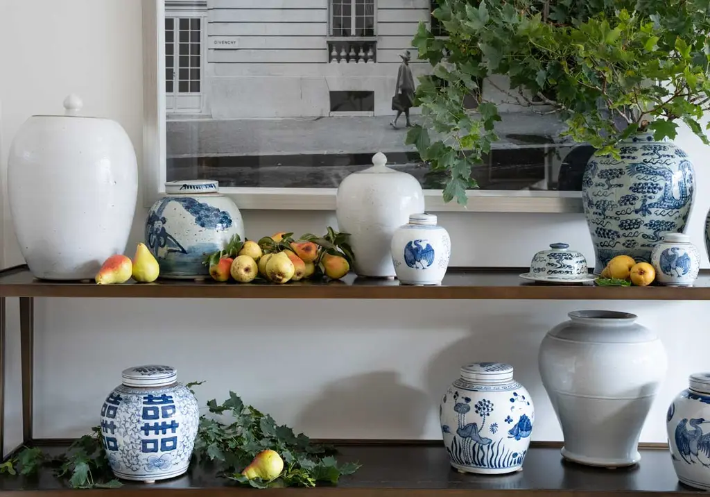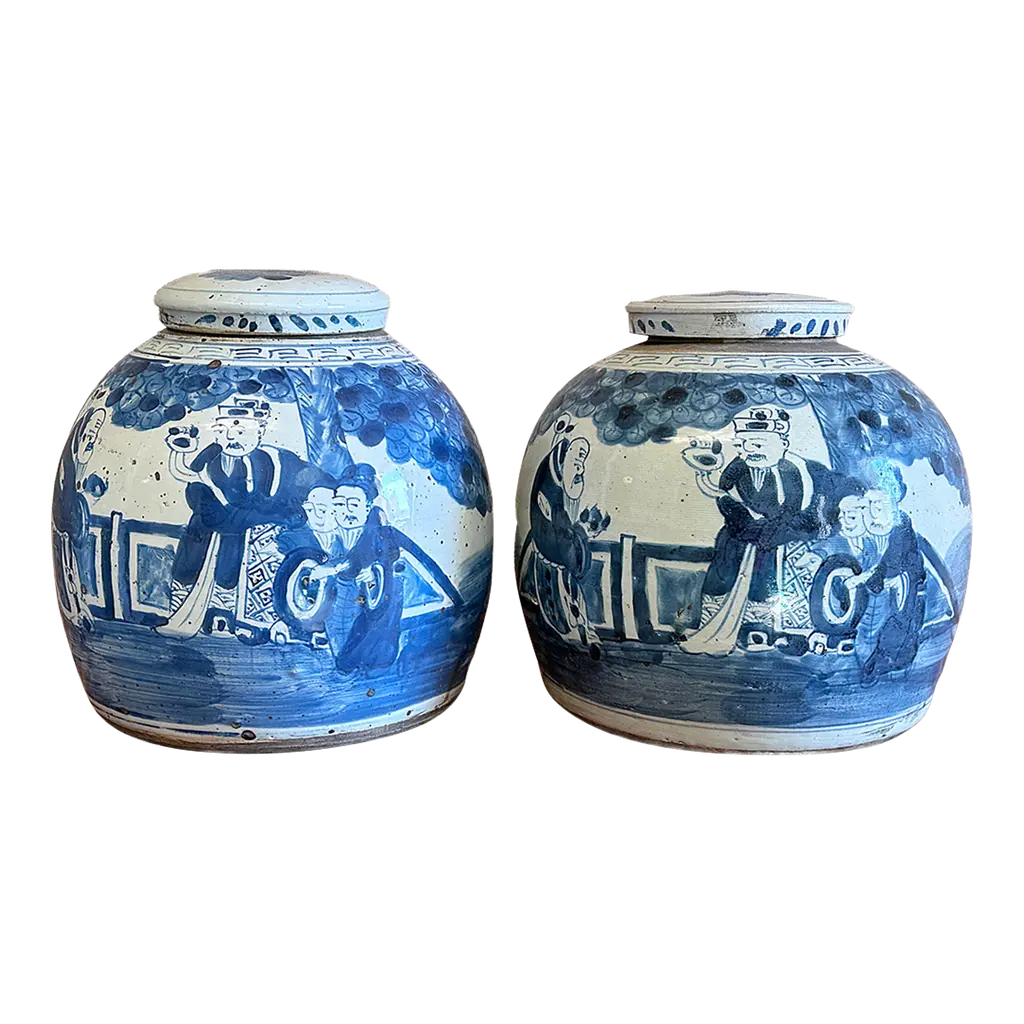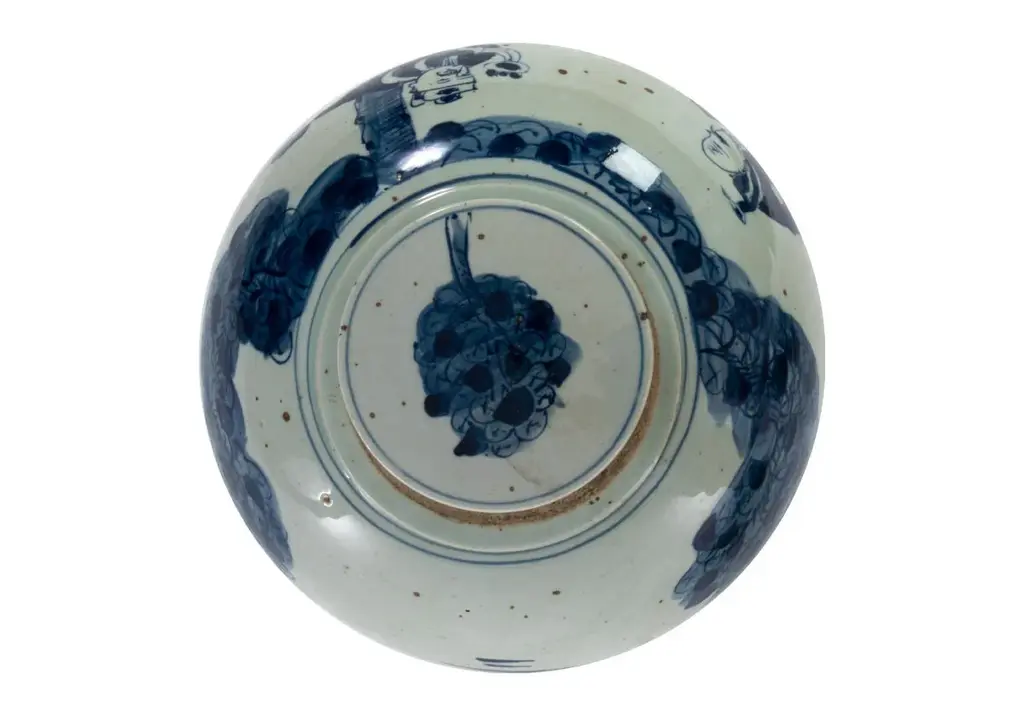 An eye-catching addition, this temple jar sparks conversation with one side showcasing painted figurines and the other a simple symbol. Its timeless porcelain and blue coloring is accentuated by natural marketings, lending a cultured, traveled look. Available in two sizes, style together or separately throughout the house for a cohesive touch.
