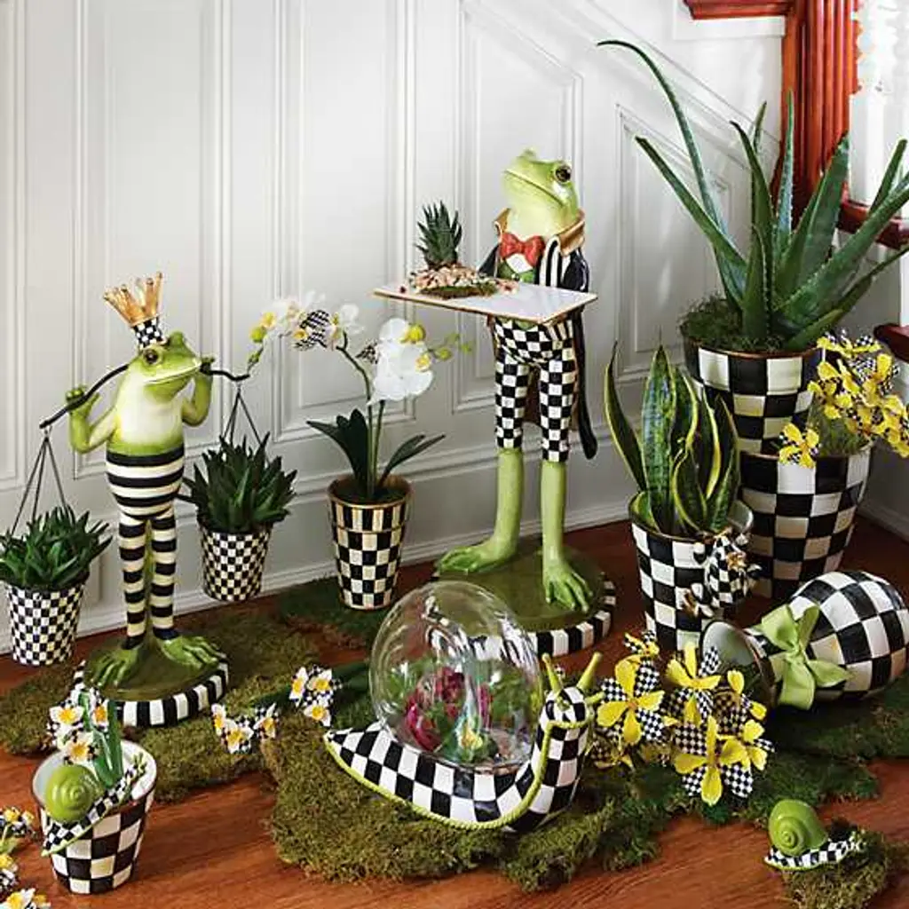 Here on the Farm, we’re quite fond of the amphibian ambassadors that inhabit our pond and endlessly inspire our designs. The hand-painted Fergal the Frog Butler, formally attired in tails and Courtly Check® trousers, is at your service, holding a ceramic dish that can hold all sorts of items, including your mail or keys.