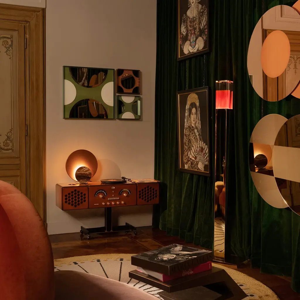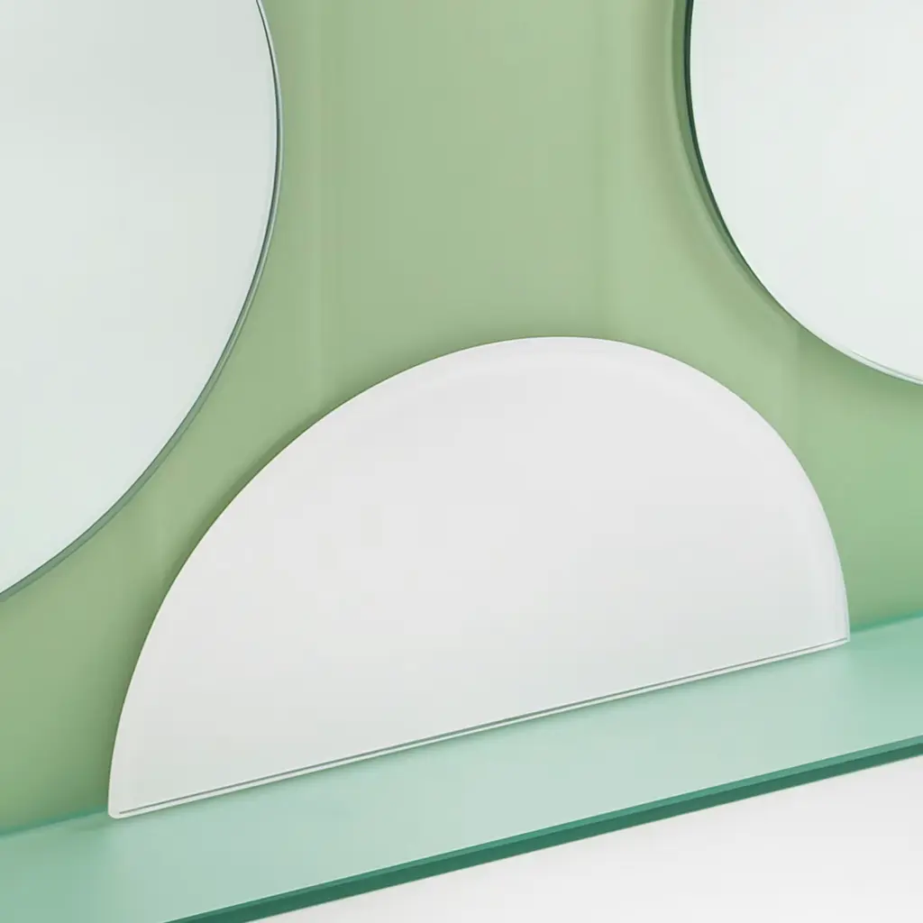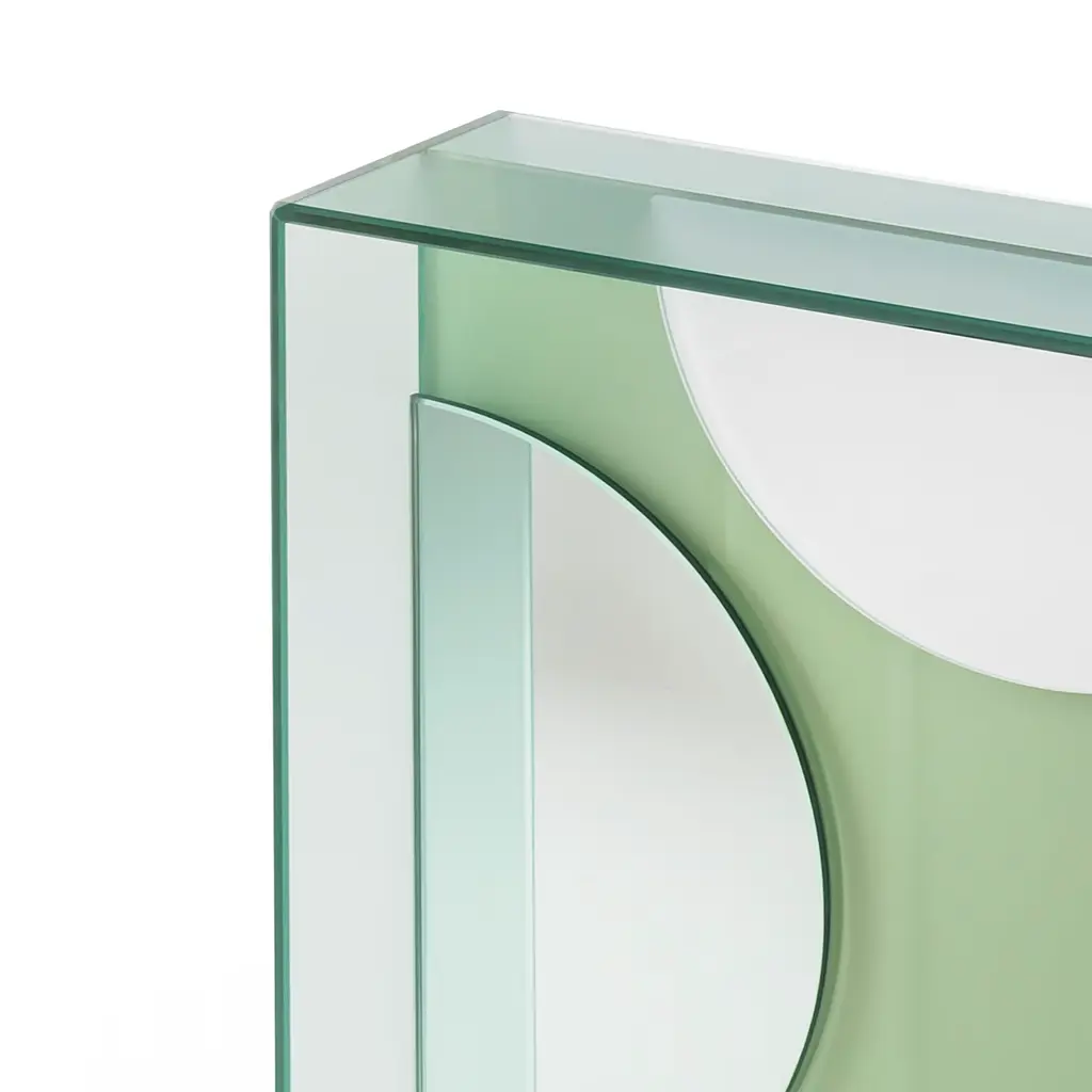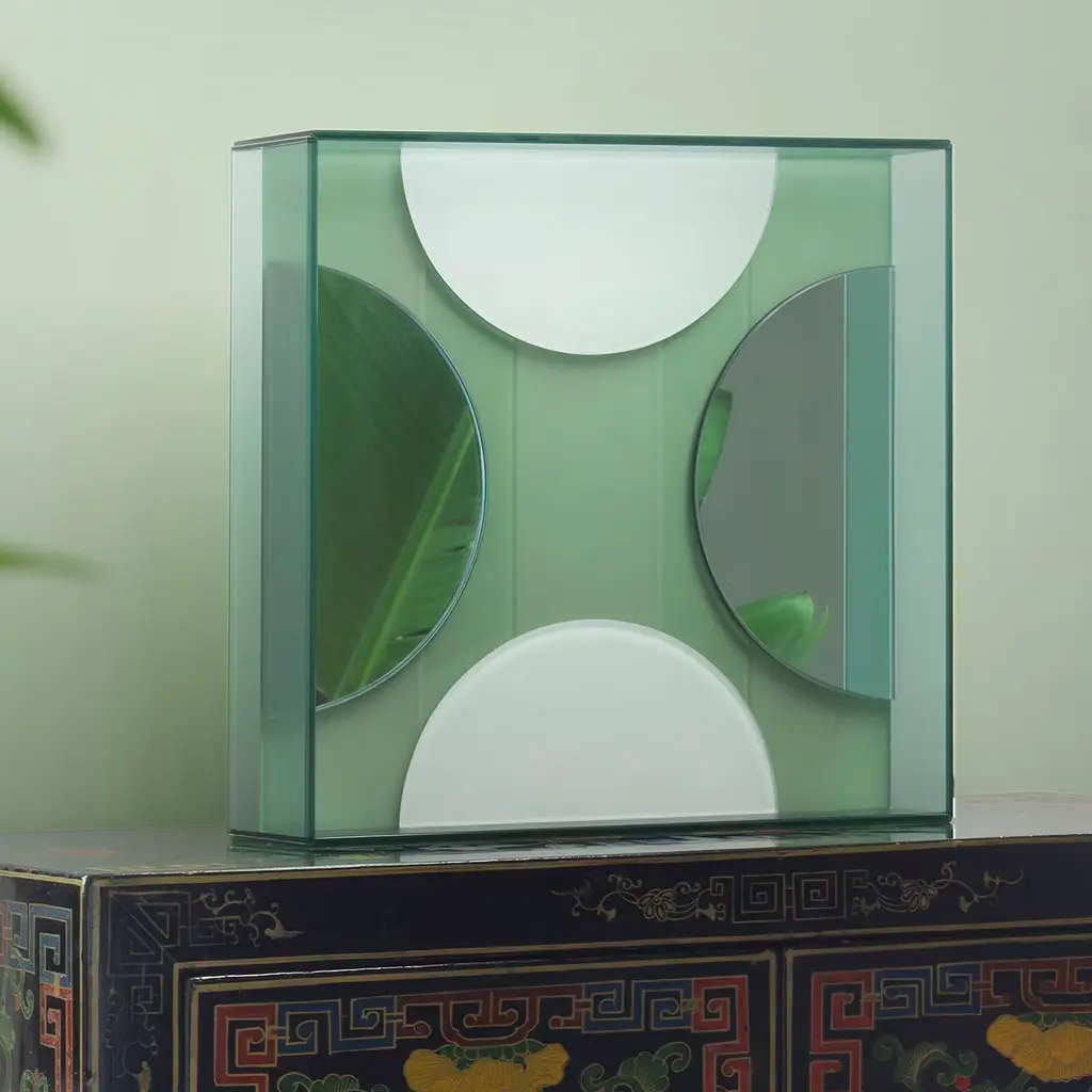 This mirror for wall or tabletop juxtaposes matte, glossy and coloured reflective glass in an artful arrangement to create an unconventional, striking accessory that is as much a work of art as a mirror.