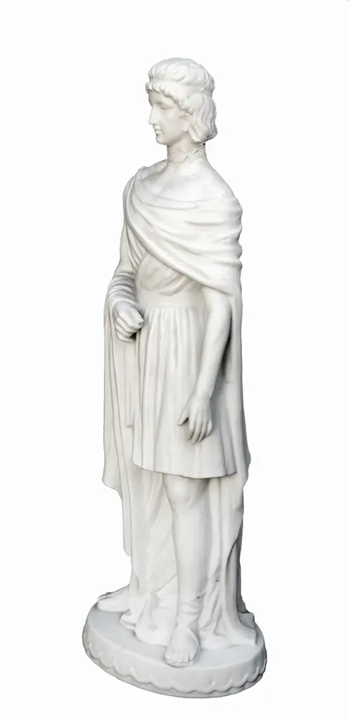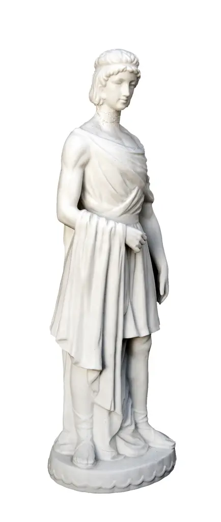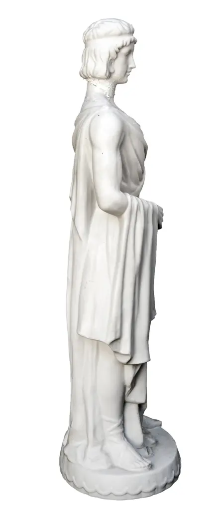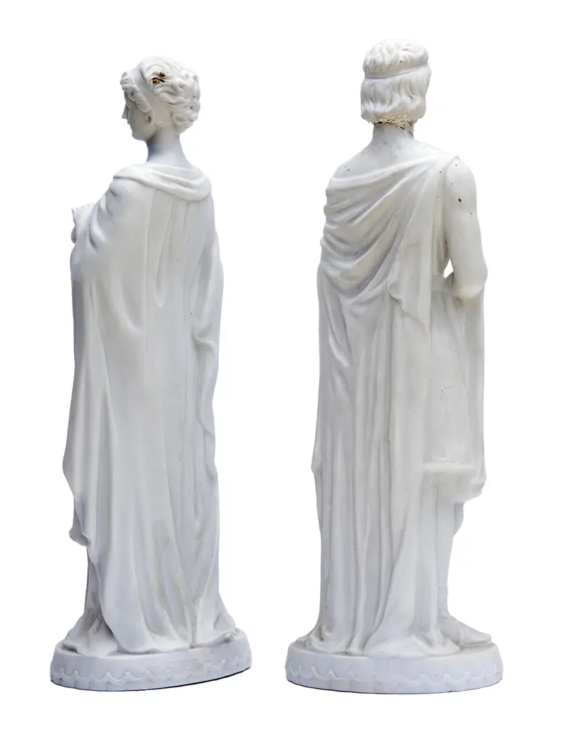 German White Bisque Figurines; a pair. Neoclassical Parian porcelain bisque figurines of a female and male muse.