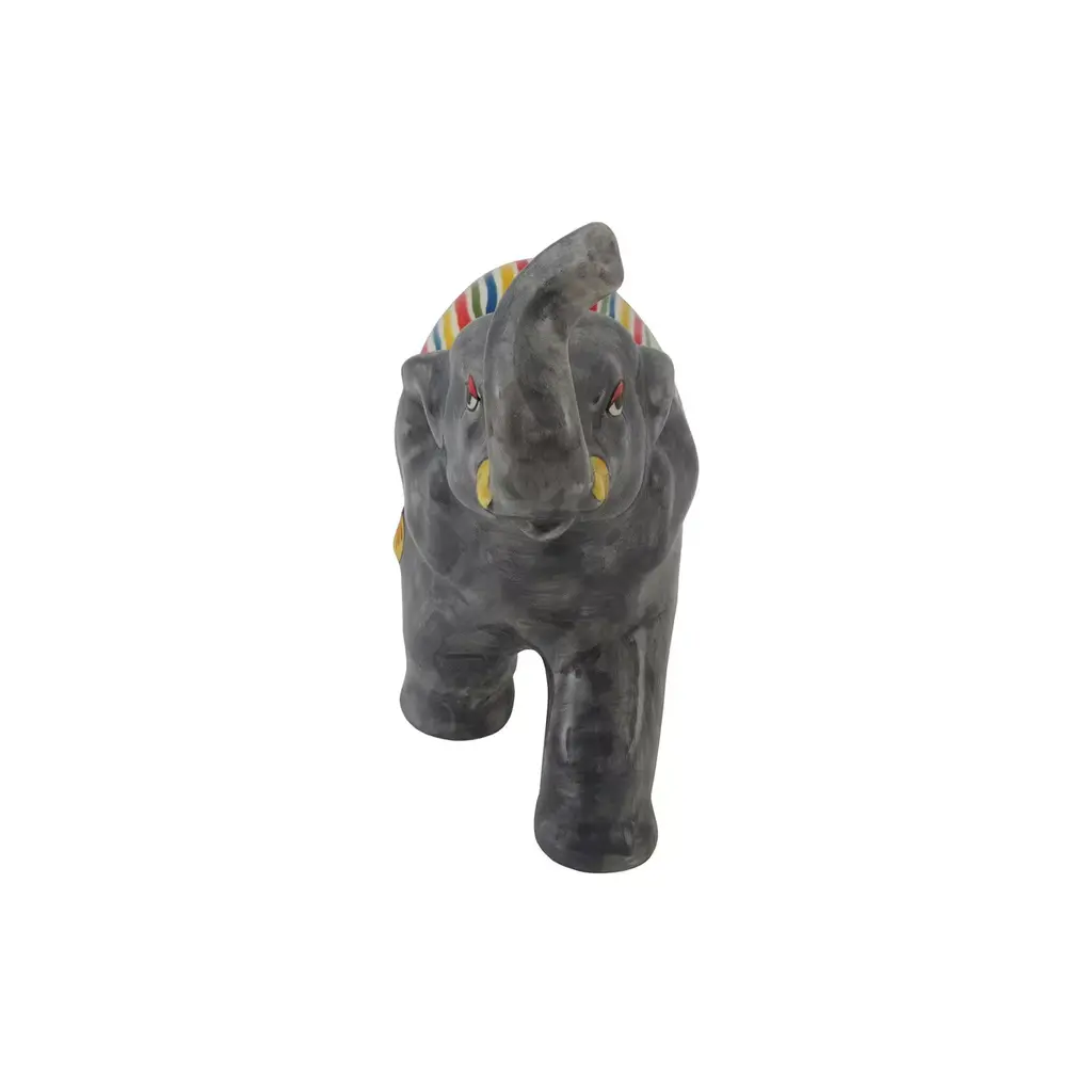 A splendid objet d'art, this elephant figurine will make a lively addition to a decorative art collection. Handcrafted of fine ceramic, it is painted by hand showcasing a colorful striped blanket on the elephant's gray back. An exquisite gift idea, it is a symbol of good luck when the trunk faces upward and toward a window of the house.