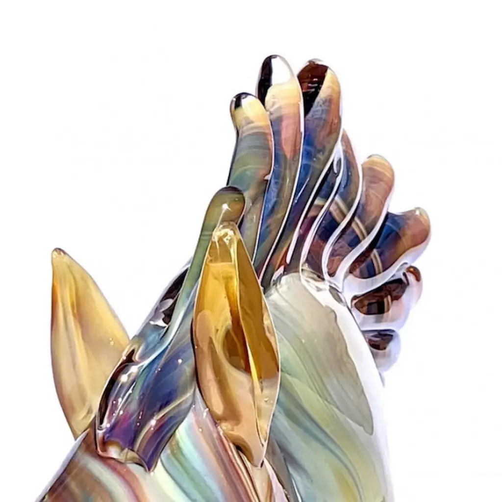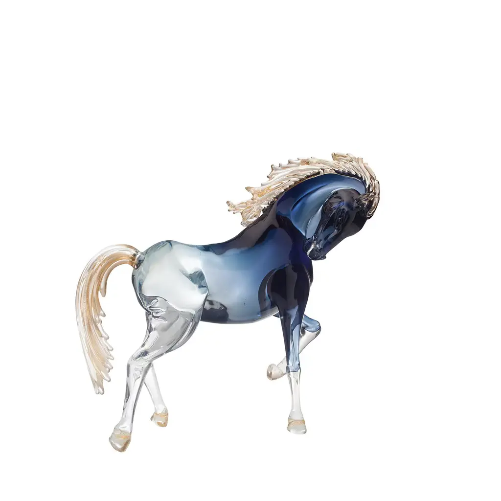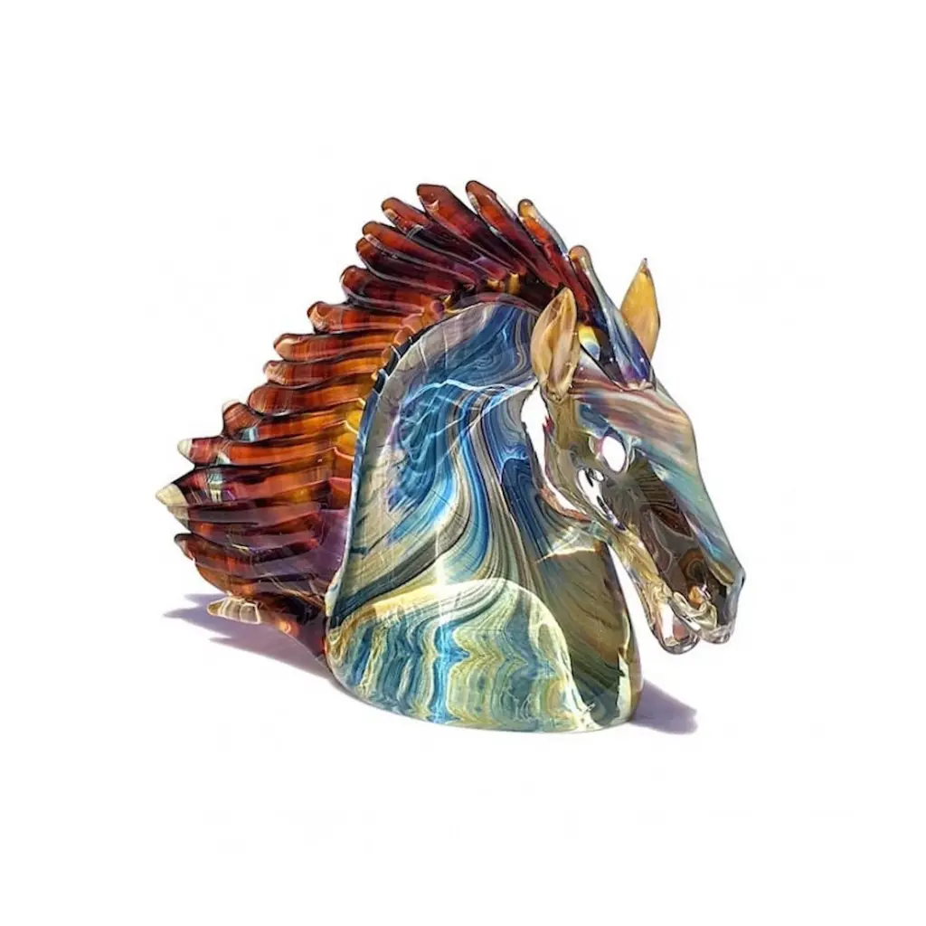 Splendid representation of a horse's head in Murano caledony glass, a true essence of glass enriched by this particular color. A must-have in your home! The item bears the "Vetro Artistico® Murano" trademark which comes in the form of an adhesive sticker bearing the manufacturer's numerical code and the writing "Vetro Artistico® Murano" made of gold leaf. It is a mark of origin that certifies glass products made on the island of Murano in Venice. The Brand was established by law of the Italian State (Veneto Region lex. n. 70 of 12/23/1994) and is the only official guarantee of a glass product certainly made on the island of Murano. Labeled by Maker