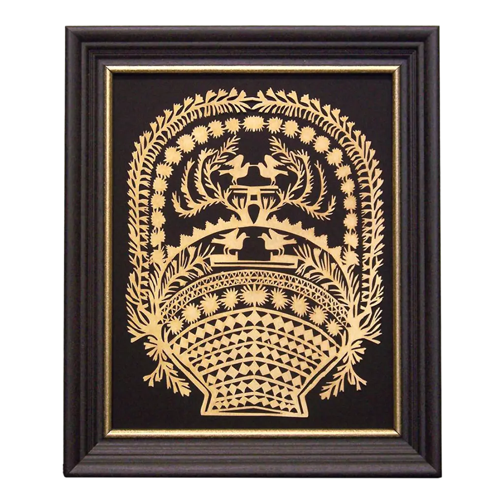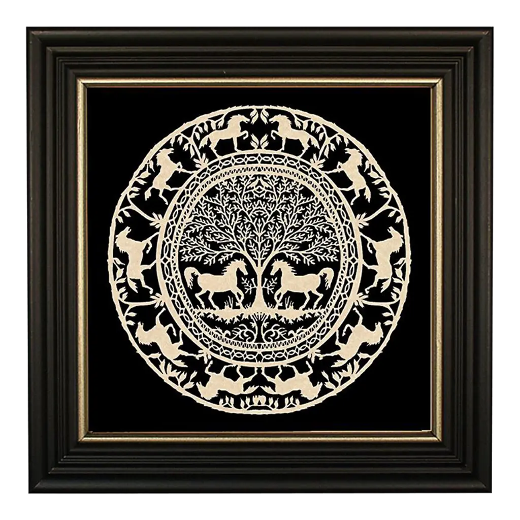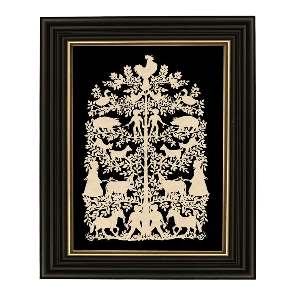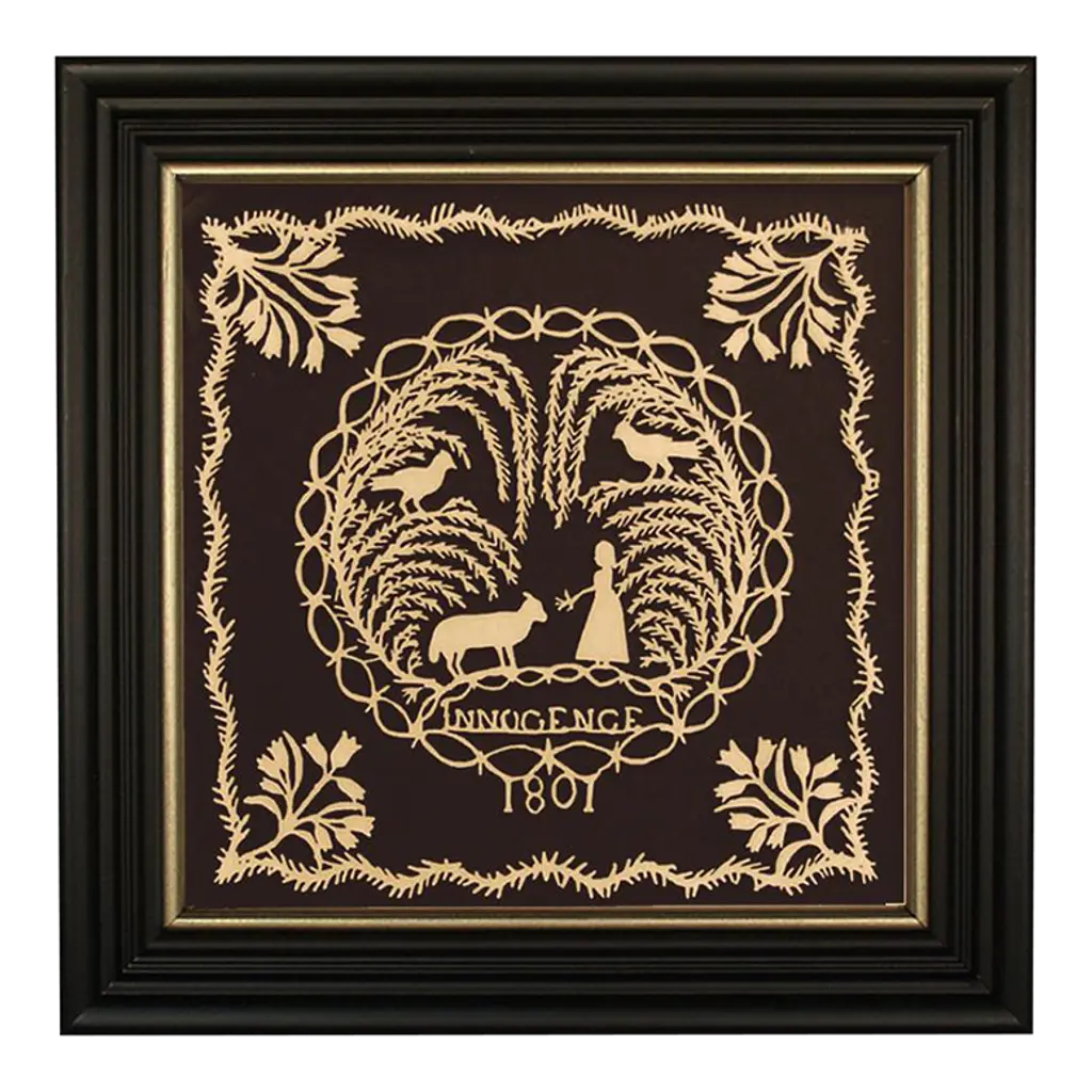 Lacy eighteenth-century cutwork were cut freehand with scissors from strong rag paper. Our antiqued paper is laser cut and placed on a black paper stock, then framed behind two layers of glass for added depth. Framed in a 10" x 10" black wood frame with gold edge. The back is covered in craft paper and finished with a saw tooth hanger. The perfect addition to historical, western or equestrian decor. Quality materials and hand craftsmanship....entirely from the USA! - Laser cut scherenschnitte - 10" x 10" black, durable, solid ash frame with gold trim - Black frame with gold edge, attached saw tooth picture hanger on back - Behind two layer of glass for added depth - Special aged paper gives an antique appearance - Historical, western, equestrian decor - Handmade in USA