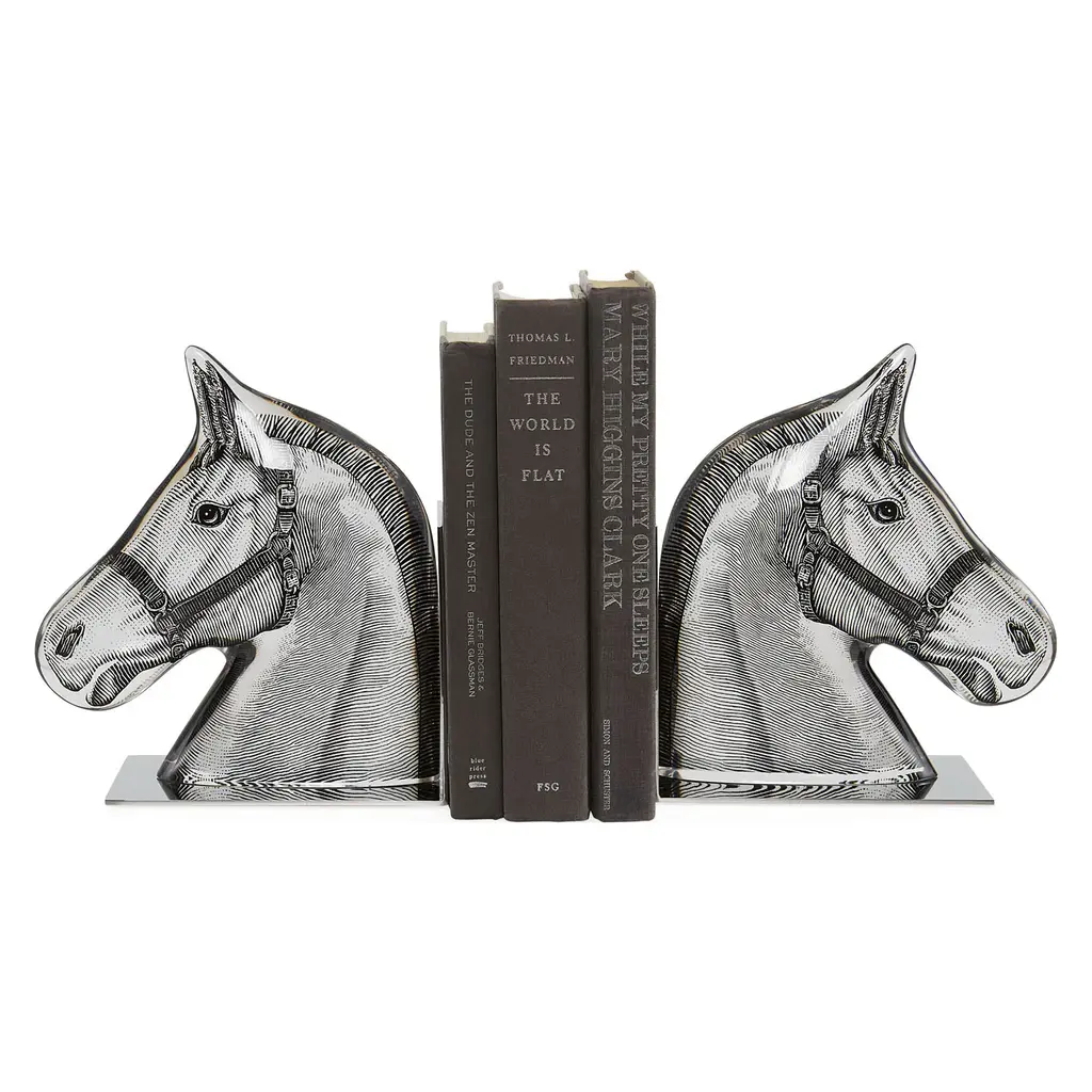 Equine Elegance. Lift up your literature with our Horse Bookends. Each features an L-shaped polished nickel base supporting a stately acrylic stallion. Wildly chic with a silver tone, they're poised to take charge of your toppling tomes.