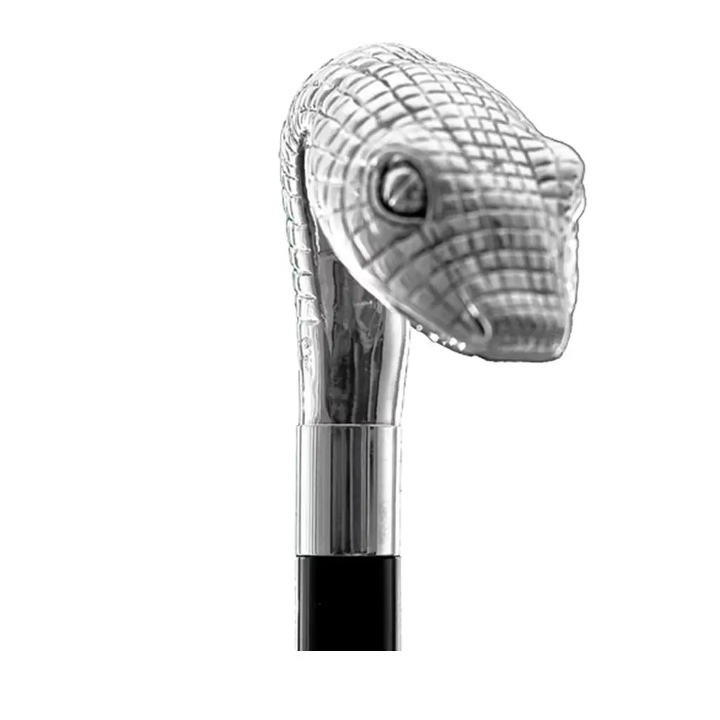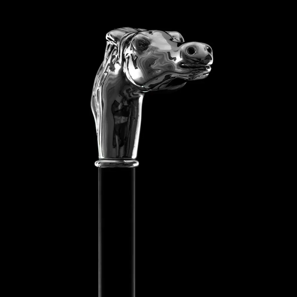 Characterized by an elegant and classic design, this stick features a metal handle richly decorated with elegant patterns embossed on the surface. The conical shaft of this sophisticated accessory is crafted in gloss black beech wood and has a silver-plated brass tip with protective rubber end. This is a collectible item, not to be used for walking.