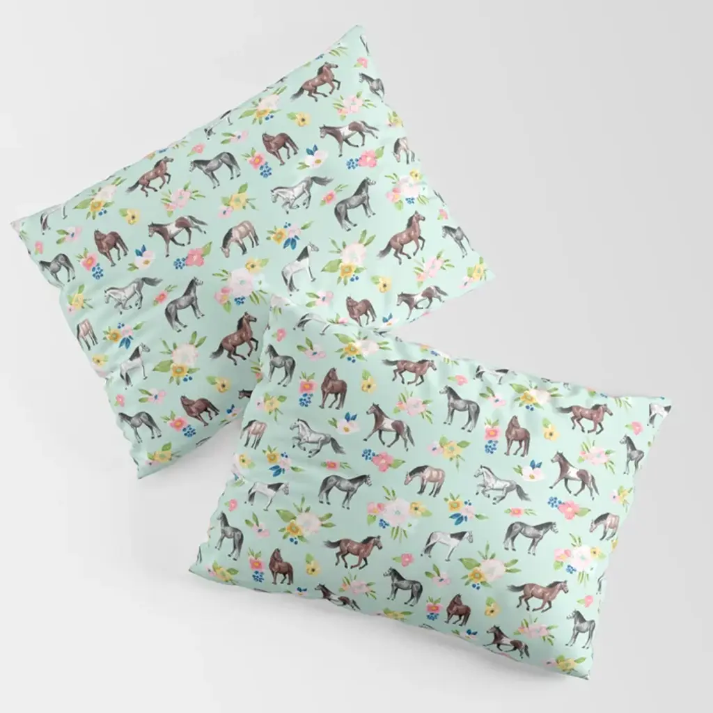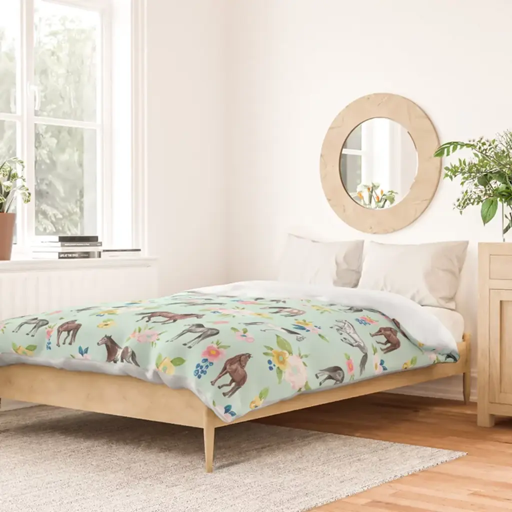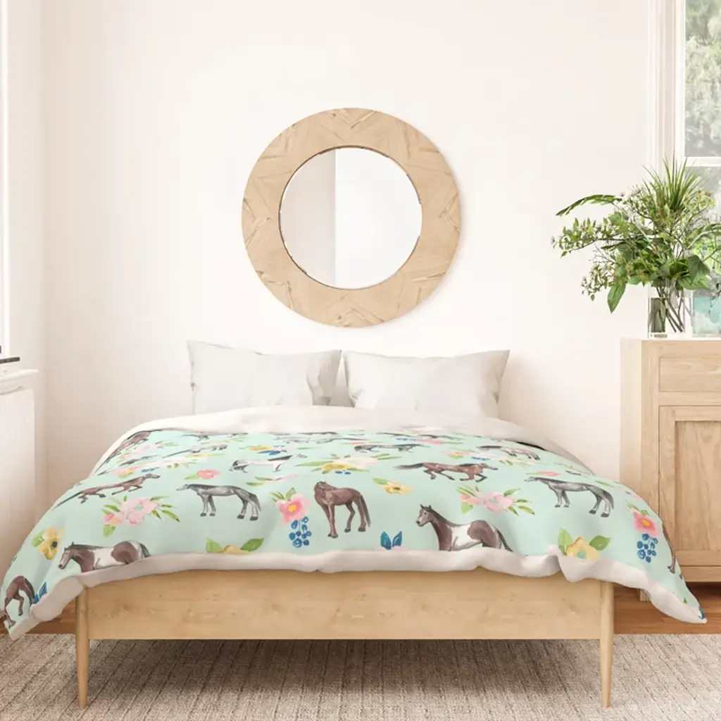 Horses And Flowers, Mint Blue, Watercolor Floral, Equestrian Decor, Horse Art Duvet Cover