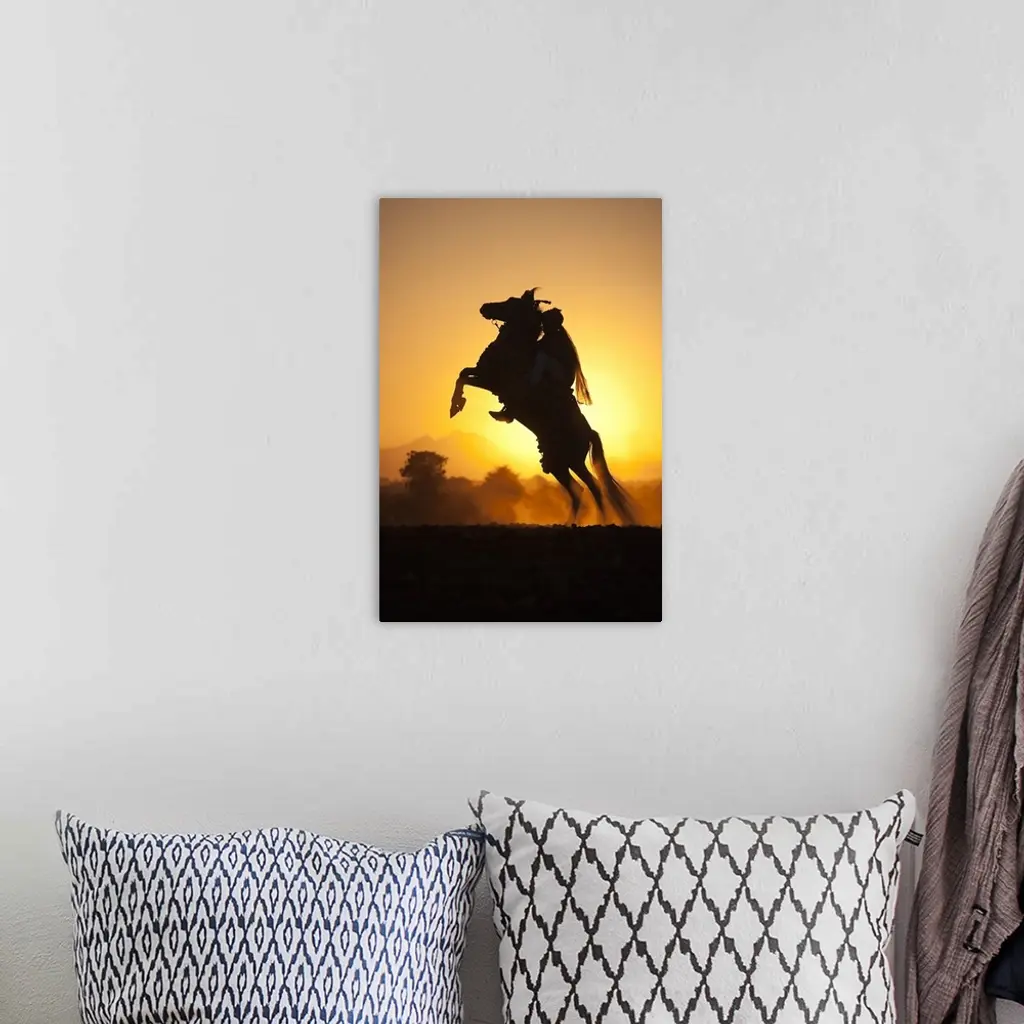 India, Rajasthan, Rider On A Rearing Kathiawari Horse Backlit In The Sunset