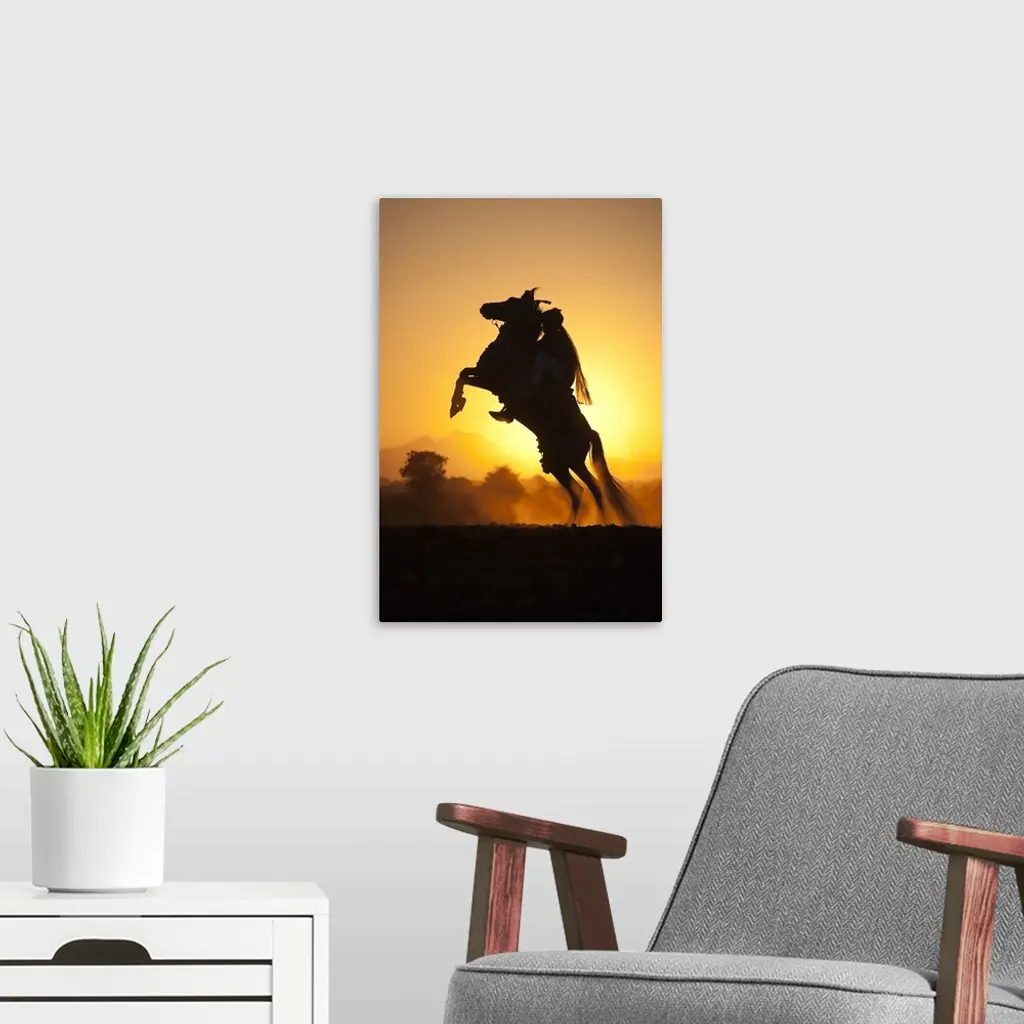 India, Rajasthan, A typically dressed rider on a rearing Kathiawari horse backlit in the sunset