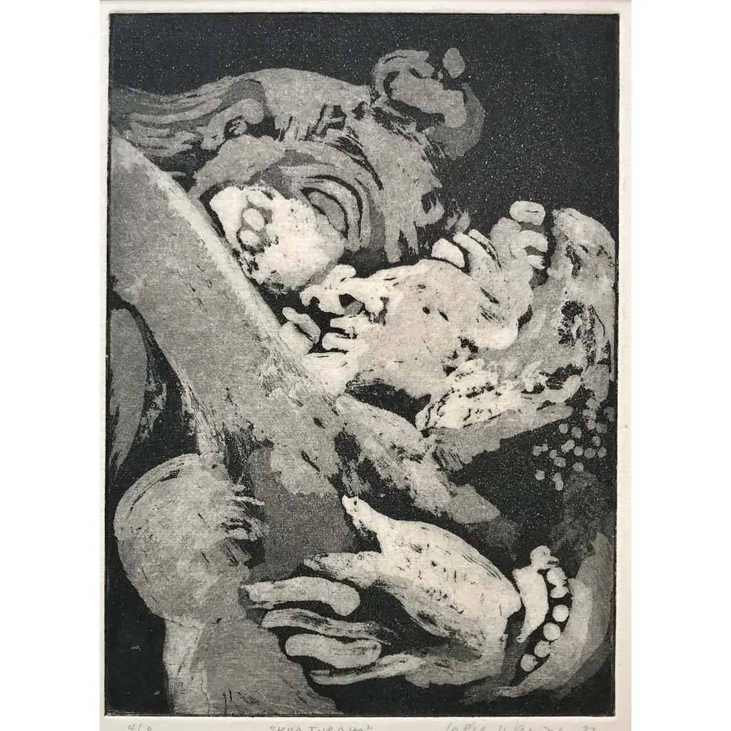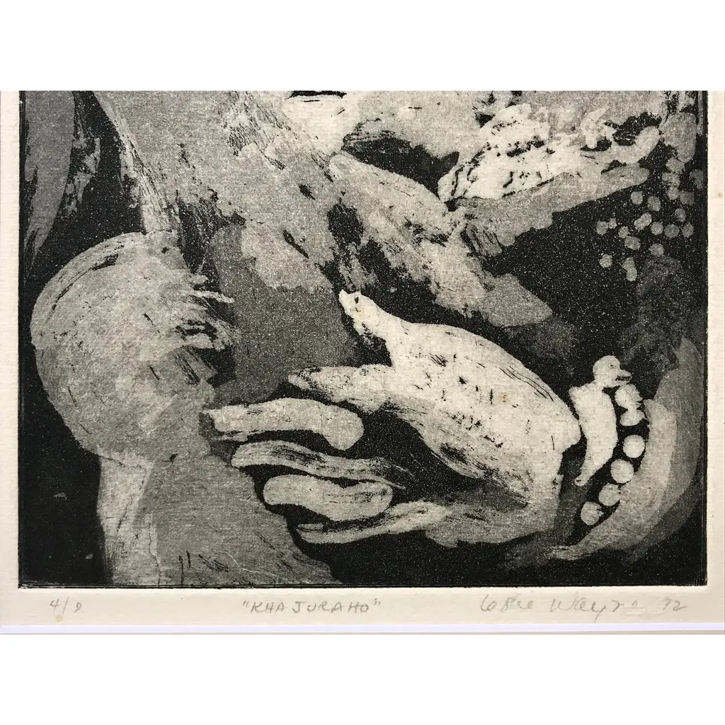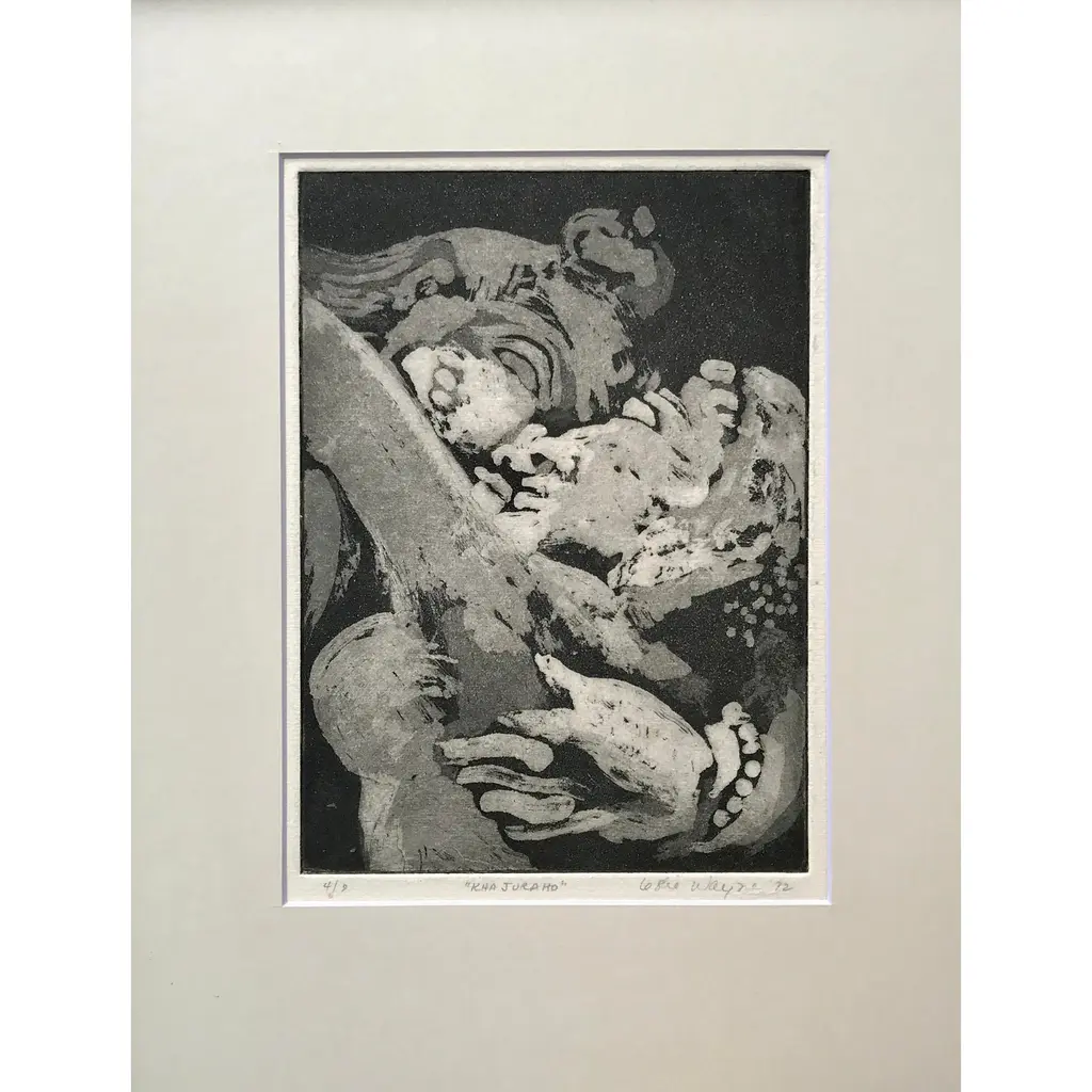 Vintage Etching ��������Khajuraho������ Hindu Temple Figures by Leslie Wayne. Presented matted and framed. Wayne has been the subject of 32 solo shows, two traveling surveys, and over 150 group exhibitions since 1974. Her work has been reviewed in The New York Times, Art in America, Artforum, Artnews, The New Yorker, Newsweek, The Washington Post, The Brooklyn Rail, The San Francisco Chronicle, Tema Celeste, and The Los Angeles Times, among others in the U.S. and Europe.