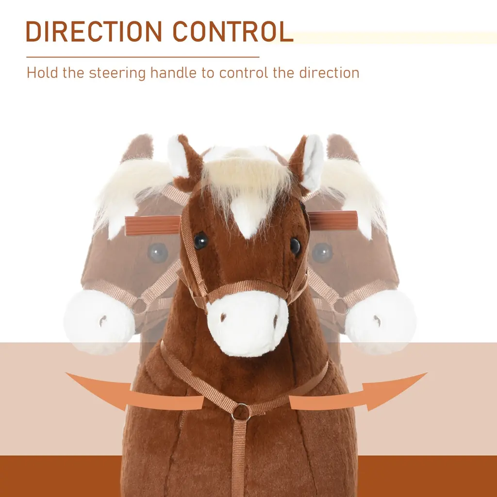 Interactive Large Ride-On Rocking Horse For Kids Aged 5-16, Plush Body With Rolling Wheels - Brown