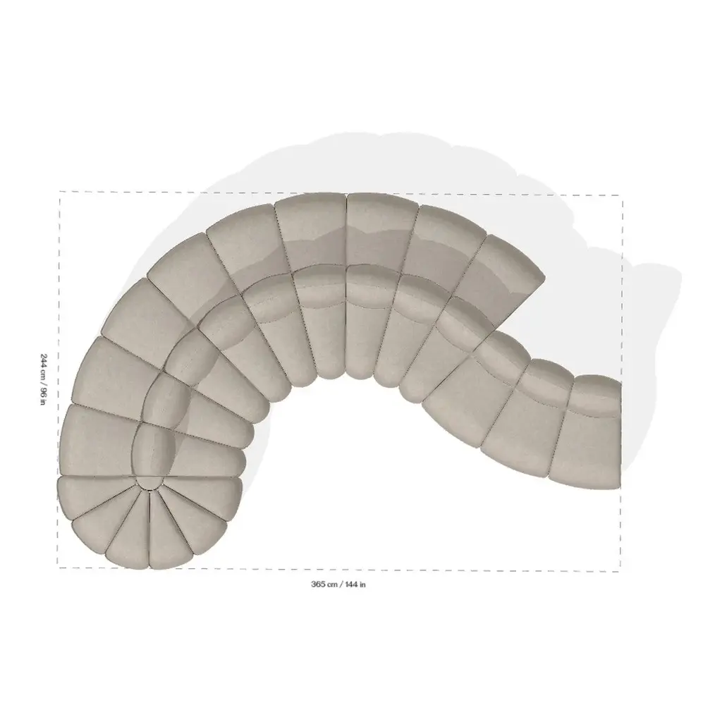 Inspired by iconic 70s furniture design and sunken lounge interiors, reinterpreted in a fresh and contemporary way. Suitable for all interiors with endless possibilities and combinations of modules to create a dreamy and fluid space. Jagger is available in two versions; as a lounge sofa or as a higher version suitable for dining. Each version consists of 10 modules of different sizes and shapes to be combined as desired. A minimalistic concept with endless possibilities. Setup Includes: [1] Half Circle [9] Double Corner [3] Soft Curve [1] A. Left Side Upholstery Cover [1] G. Right Side Upholstery Cover