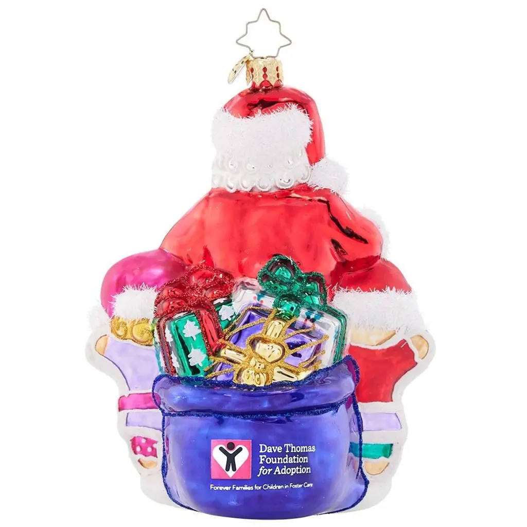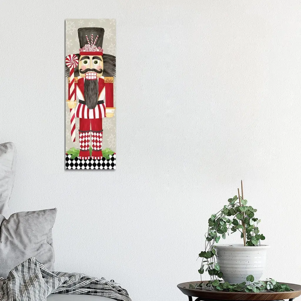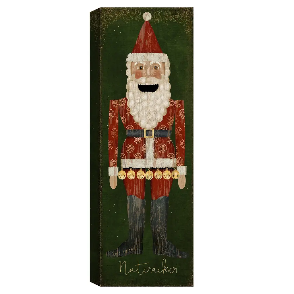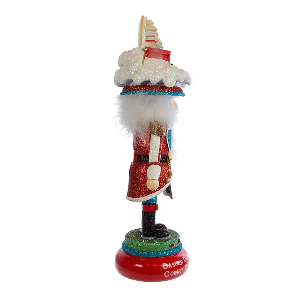 Hollywood Nutcrackers is a whimsical collection of nutcrackers created exclusively for Kurt S. Adler, Inc. and features an assortment of designs that put a unique, vibrant, memorable twist on traditional nutcrackers. This 18-inch nutcracker from Kurt Adler is 5th in the Night Before Christmas series. This nutcracker holds the classic book with a mouse peering over it and wear a glittered hat with 8 tiny reindeer and presents. He stands on a blue and green glittered base with red gemstones, on top a red base with the names of Santa's 8 reindeer inscribed in white.