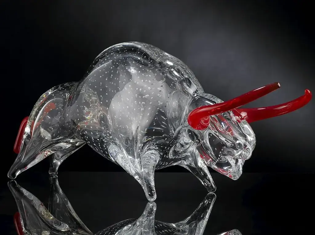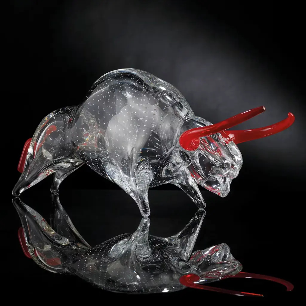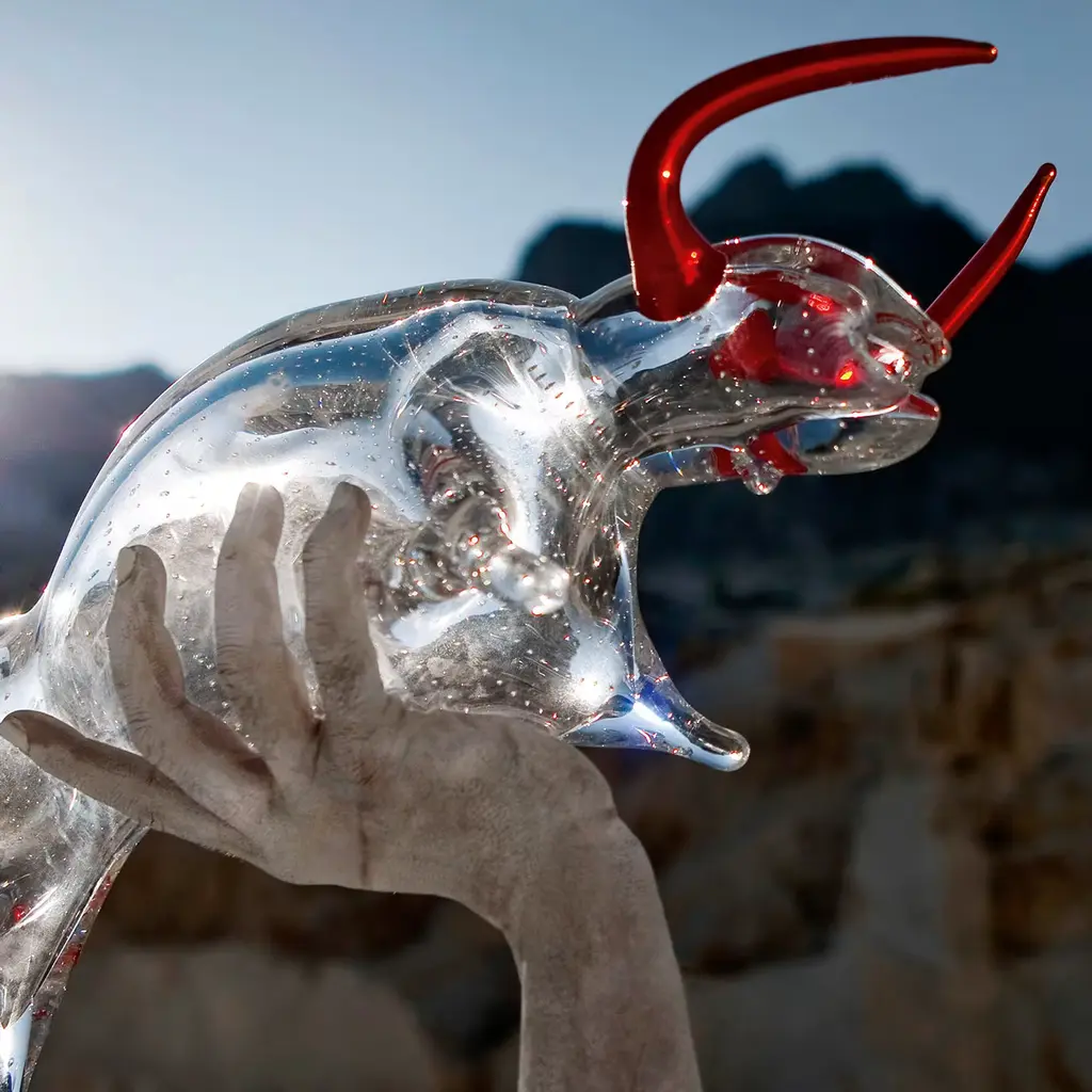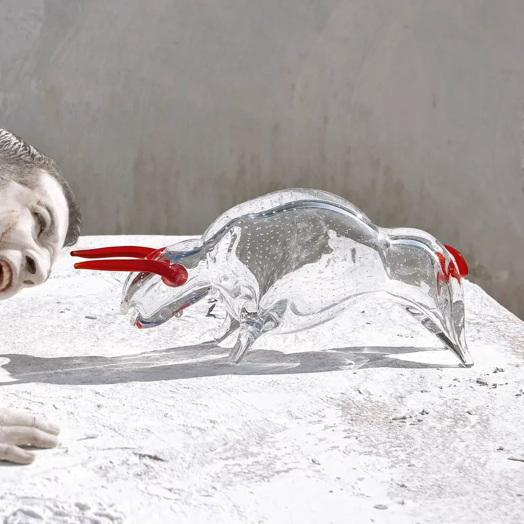 A tribute to Italian glassmaking tradition, this splendid statuette is masterfully crafted by hand. Showcasing a tall (20 cm) and polished silhouette, its natural transparent hue is enhanced with red-colored details for a lively pop of color and additional charm on a living room or entryway console.