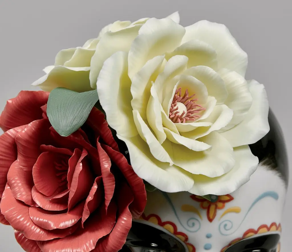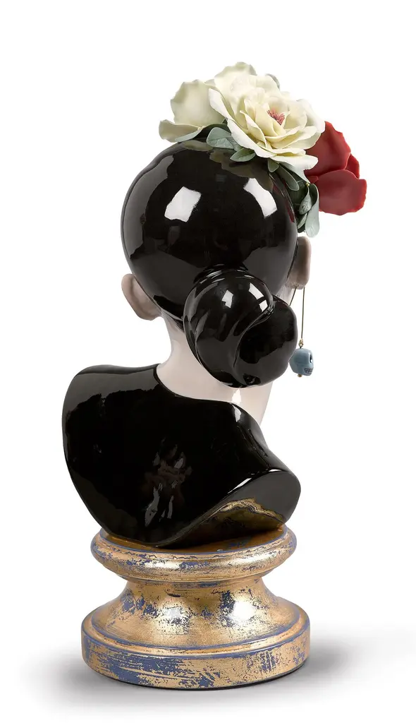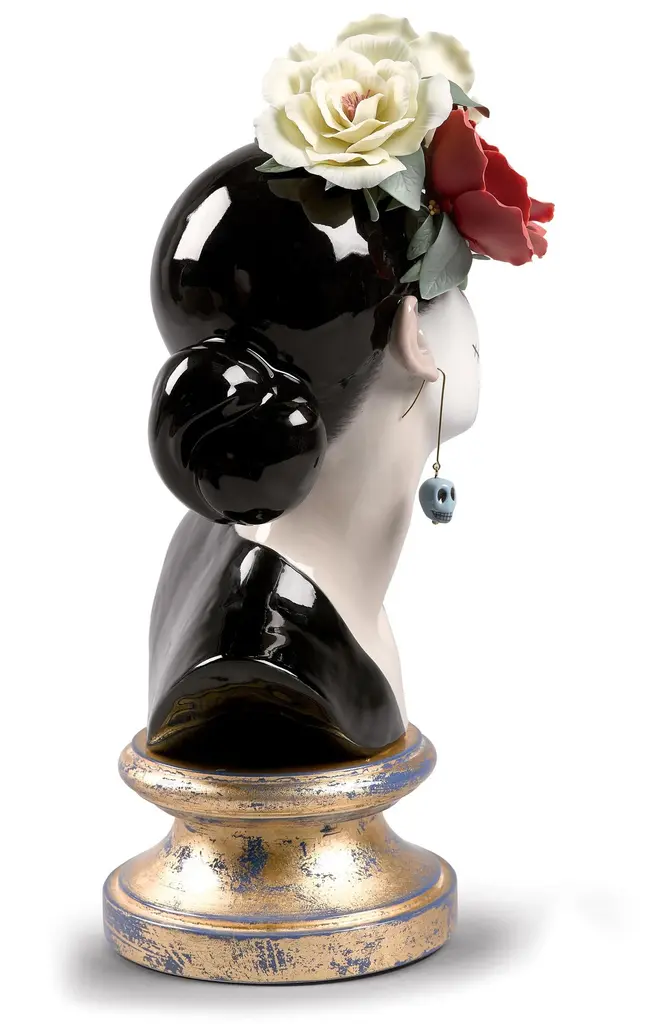 Limited edition Mexican Bella Catrina figurine in black gloss finish porcelain, adorned with three handmade flowers. The people of Mexico have a special relationship with death, to the point that it is part of the culture and daily life of this North American country. The Bella Catrina, conceived in the imagination of the artist Jose Guadalupe Posada, has become part of this rich, popular iconography. This limited edition is richly decorated with colorful motifs characteristic of Mexican tradition and three spectacular flowers carefully modelled, petal by petal. In addition, there is a brass earring with two micron 18-karat gold plating and decorated with porcelain. The antique golden base is inseparably attached to the piece.