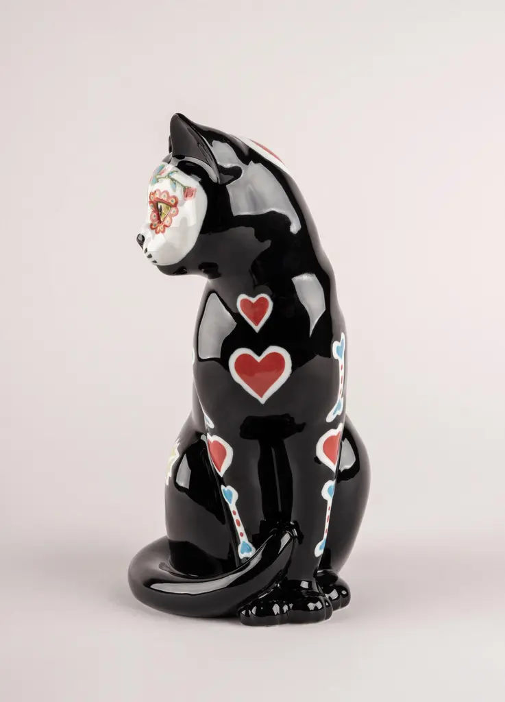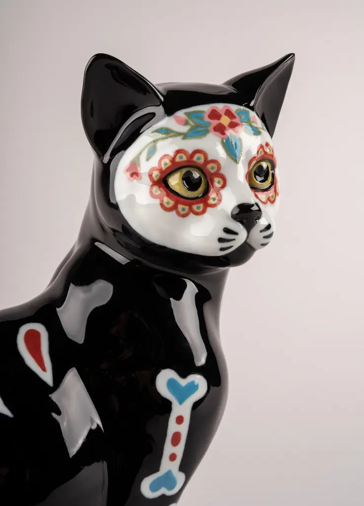 A porcelain figurine inspired by La Catrina, the famous Mexican image of death, this time represented in the guise of a cat. Catrina, the popular icon with which Mexicans celebrate death and remember their ancestors, is represented in the guise of this beautiful cat. Made in glazed porcelain, the elaborate drawings, typical of Catrina, and the different colors used, stand out against the black ground. A creation meticulously decorated by expert hands in the Lladró workshops.