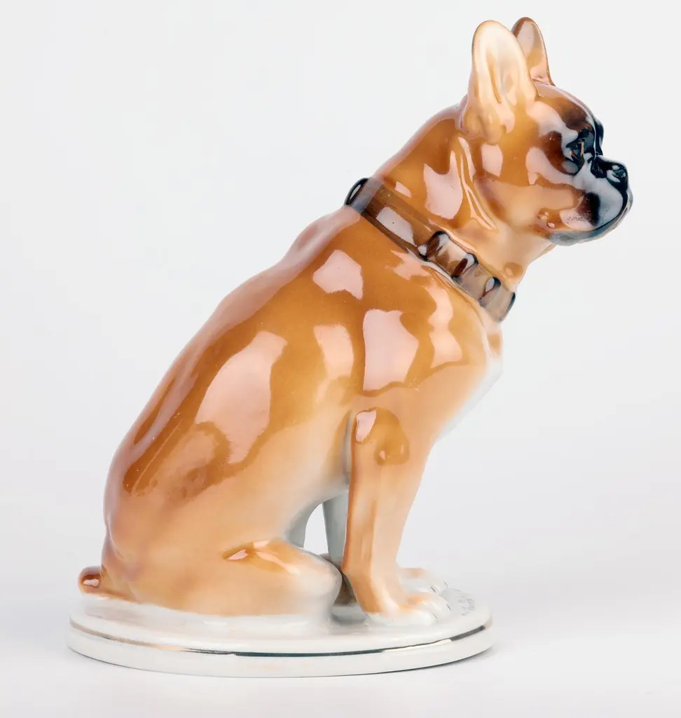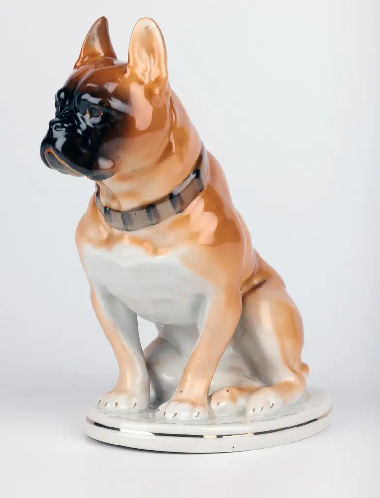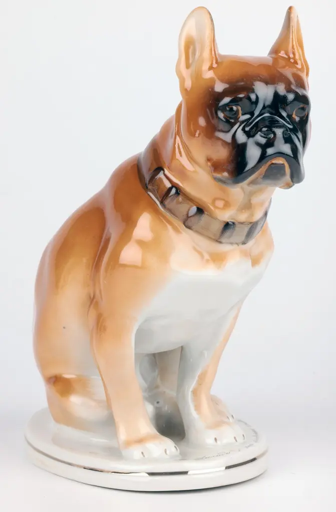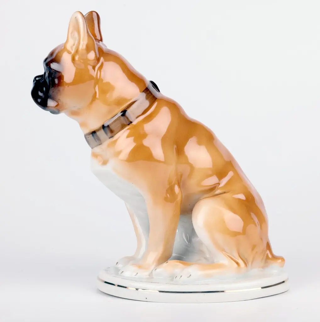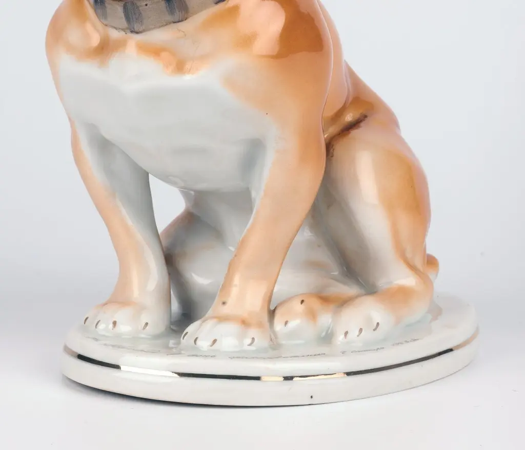 A delightful mid-century Russian hand-painted porcelain figure of a seated Bulldog on a plinth with an inscription around the base by Lomonosov and dated 1963. The well modelled figure of a large bulldog sits raised on an oval integral base with an unglazed foot and sits with his rear paws folded to one side, the tail resting on the base and with his head facing slightly to one side and with ears raised. The bulldog wearing a leather studded collar is well detailed and proportioned and has nicely defined facial details with hand painted features and body in tones of brown with the base and paws finished in a white glazed with a gilded rim around the base. The base has an inscription around the top edge along with a date 1963. The figure has a blue printed underglaze Lomonosov mark to the base. Provenance: from a collection of dog figures acquired through the UK Art Market.In good condition with light wear associated with age and use.