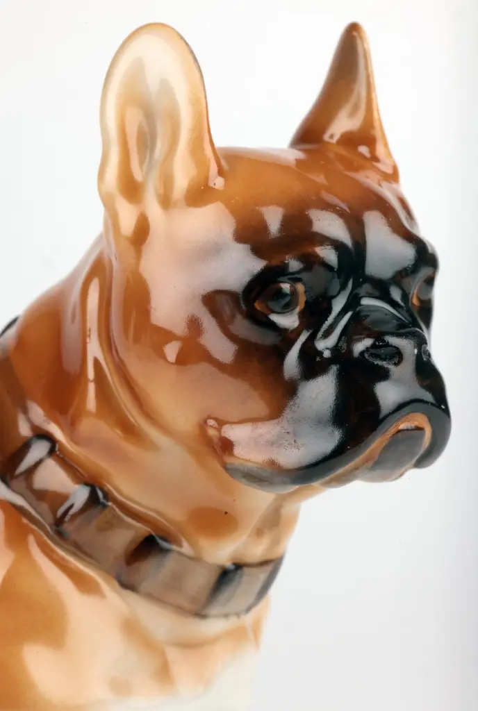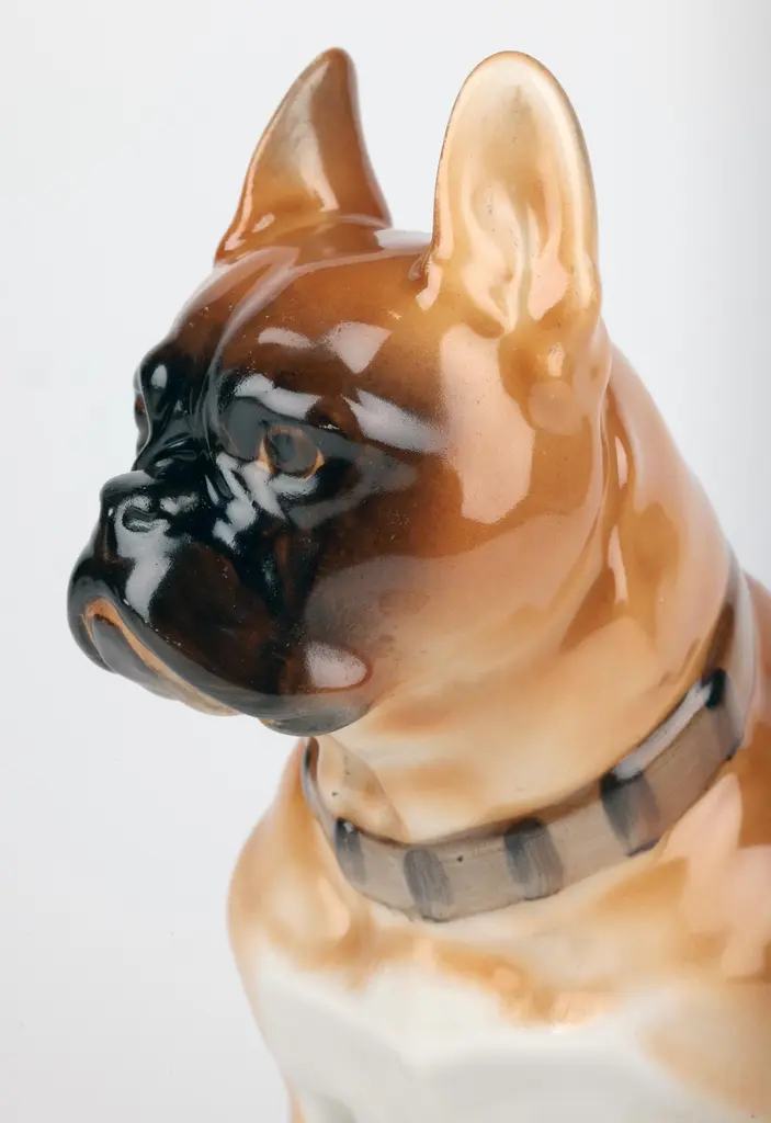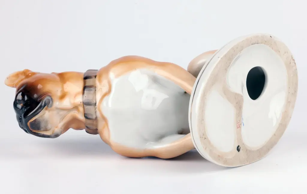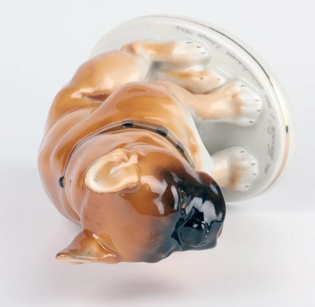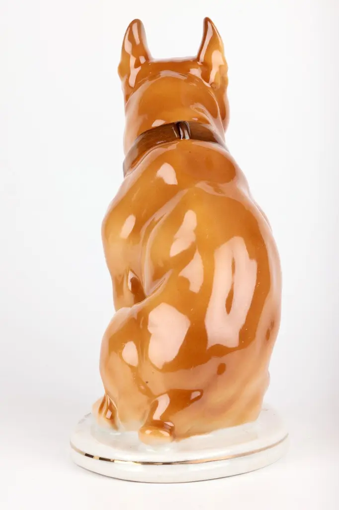 A delightful mid-century Russian hand-painted porcelain figure of a seated Bulldog on a plinth with an inscription around the base by Lomonosov and dated 1963. The well modelled figure of a large bulldog sits raised on an oval integral base with an unglazed foot and sits with his rear paws folded to one side, the tail resting on the base and with his head facing slightly to one side and with ears raised. The bulldog wearing a leather studded collar is well detailed and proportioned and has nicely defined facial details with hand painted features and body in tones of brown with the base and paws finished in a white glazed with a gilded rim around the base. The base has an inscription around the top edge along with a date 1963. The figure has a blue printed underglaze Lomonosov mark to the base. Provenance: from a collection of dog figures acquired through the UK Art Market.In good condition with light wear associated with age and use.