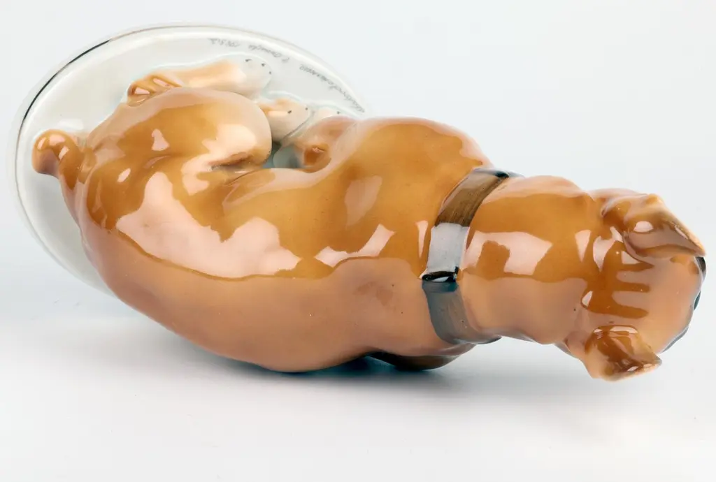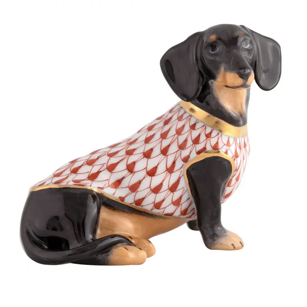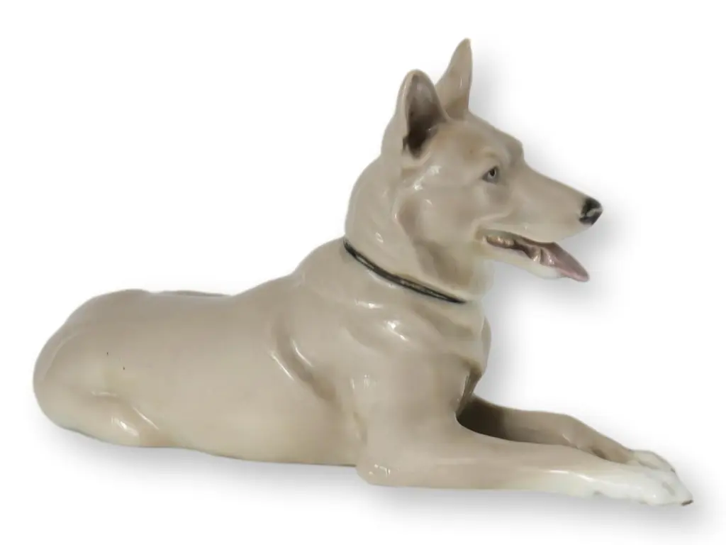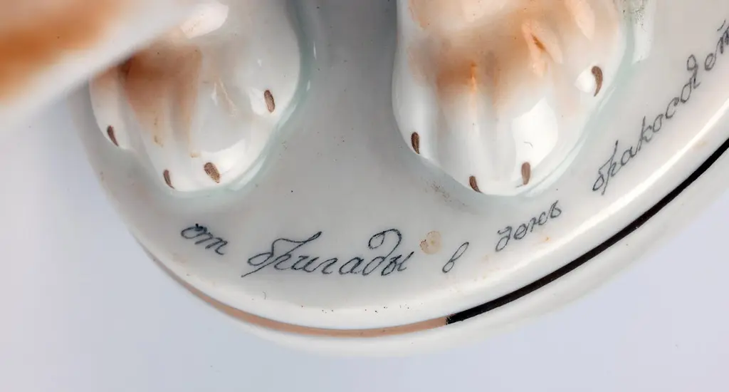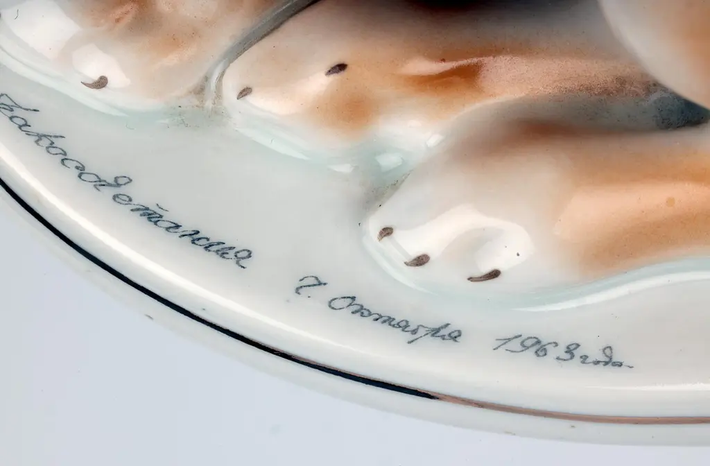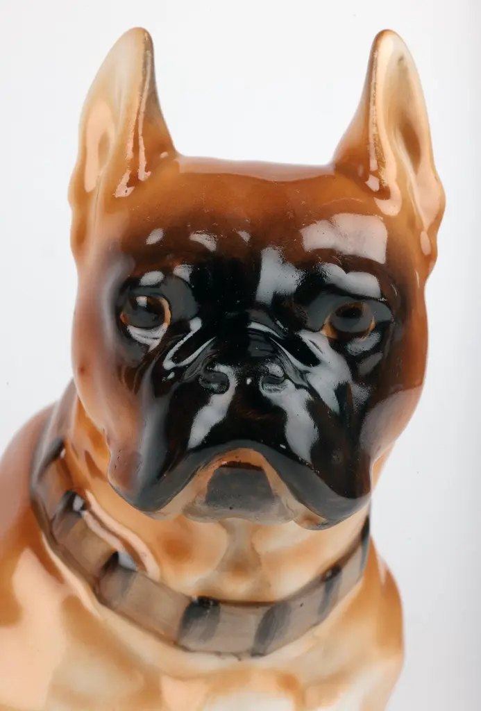 A delightful mid-century Russian hand-painted porcelain figure of a seated Bulldog on a plinth with an inscription around the base by Lomonosov and dated 1963. The well modelled figure of a large bulldog sits raised on an oval integral base with an unglazed foot and sits with his rear paws folded to one side, the tail resting on the base and with his head facing slightly to one side and with ears raised. The bulldog wearing a leather studded collar is well detailed and proportioned and has nicely defined facial details with hand painted features and body in tones of brown with the base and paws finished in a white glazed with a gilded rim around the base. The base has an inscription around the top edge along with a date 1963. The figure has a blue printed underglaze Lomonosov mark to the base. Provenance: from a collection of dog figures acquired through the UK Art Market.In good condition with light wear associated with age and use.