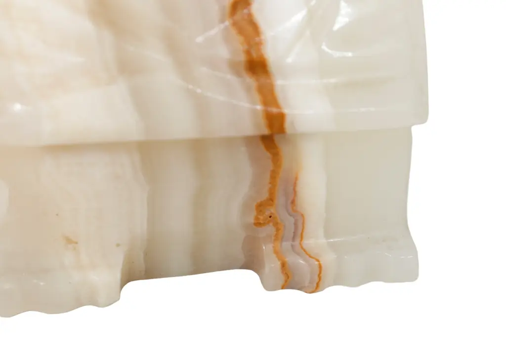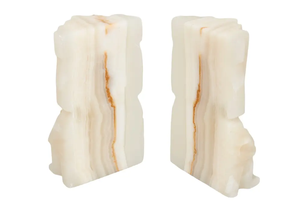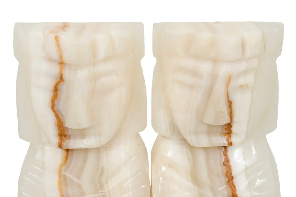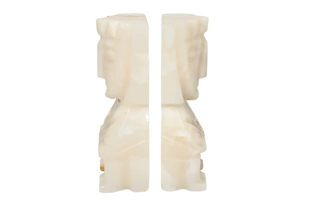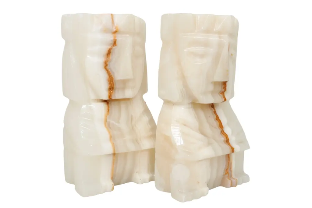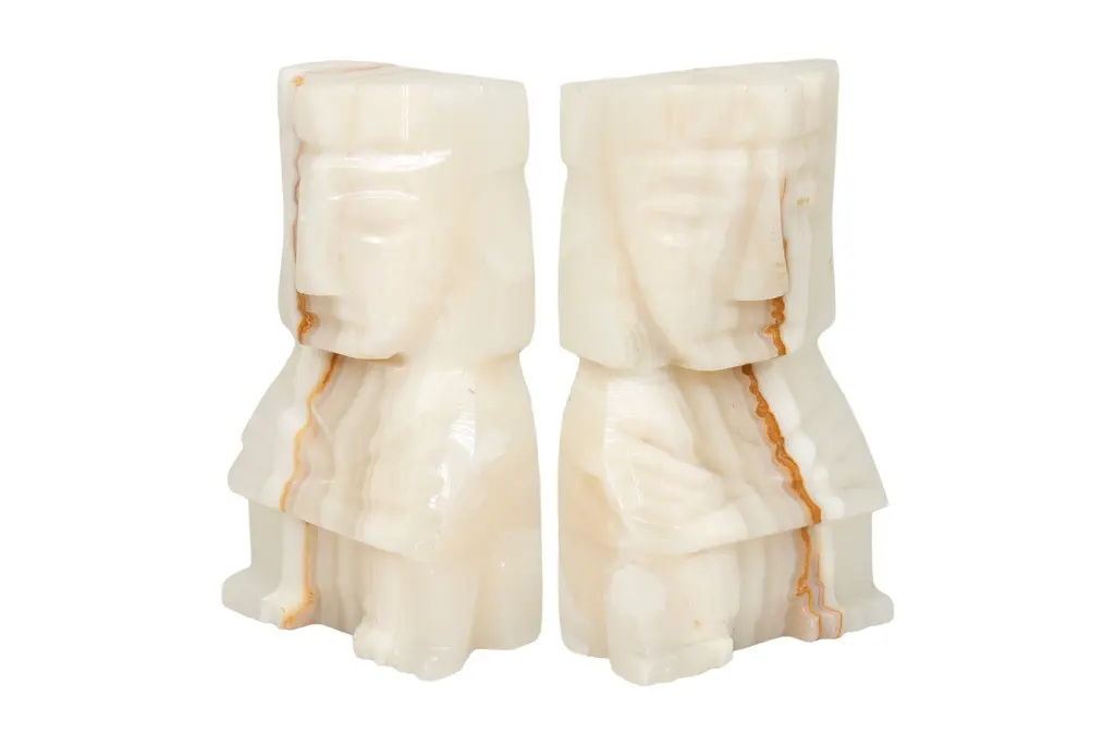 A pair of agate bookends carved in the shape of Mayan figures in a seated position. Simple lines define the face topped with a crown, crossed arms and feet. The richly banded agate has a translucent quality. Dimensions per bookend.