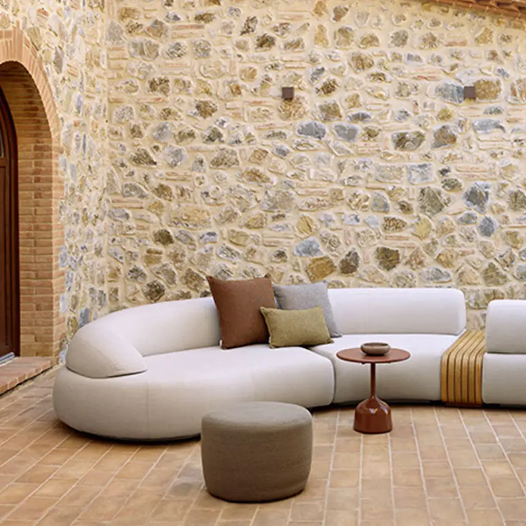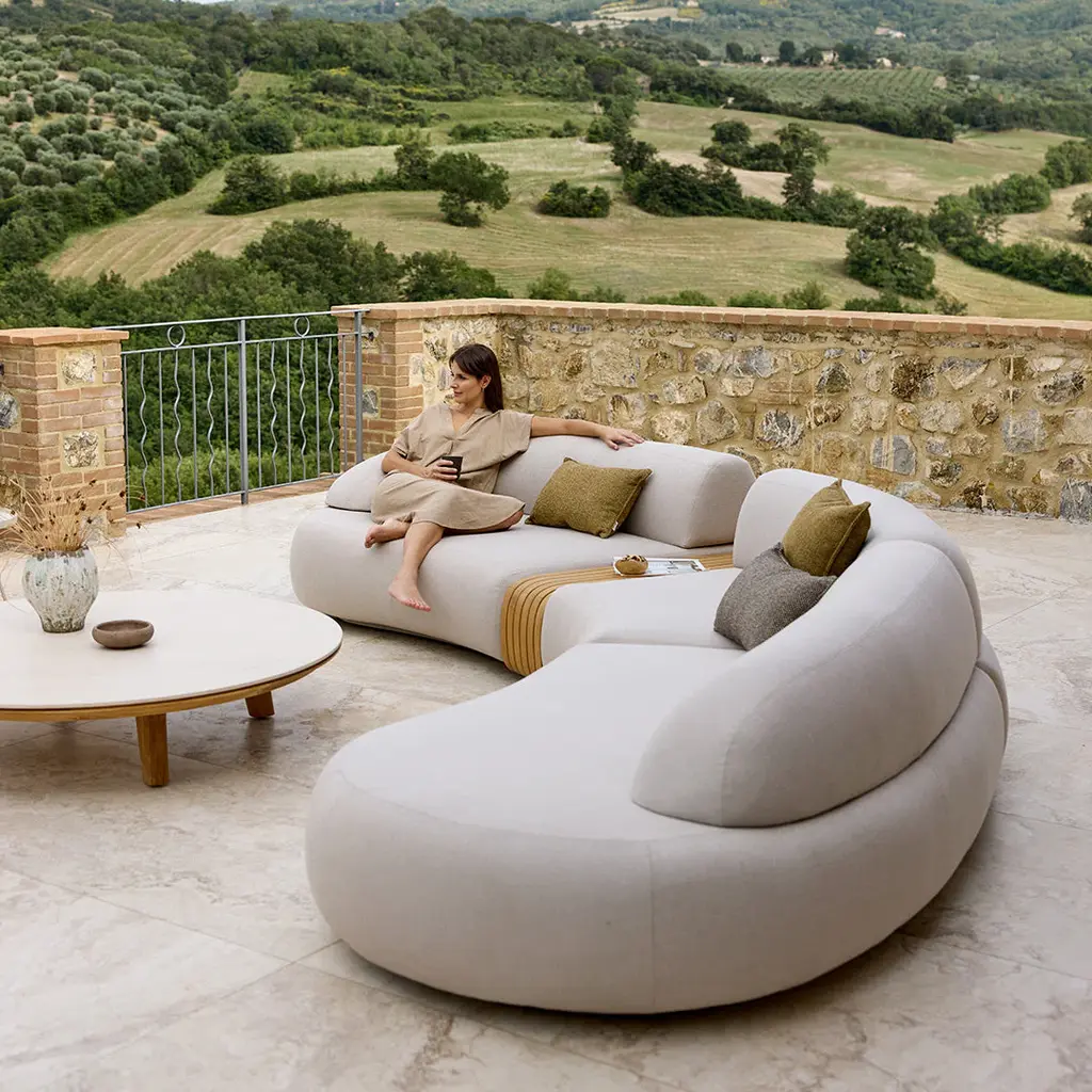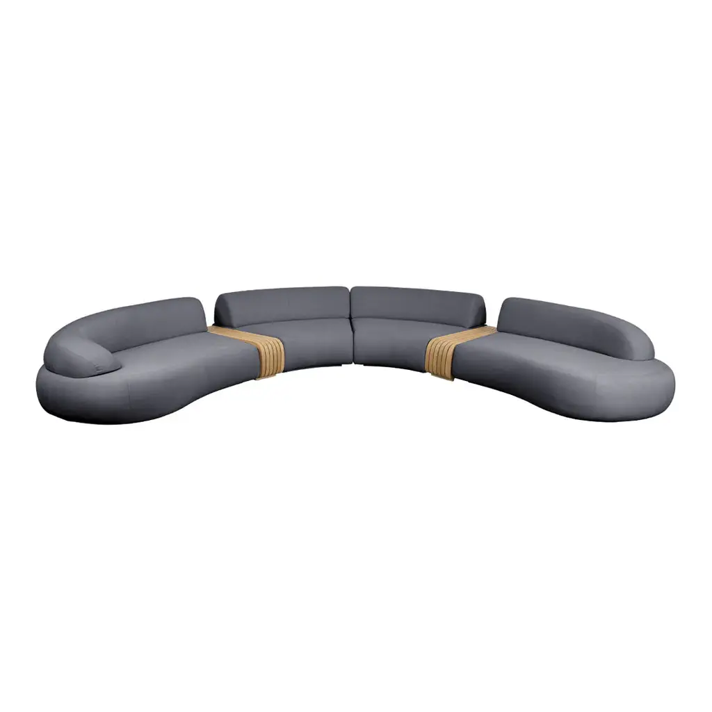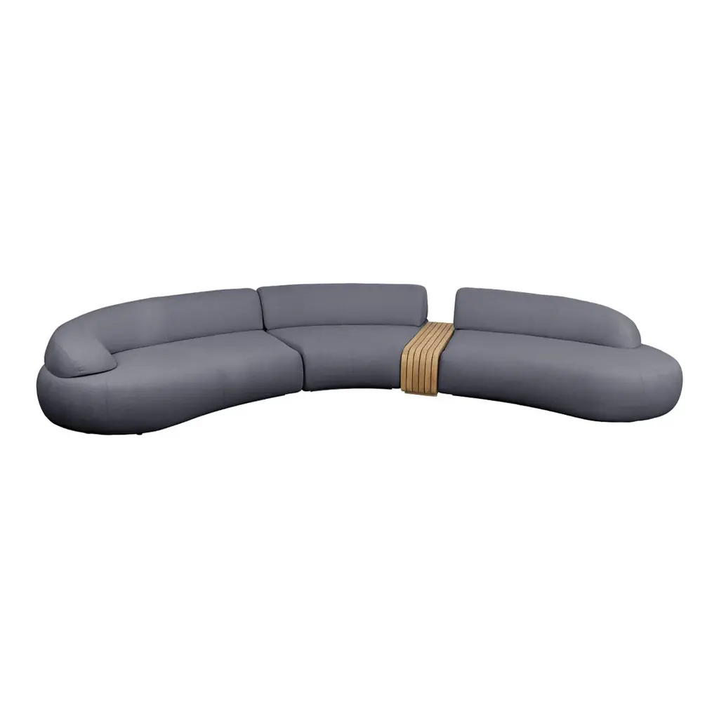 The Mellow sofa by Cane-line Design is a versatile part of the Mellow modular lounge configuration. Mellow module is fully upholstered and features Mellow's eye-catching design details, such as curvy lines and low seating height. Beneath the soft cushions is a strong aluminium frame, ensuring both durability and comfort. The center module is designed to grow with your needs, allowing you to upsize your lounge by easily adding extra modules. This flexibility makes Mellow perfect for creating a personalized outdoor lounge area that suits your needs and style. Setup Includes: [1] Left w/ Short Backrest [1] Right w/ Long Backrest [1] Center [1] Coffee Table