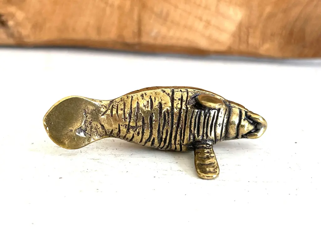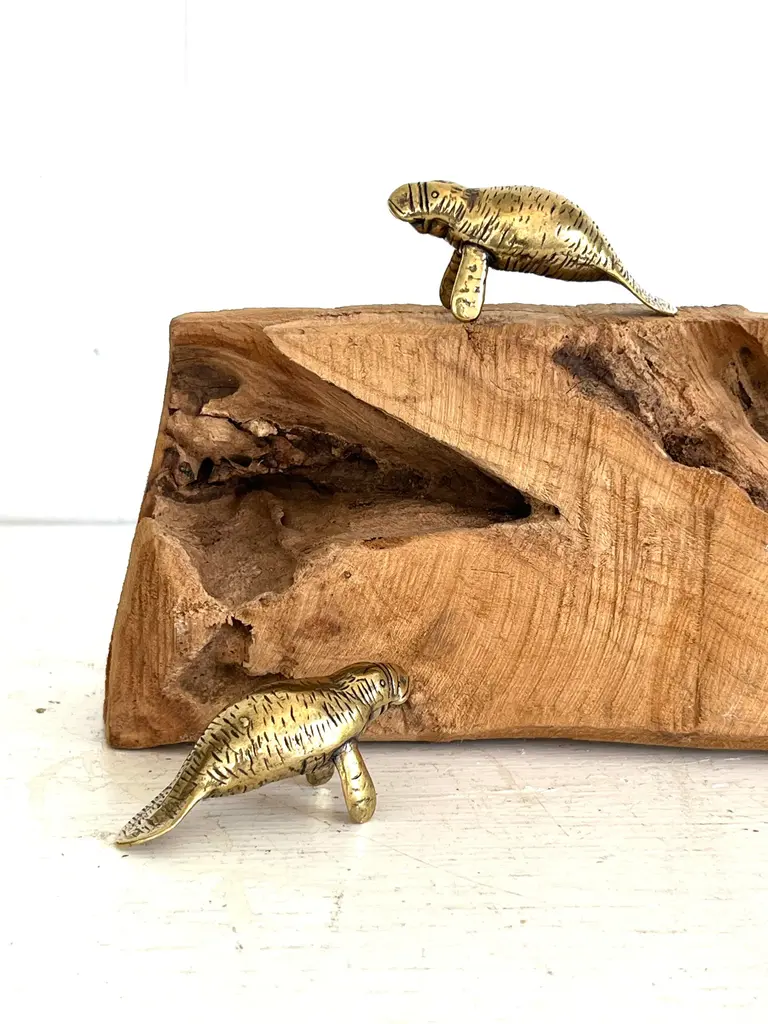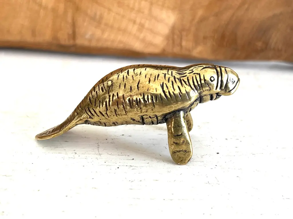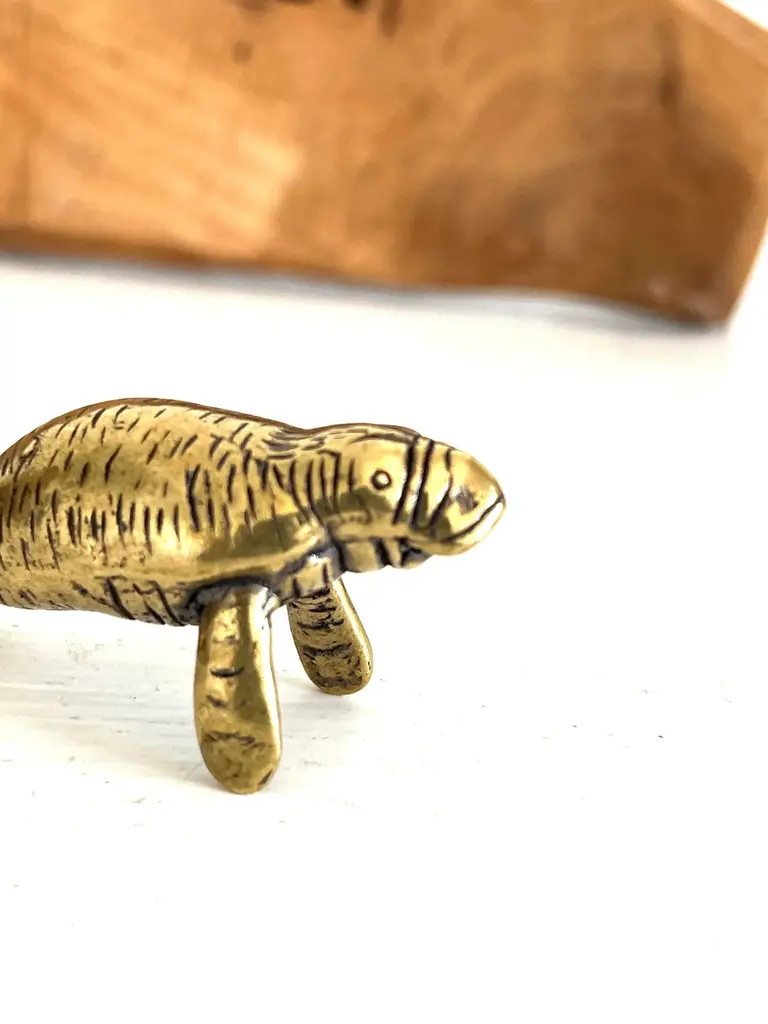 Adorable miniature cast brass manatees. Perfect size for a shadow box. They have lots of detail and are in excellent condition. The brass finish has been antiqued. There are no markings as to the artist or manufacturer. These were purchased in a lot of NOS (new old stock) from a long closed vintage shop.