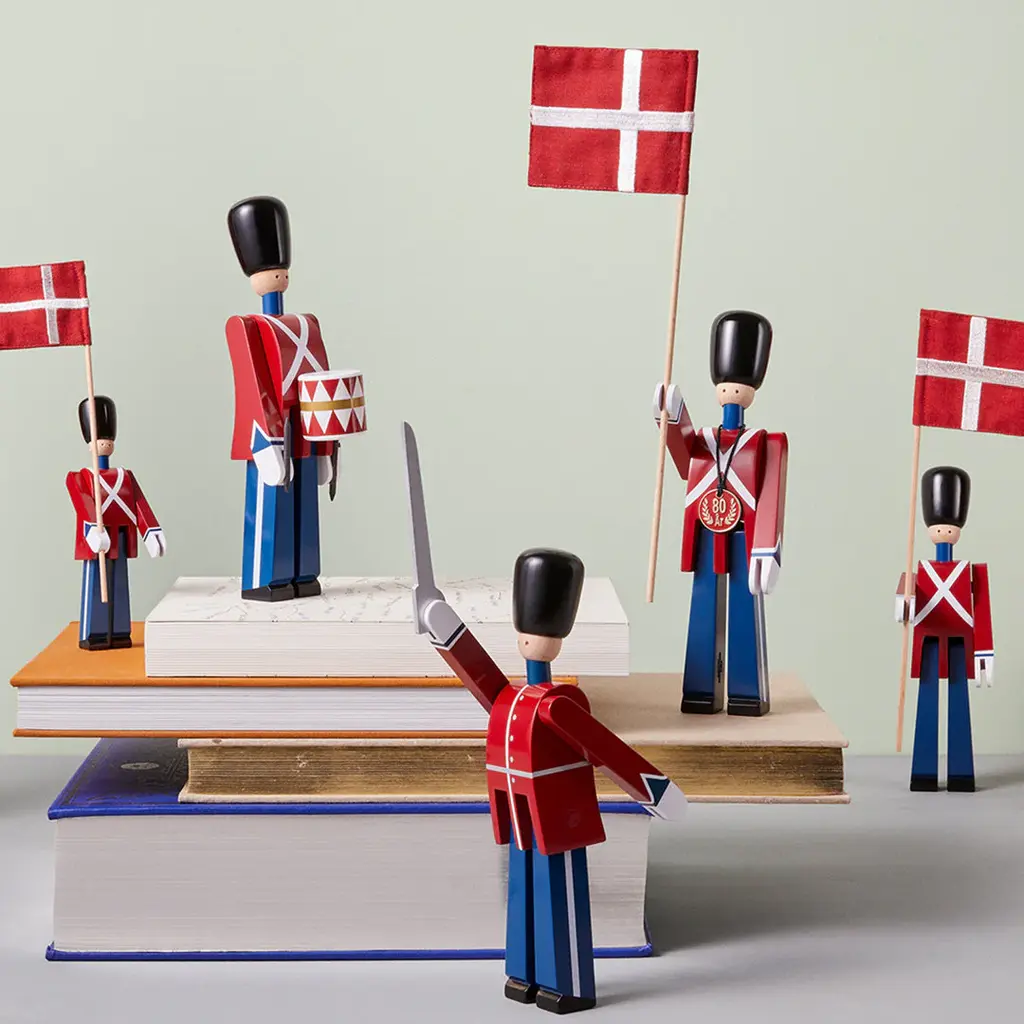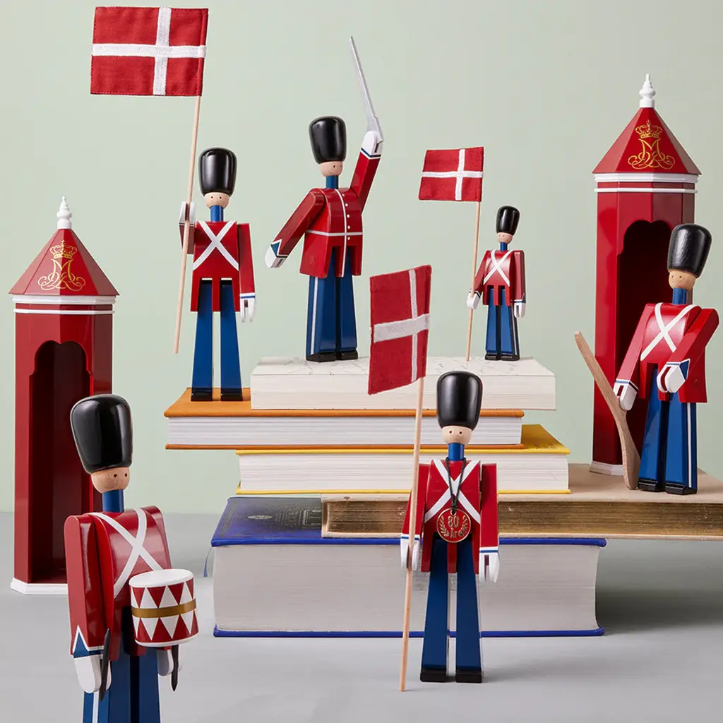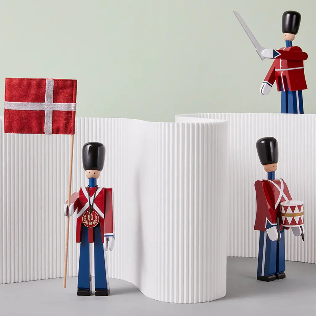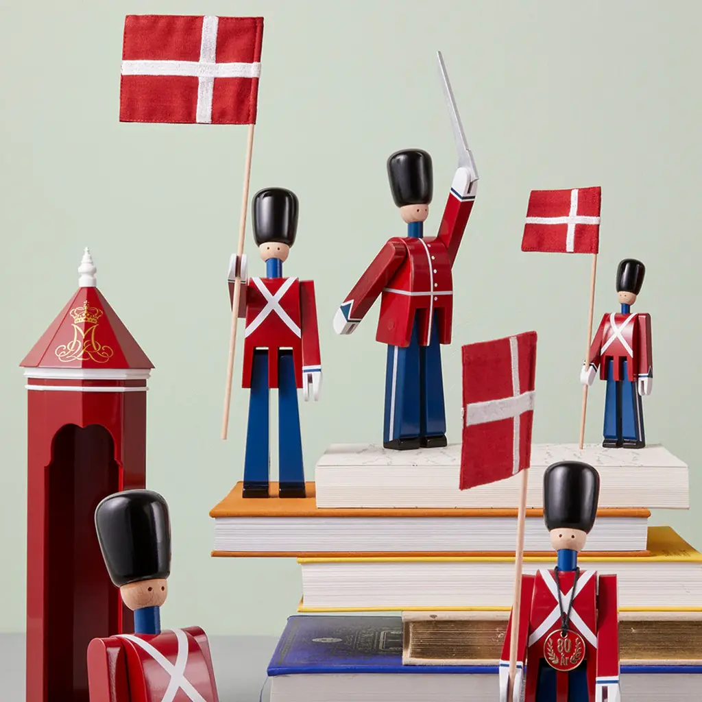 Find the cute and little Officer with a saber and in red, blue and white colors. This smaller version from Danish Kay Bojesen is made of FSC-certified wood and paper. This means that no more wood has been felled than what the forest itself can reproduce. The officer first saw the light of day in 1940 in connection with King Christian X's 70th birthday and was a tribute to the Danish king. Back then, the fine wooden figure and the other soldiers were about a meter tall. Fortunately, it only took two years before the fine soldiers were launched in smaller versions. With the beautiful Officer, you can therefore invite a piece of Danish history into your home – an obvious guest on the birthday breakfast table, as a nice gift for the soldier and for those who appreciate Danish design. With his saber, the little Officer can stand proudly on the table as the leader of the Regiment.