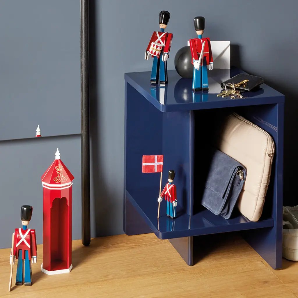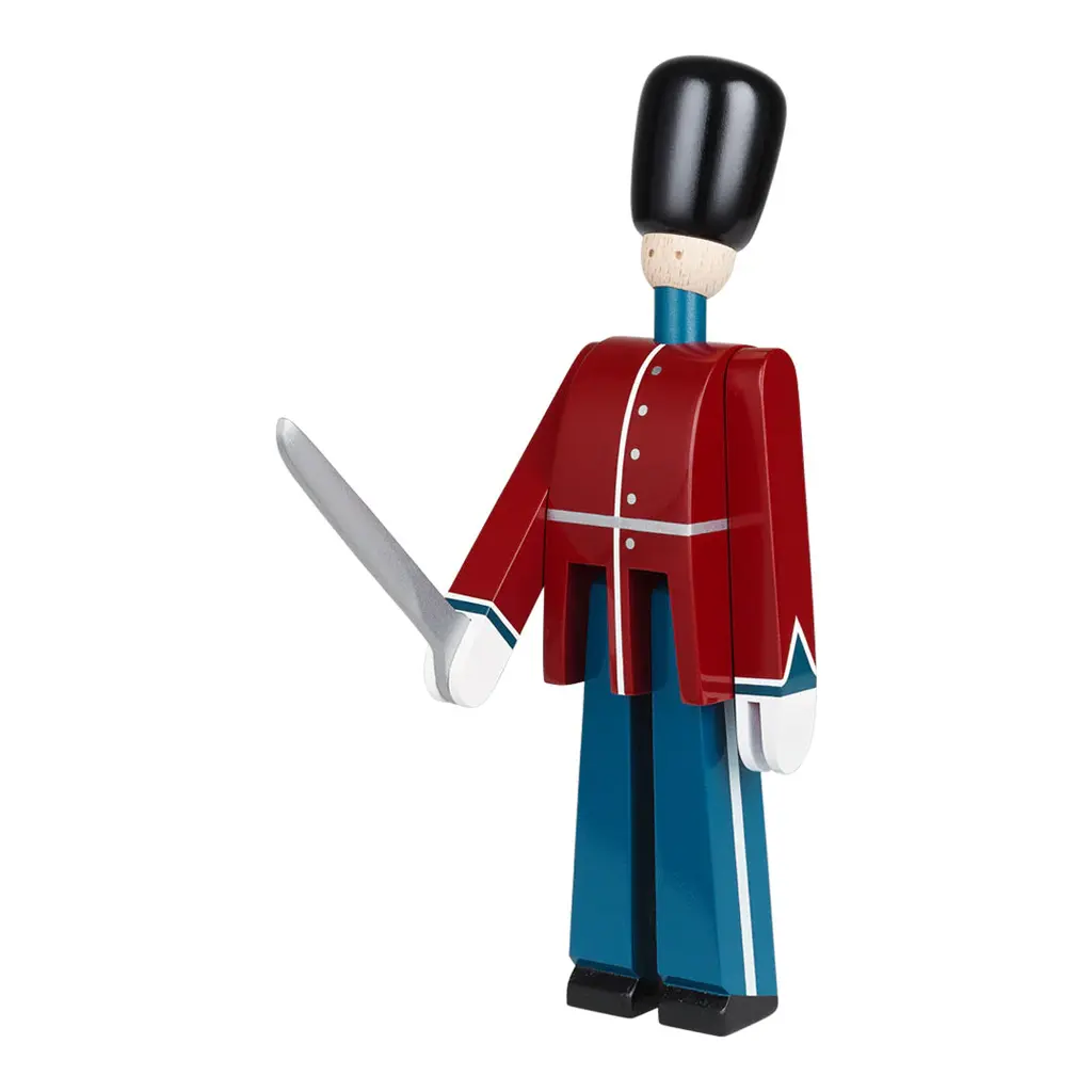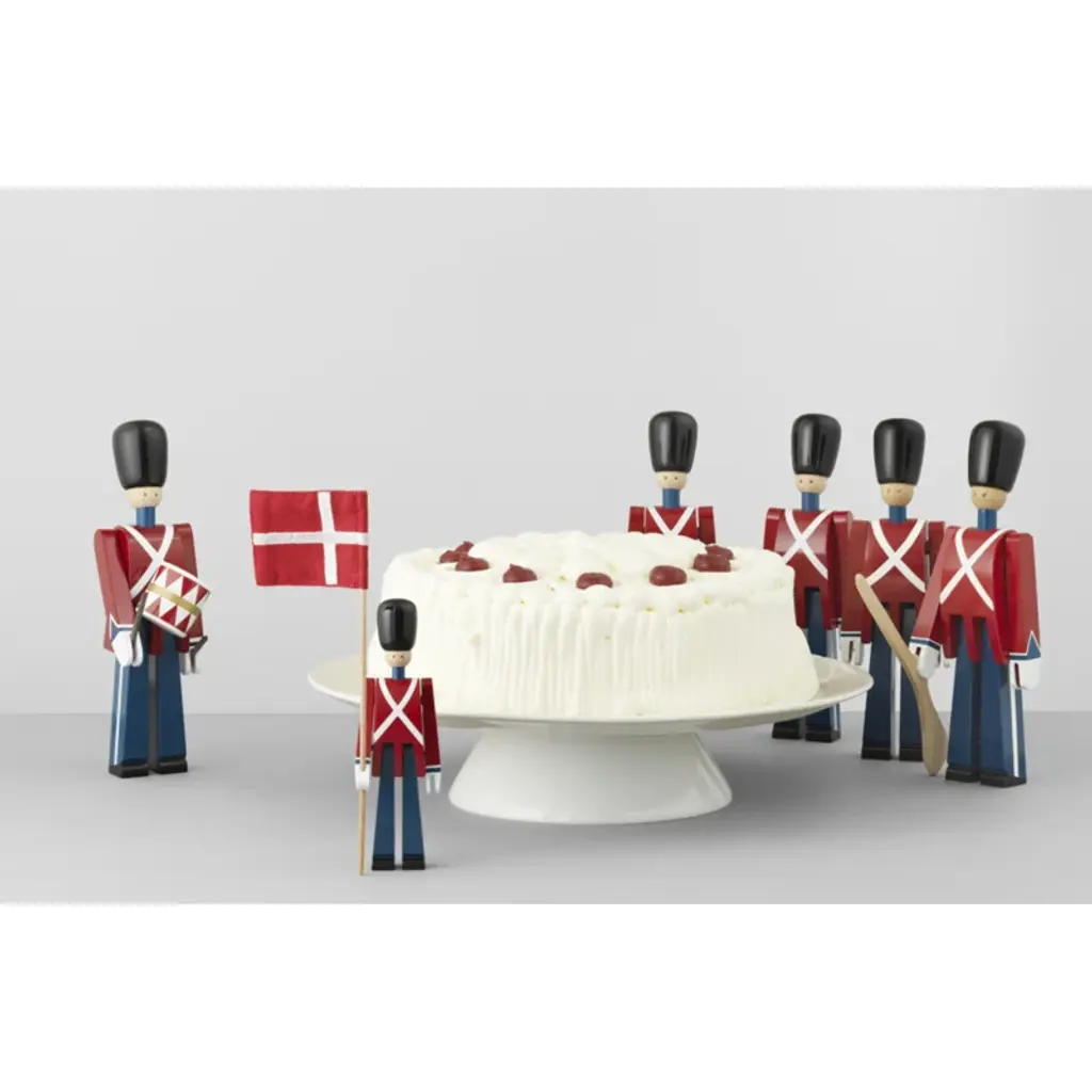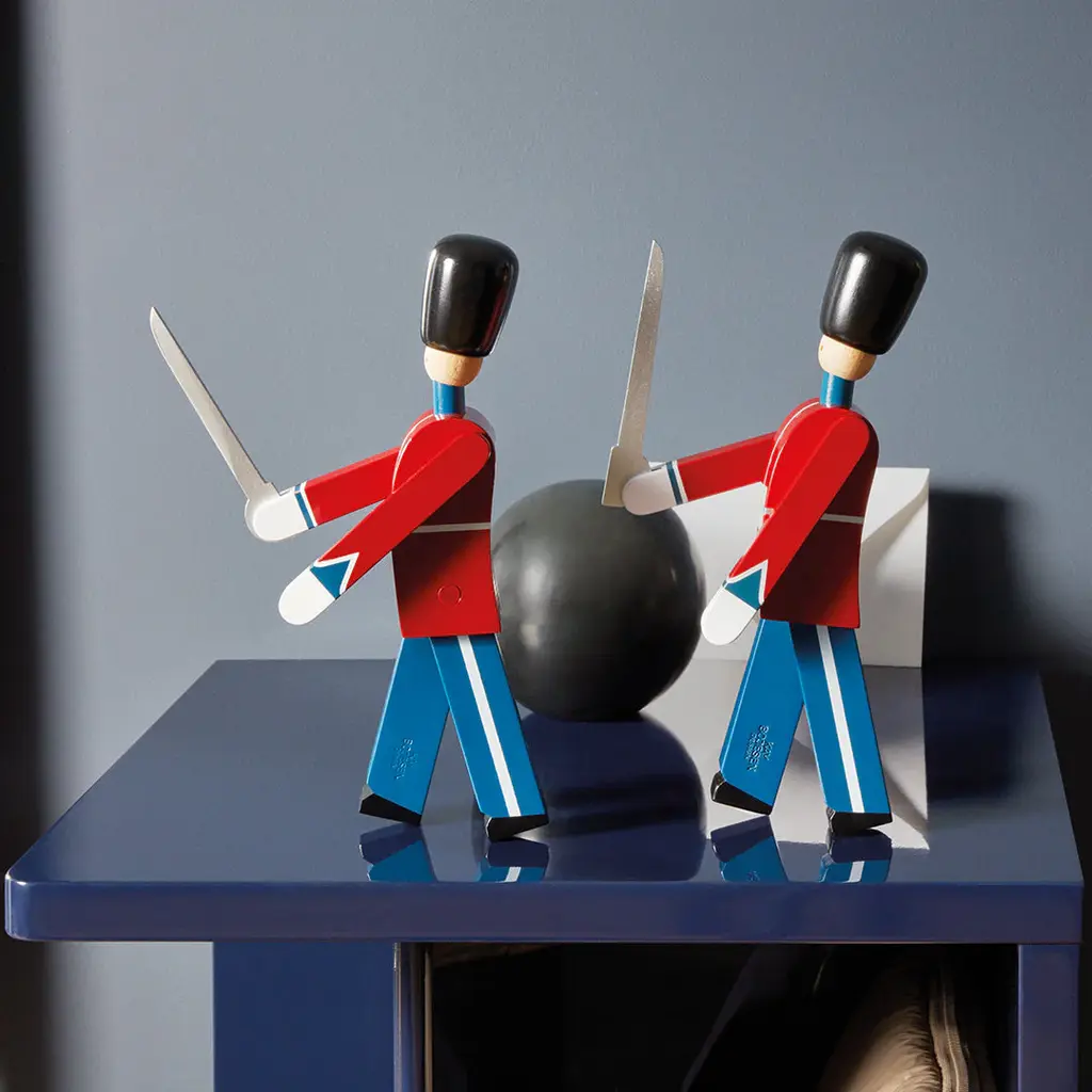 Find the cute and little Officer with a saber and in red, blue and white colors. This smaller version from Danish Kay Bojesen is made of FSC-certified wood and paper. This means that no more wood has been felled than what the forest itself can reproduce. The officer first saw the light of day in 1940 in connection with King Christian X's 70th birthday and was a tribute to the Danish king. Back then, the fine wooden figure and the other soldiers were about a meter tall. Fortunately, it only took two years before the fine soldiers were launched in smaller versions. With the beautiful Officer, you can therefore invite a piece of Danish history into your home – an obvious guest on the birthday breakfast table, as a nice gift for the soldier and for those who appreciate Danish design. With his saber, the little Officer can stand proudly on the table as the leader of the Regiment.