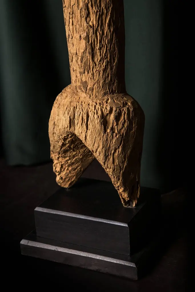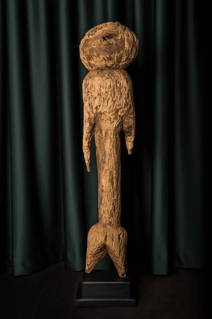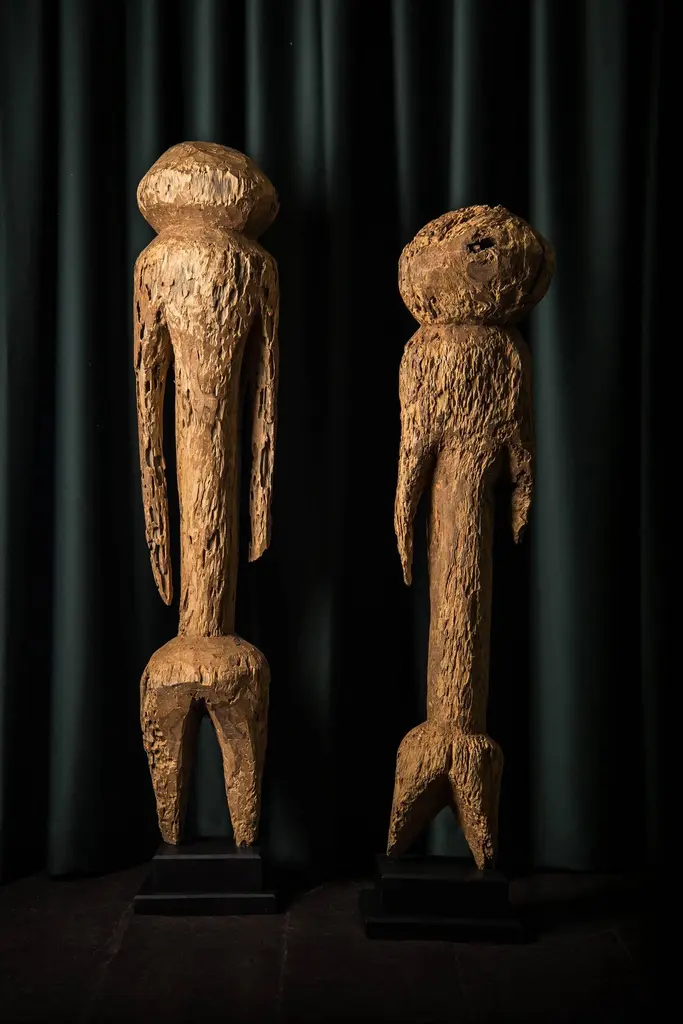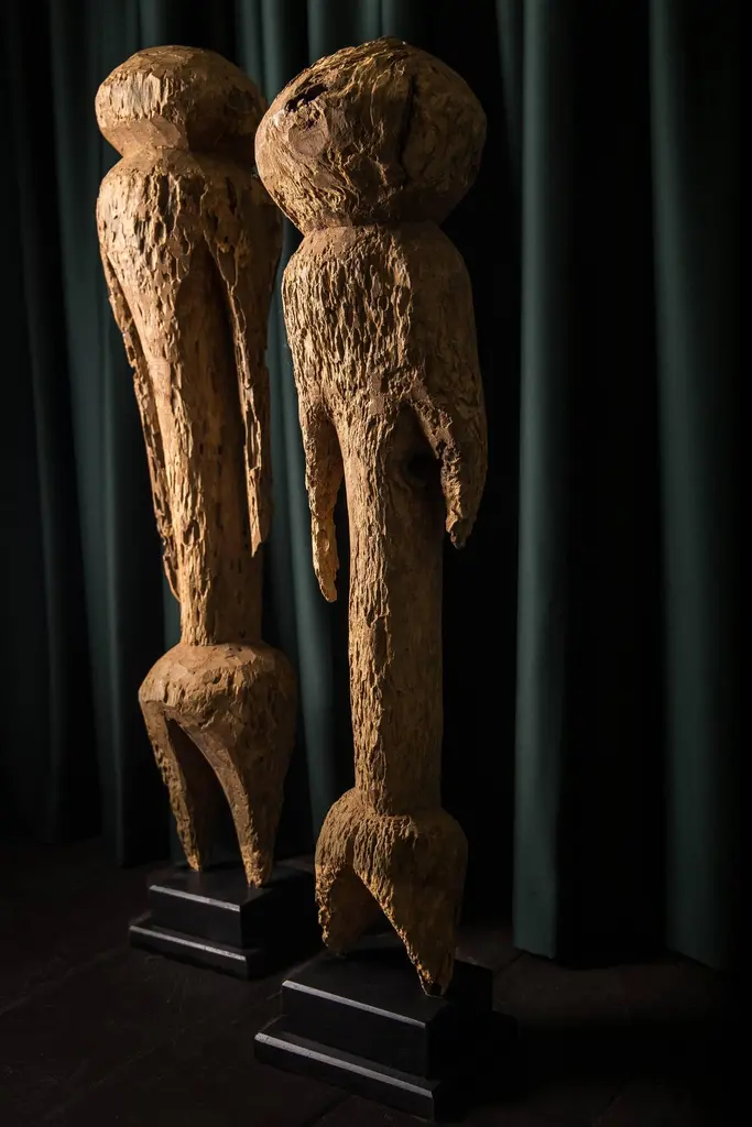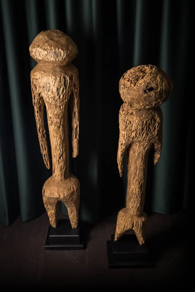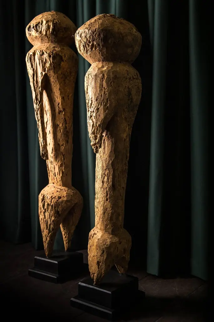 Striking in form, of light highly textured wood, two highly stylized anthropomorphic figures carved by the Moba people in Togo, West Africa. These forms most probably we owned by a family or clan and played a vital role in assuring their collective well-being.In Moba society, when ancestral offerings fail to provide an individual with desired relief, an earth oracle with an established reputation is consulted. These Moba diviners prescribe Tchitcheri figures to fortify their clients and improve their lives. Such works call forth positive ancestral influences, they are protective and promote health and prosperity on a range of different levels. The highly standardized design of Tchitcheri reduces the human figure to an elemental form. Minimal attention is given to facial features, with a reductive figure the upper body forms a unified, continuous surface, with its arms held at its sides along the length of the torso. The trunk is represented as a recessed rectangle, it narrows and then flares outward slightly to suggest hips. Below, clothes pin like legs are carved as two separate prongs that taper off into narrowed stems. Throughout the weathered surface, abrasion and splits reveal the effects wrought upon the work over time.Originally part of an extensive private collection coming from a colonial estate in West-Africa.Mounted on ebonized wooden plinths.(View our full inventory by searching for 'Toad')