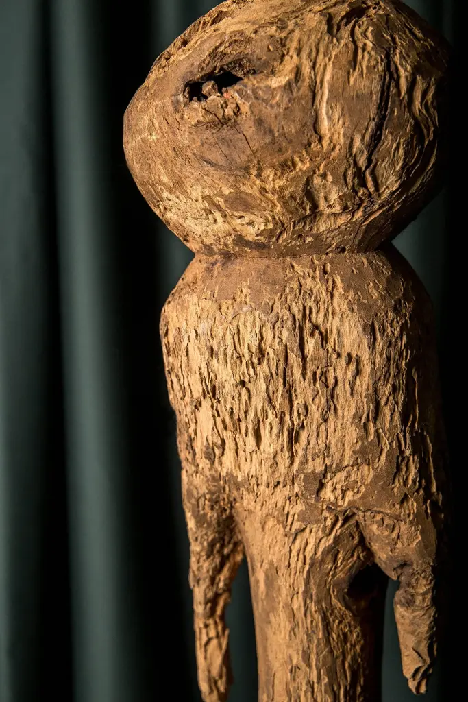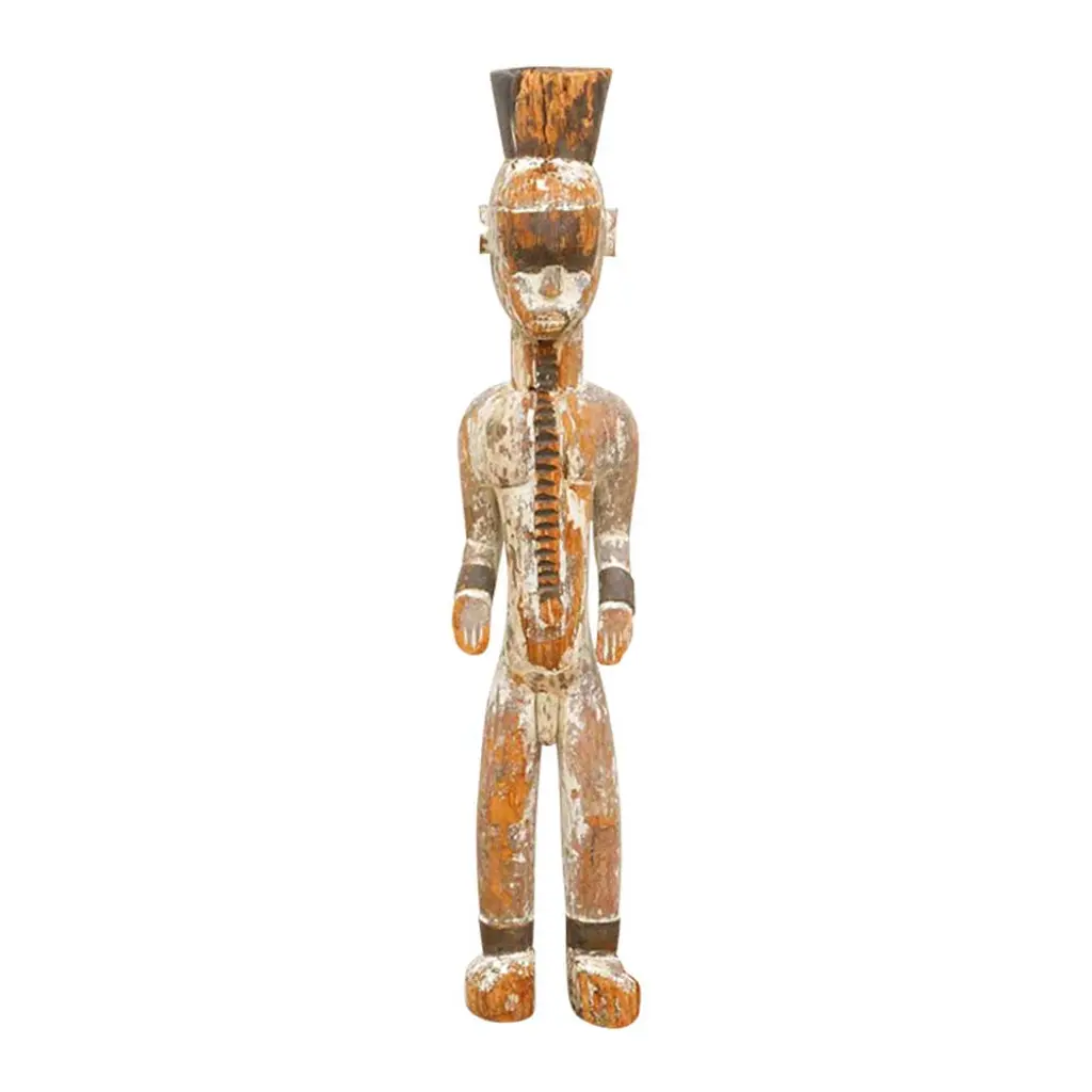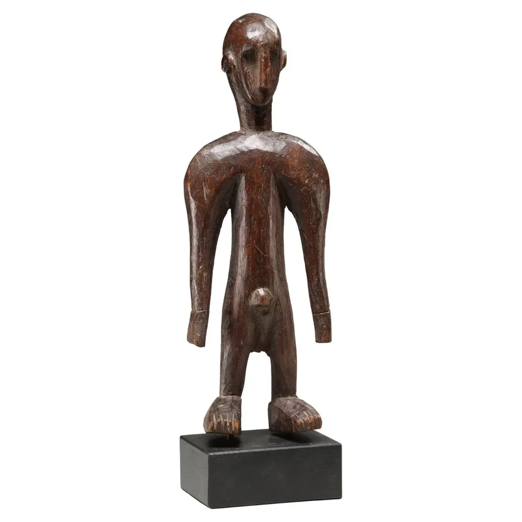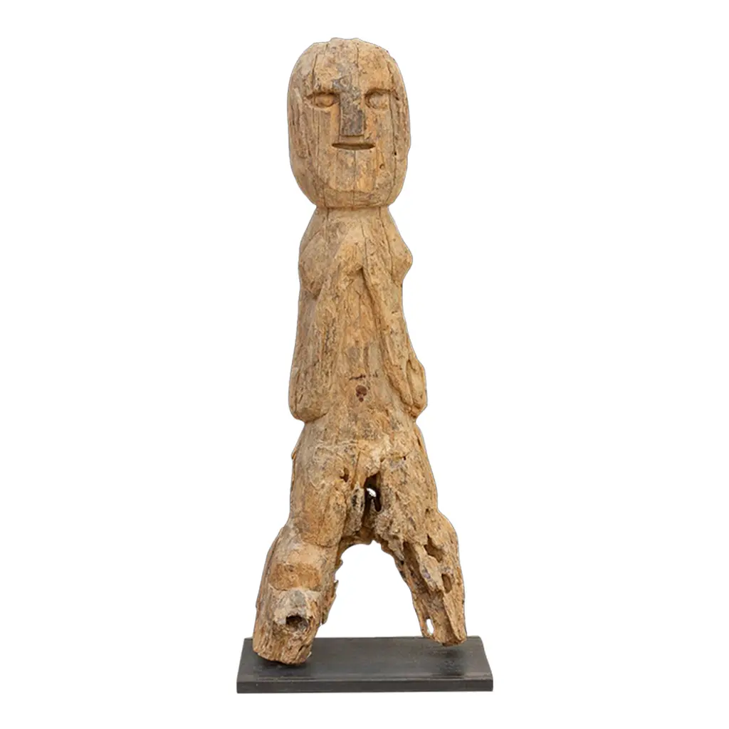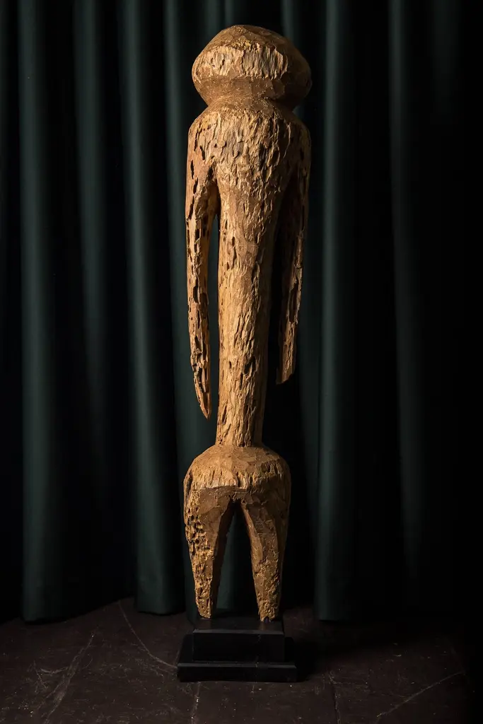 Striking in form, of light highly textured wood, two highly stylized anthropomorphic figures carved by the Moba people in Togo, West Africa. These forms most probably we owned by a family or clan and played a vital role in assuring their collective well-being.In Moba society, when ancestral offerings fail to provide an individual with desired relief, an earth oracle with an established reputation is consulted. These Moba diviners prescribe Tchitcheri figures to fortify their clients and improve their lives. Such works call forth positive ancestral influences, they are protective and promote health and prosperity on a range of different levels. The highly standardized design of Tchitcheri reduces the human figure to an elemental form. Minimal attention is given to facial features, with a reductive figure the upper body forms a unified, continuous surface, with its arms held at its sides along the length of the torso. The trunk is represented as a recessed rectangle, it narrows and then flares outward slightly to suggest hips. Below, clothes pin like legs are carved as two separate prongs that taper off into narrowed stems. Throughout the weathered surface, abrasion and splits reveal the effects wrought upon the work over time.Originally part of an extensive private collection coming from a colonial estate in West-Africa.Mounted on ebonized wooden plinths.(View our full inventory by searching for 'Toad')