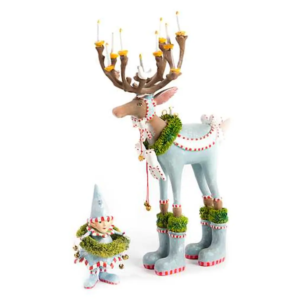 Dash Away, inspired by the Christmas classic “'Twas the Night Before Christmas," features Santa's eight reindeer ready to take flight around the world, assisted by their delightfully dedicated elves, Santa, and Mrs. Santa. The Patience Brewster Dash Away Dasher Reindeer Figure features Dasher, the fearless leader of our Dash Away Reindeer collection. Dasher leads the way dressed in bells and blue. He is adorned with evergreens and carries candles brightly lit upon his antlers for the midnight ride.