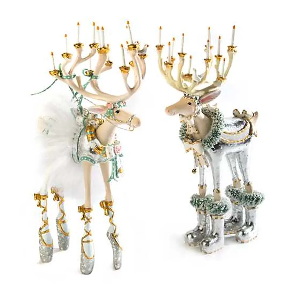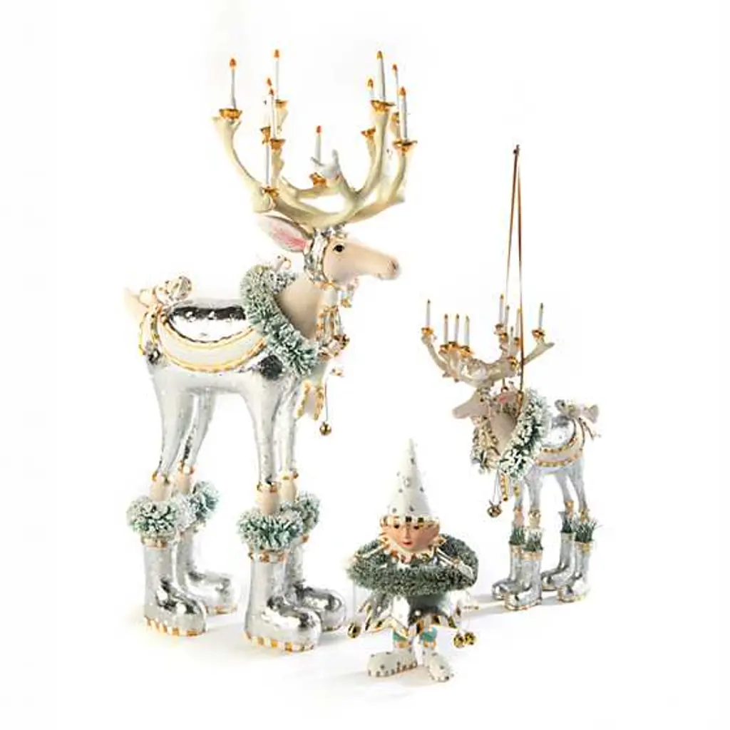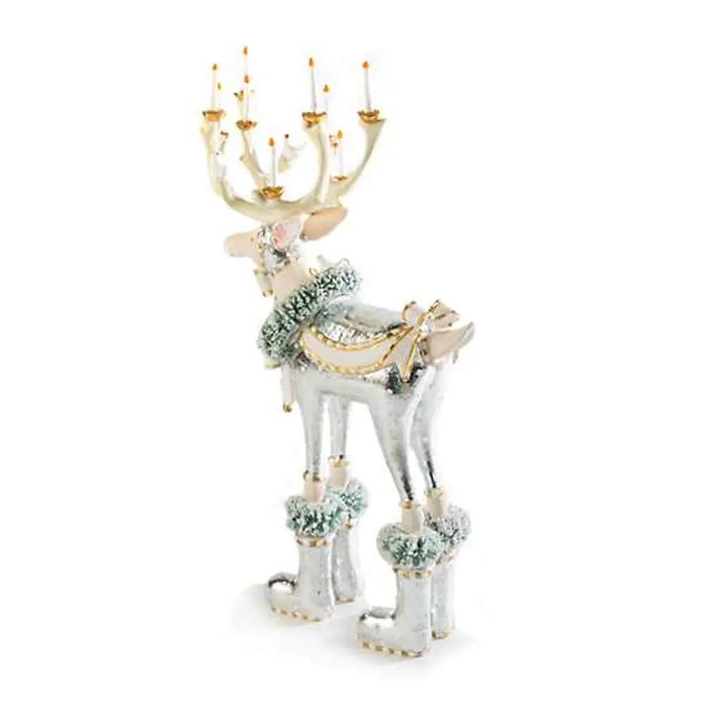 The Patience Brewster Moonbeam Dasher Reindeer Figure is dashing in moon-glow silver and white with touches of gold leaf and a vintage green frosted wreath. The leader of the eight Moonbeam team of reindeer, Dasher is determined and bright. Nine candles light up the doves nestled in his antlers, and his big silver boots will get him and the team through any kind of weather once December comes. Plays well with all Moonbeam reindeer and Santa.