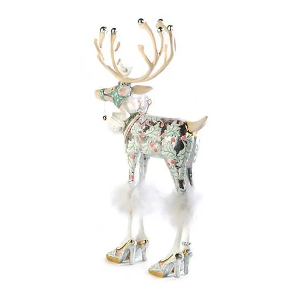 The Patience Brewster Moonbeam Vixen Reindeer Figure loves the spotlight and the moonlight! She's dolled up in a white holly leaf jumpsuit with touches of silver, gold, and vintage green. She has feather-topped stockings and matching high heels, silver gloves, and white doves in her antlers. She aims to outdo and overdo! She runs with Santa and the rest of the reindeer team in the Moonbeam collection.