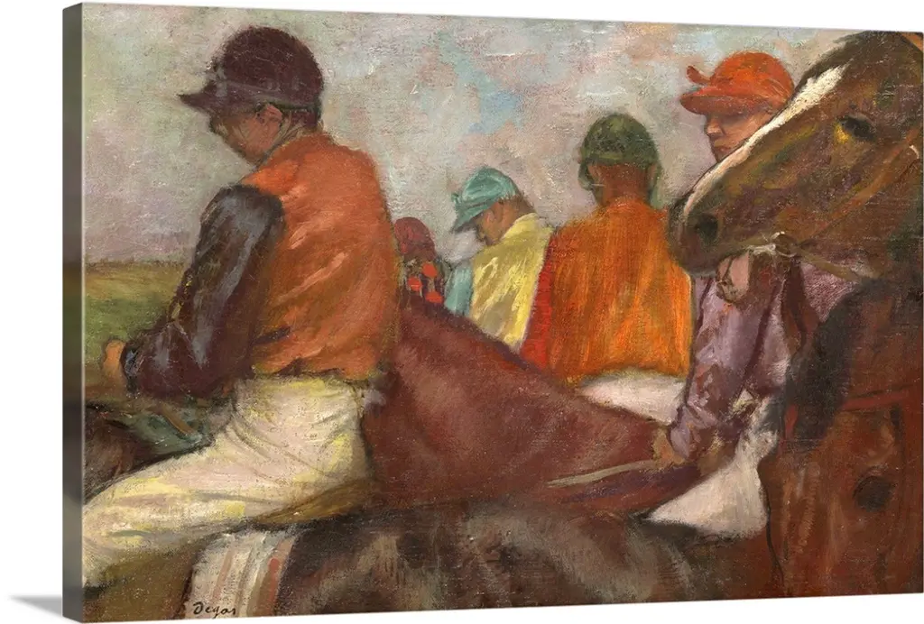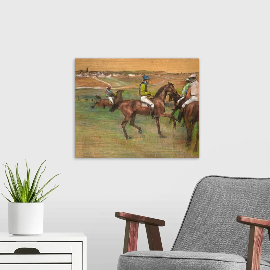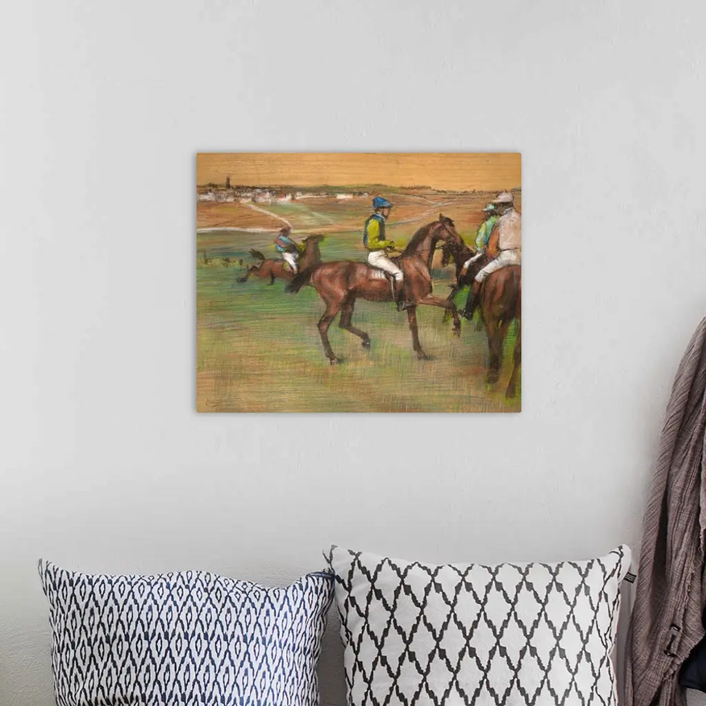 Degas undertook racing scenes throughout his career, characteristically manipulating his horses and jockeys from one picture to the next. All the figures here appear in earlier works, and some of the poses have pedigrees even more distinguished than the horses: the prancing mount and rider at the center derive from Benozzo Gozzoli's?Journey of the Magi?in the Palazzo Medici-Riccardi, Florence, which Degas had copied in 1859. This picture is nevertheless unusual for its medium-pastel on a plain, unvarnished panel. With skillful economy of means, Degas allowed the wood to color the sky and distant landscape, and to provide a warm undertone for the turf in the foreground.�