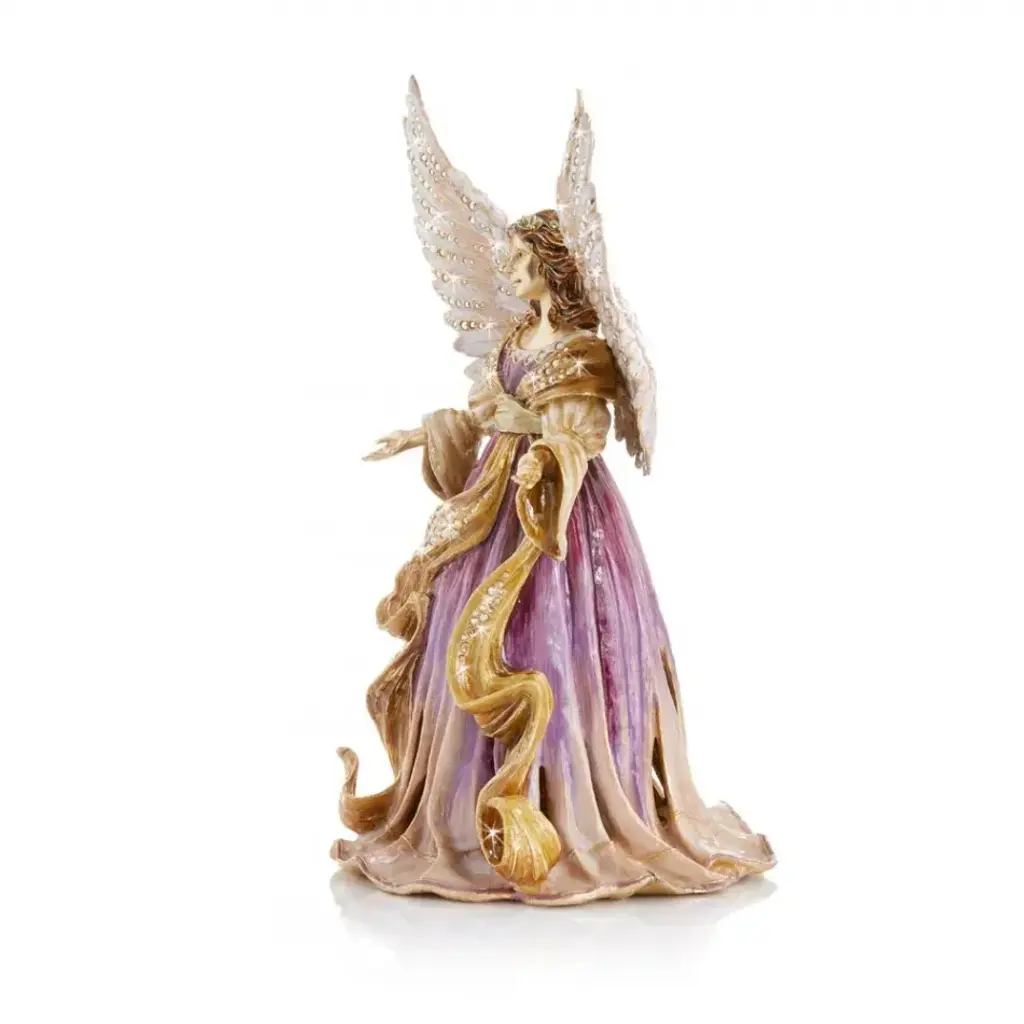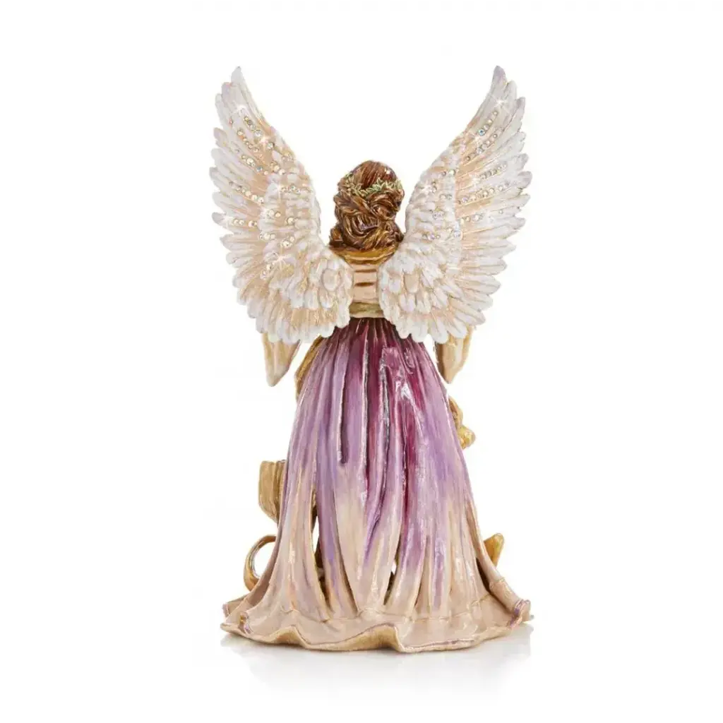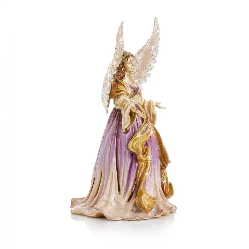 Introducing the Jay Strongwater Renaissance Angel Musical Figurine, a stunning piece of art that brings an aura of elegance and grace to any room. Not only is this figurine visually captivating, but it also plays a beautiful melody, adding a touch of enchantment to your space. The intricate design and attention to detail make it a perfect addition to any collector's display or as a cherished gift for someone special. Music box from Reuge S.A. in Switzerland plays "Angels We Have Heard on High".