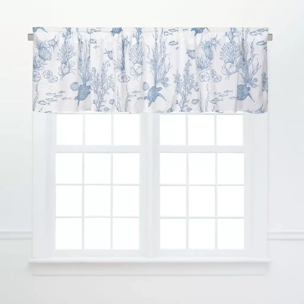 Sea life coastal home window curtain valance from my art.Size 52"w x 15" h. Entire product is made of a soft 100% poplin polyester fabric. Each window curtain has a pole pocket, approximately 2" wide at the top, has all edges hemmed for durability. We use eco friendly water based dyes that do not fade or alter the texture of the product during our special manufacturing process. Please contact me for custom size quotes. If you want your valance to be gathered, you would double the width size of the window for a quote. The curtain will be arrive in the exact siz