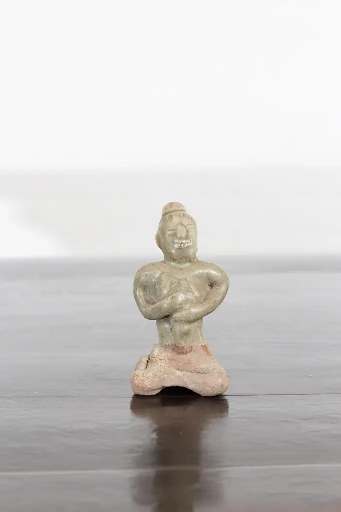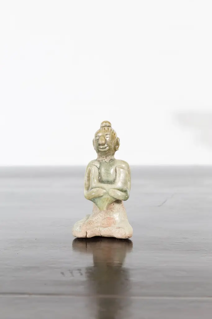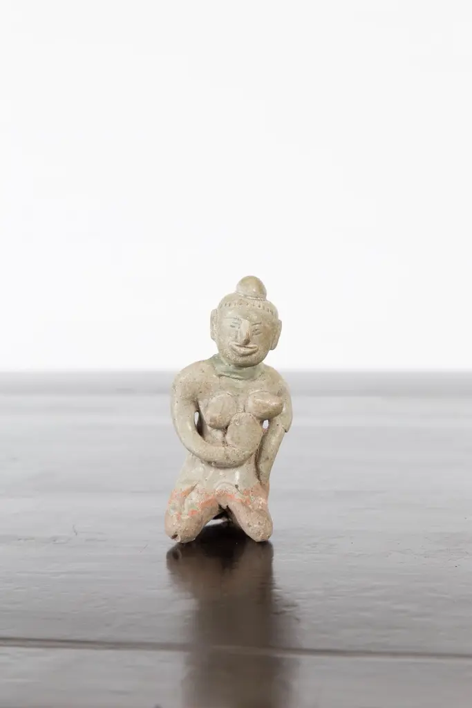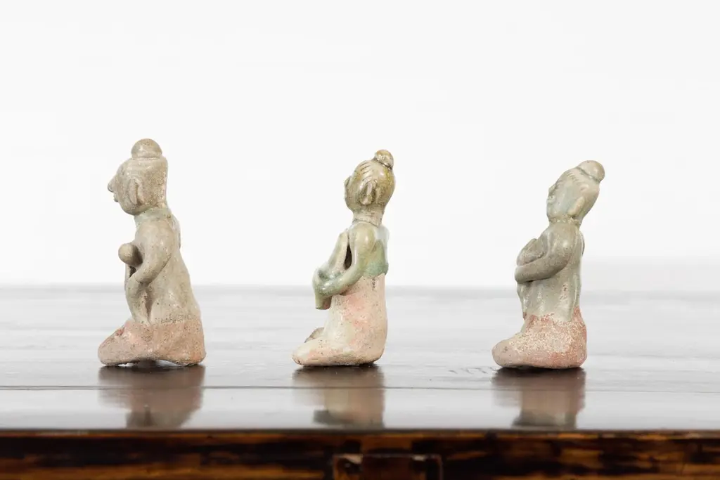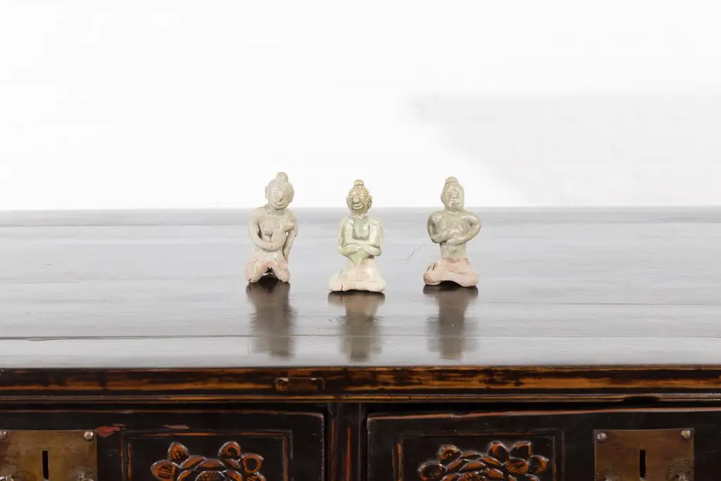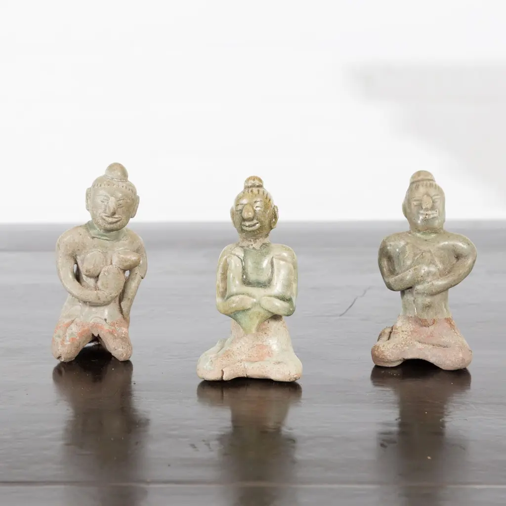 A set of three Thai ceramic fertility figures from the 14th or 15th century. Created in Thailand during the 14th or 15th century, this set of petite fertility figures, depicted bare chested, a bun adorning the top of their head and seated with their legs crossed, will make for an excellent decorative accentuation. The figures' heads were removed to guarantee fertility. We have several sets available made of assorted sizes and styles.
