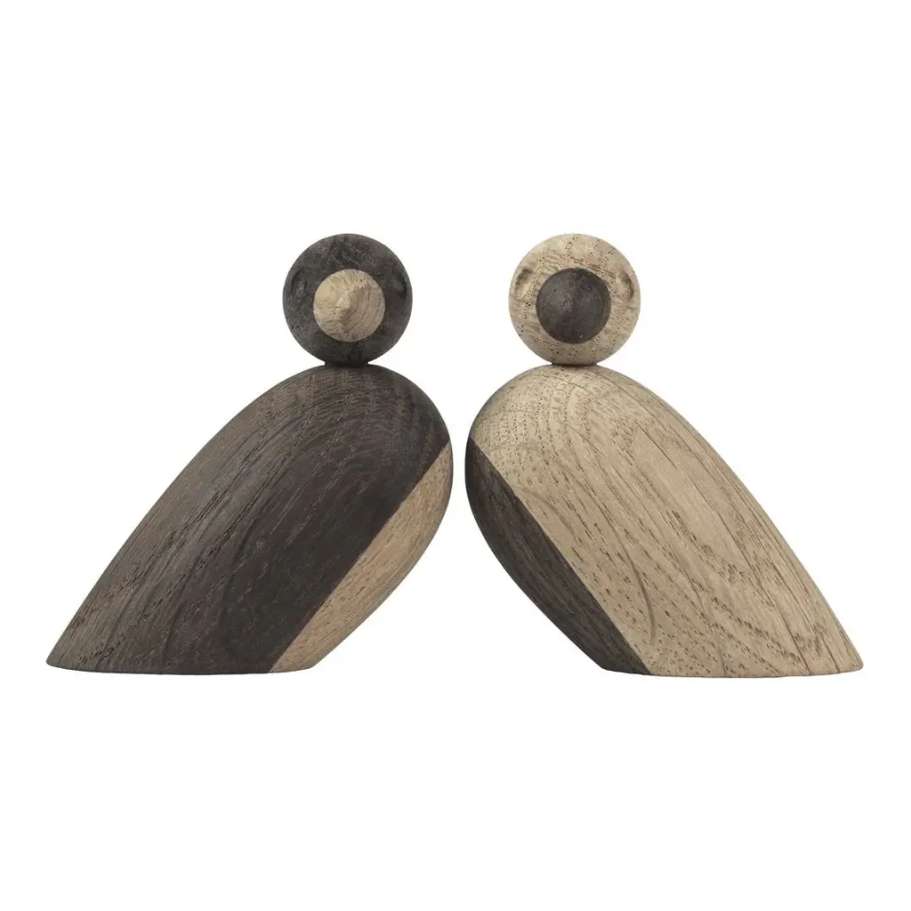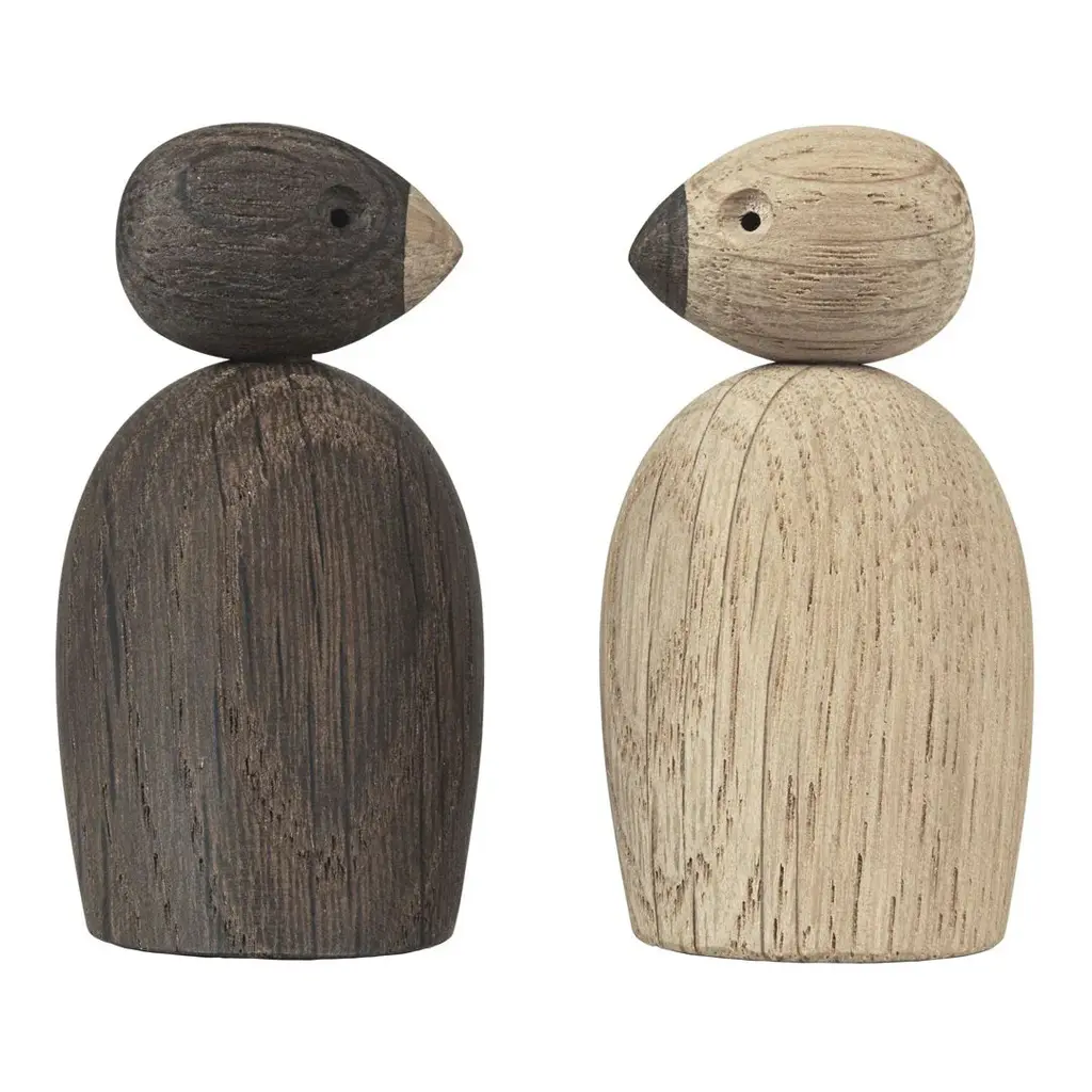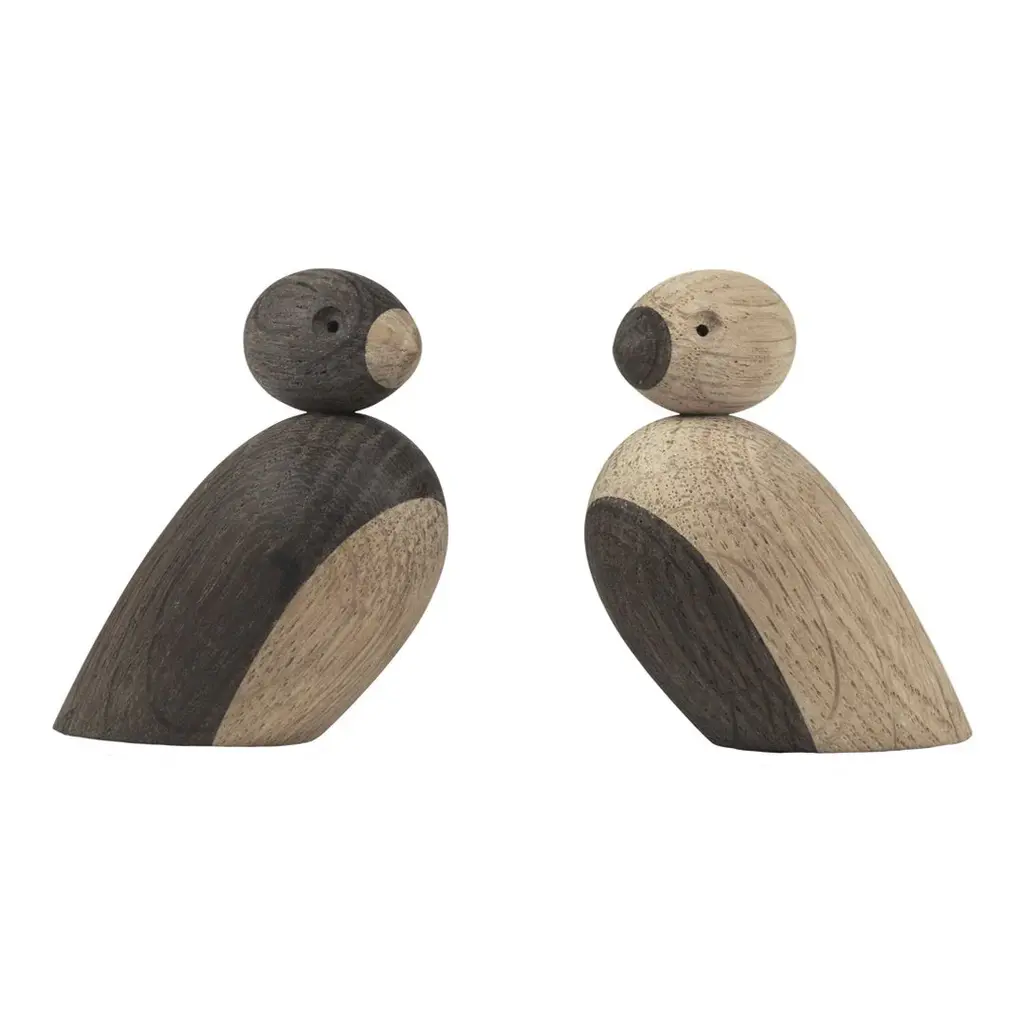 This pretty pair of sparrows was designed by Kay Bojesen and is made of natural oak and smoked oak. The two sparrows are 2.4" tall and have a magnet inside so they can be placed on a plank with other sparrows.